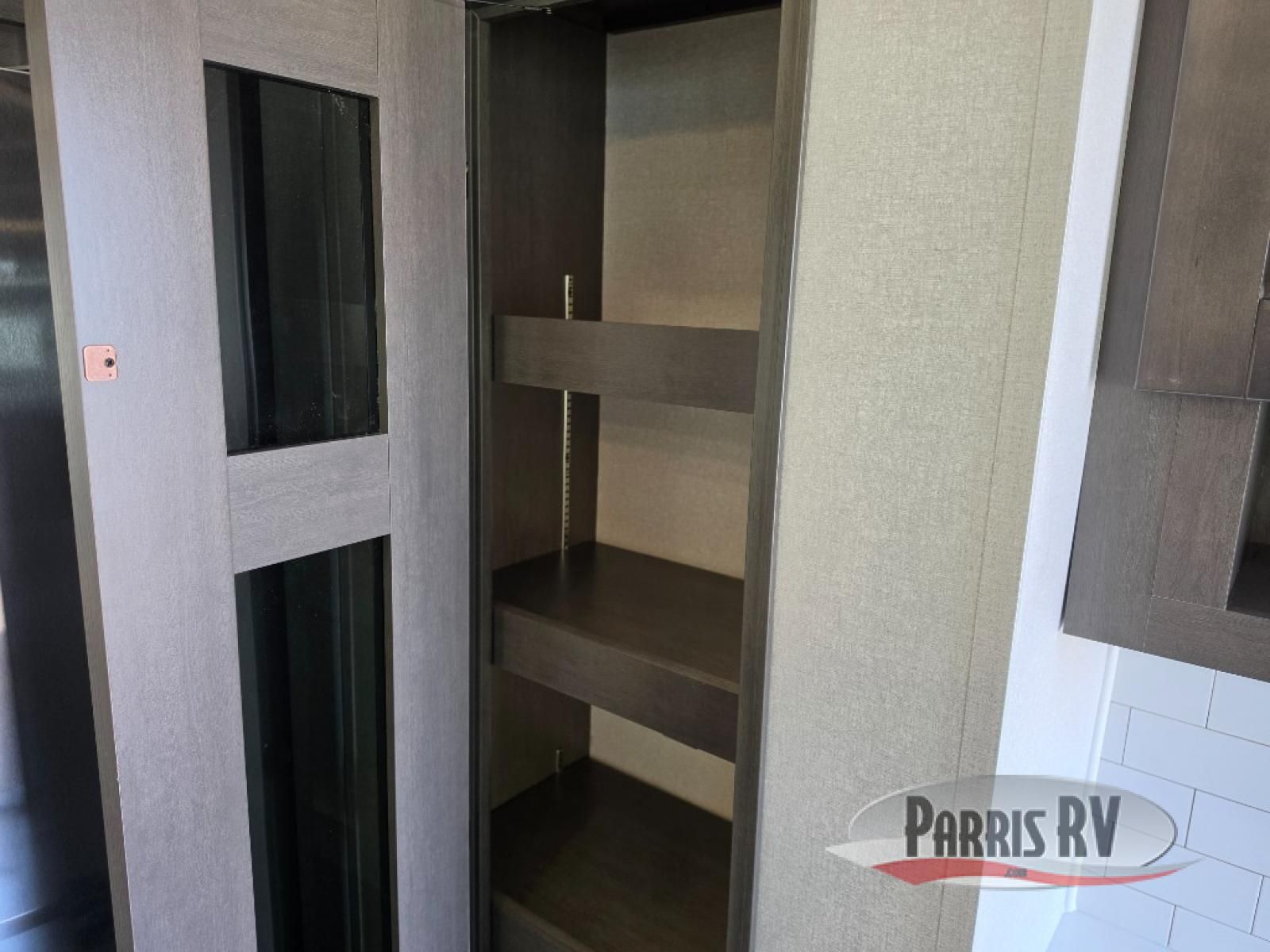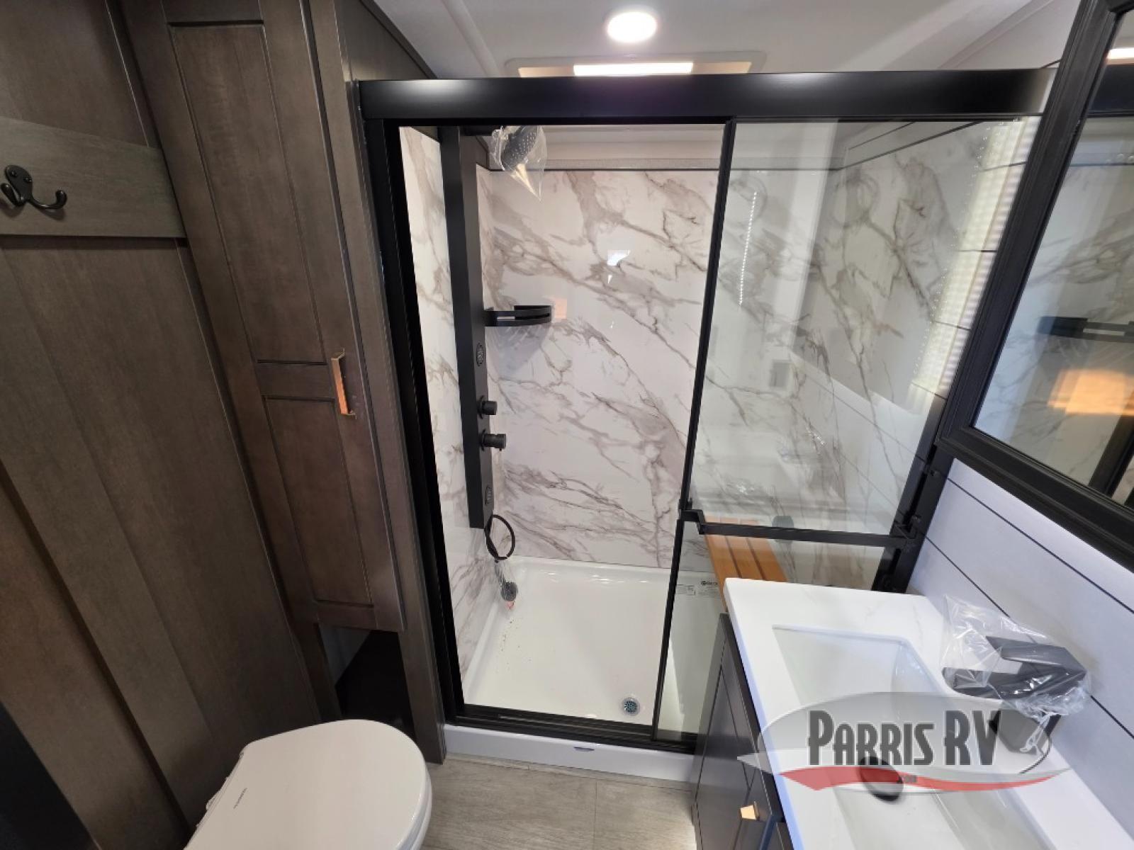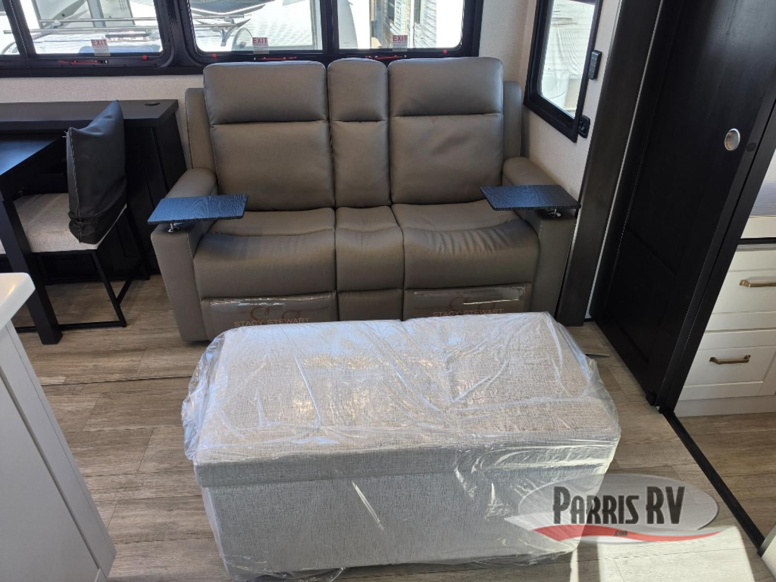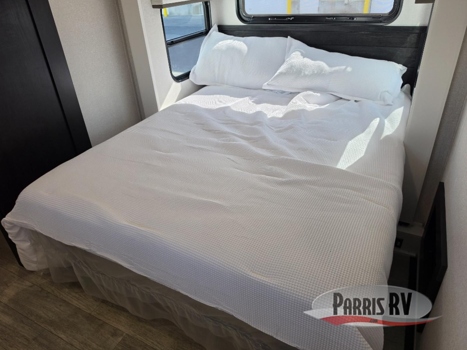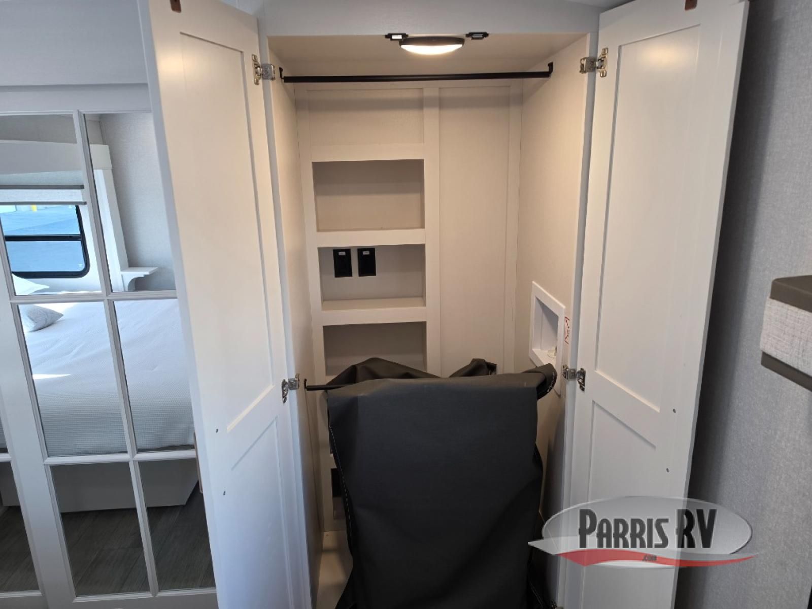 At the front of the 40DB fifth wheel, you'll find the inviting front bedroom featuring a spacious 72" x 80" king bed, perfect for a restful night's sleep. This room also includes a wardrobe and a flip-up dresser with a TV above, providing plenty of storage for clothing and essentials. Moving down the hall, one of two full bathrooms offers a 36" x 48" shower with a built-in seat for added accessibility, along with linen shelves for extra storage. At the center of the trailer, the main living area opens up with dual opposing slides for maximum comfort and room to move. One slide houses a 21-cu. ft. residential refrigerator and a 30" space-saving convection microwave with a built-in air fryer, while the central kitchen island includes a sink and pull-out cutting board, everything you need to prepare meals on the go. Across the way, the opposite slide features a roll-out table and theater seating, creating the perfect space to dine and relax after a long day. At the rear, the second bedroom includes a 60" x 80" queen bed in a slide-out with two wardrobes opposite for ample storage, plus a private full bathroom complete with a tub/shower combo and its own exterior exit for added convenience. Above it all, the loft provides three 30" x 80" bed mats and a loft cabinet, offering extra-sleeping space or additional storage for the whole family's adventures.
