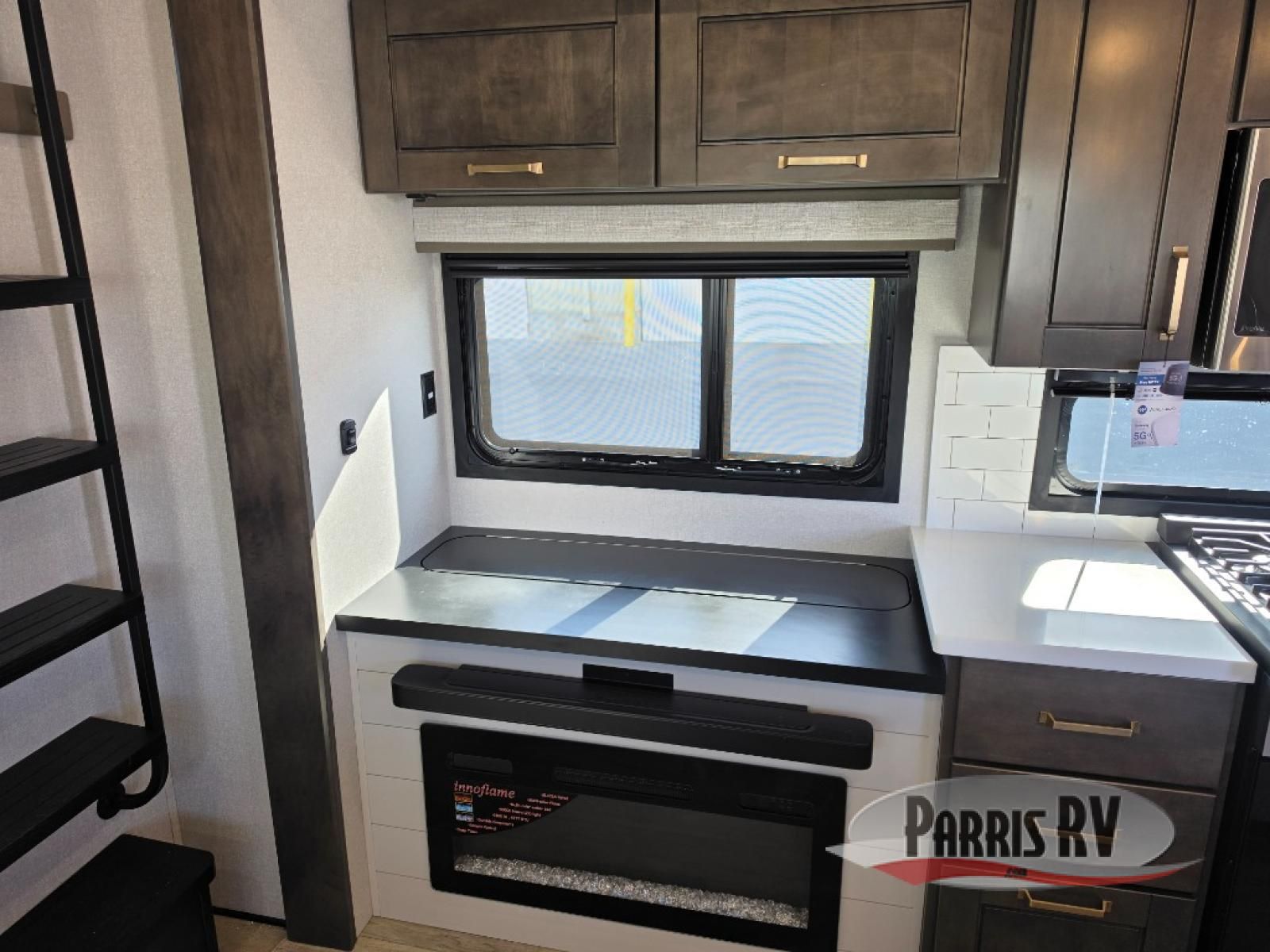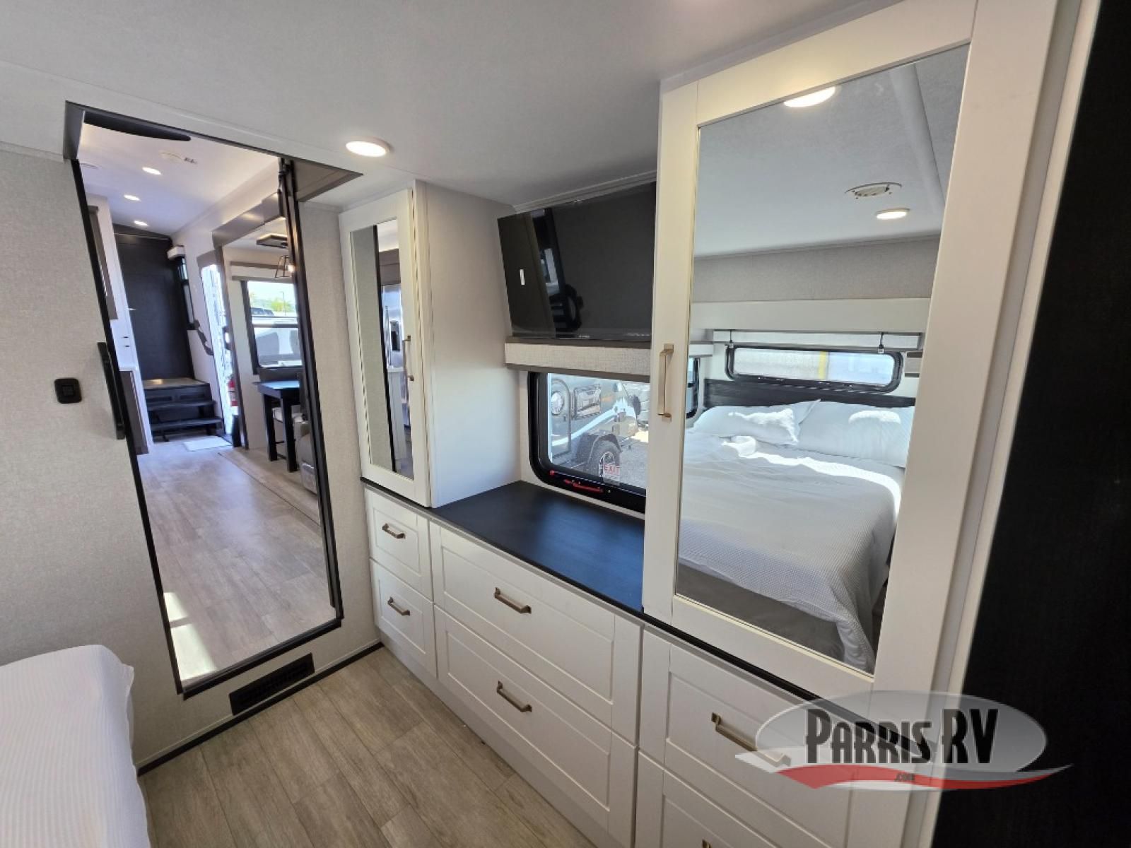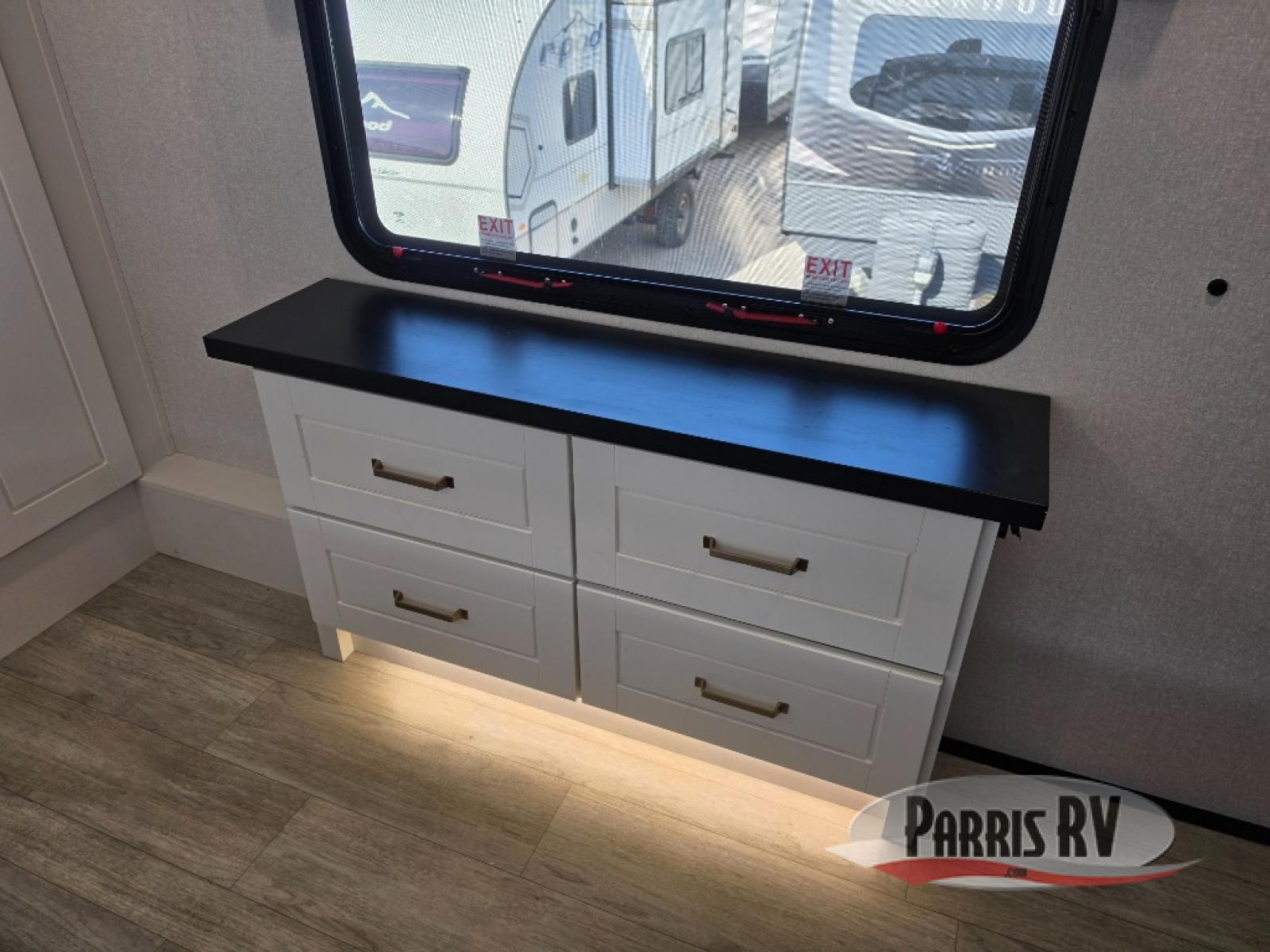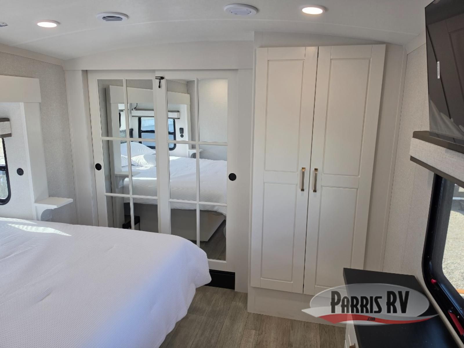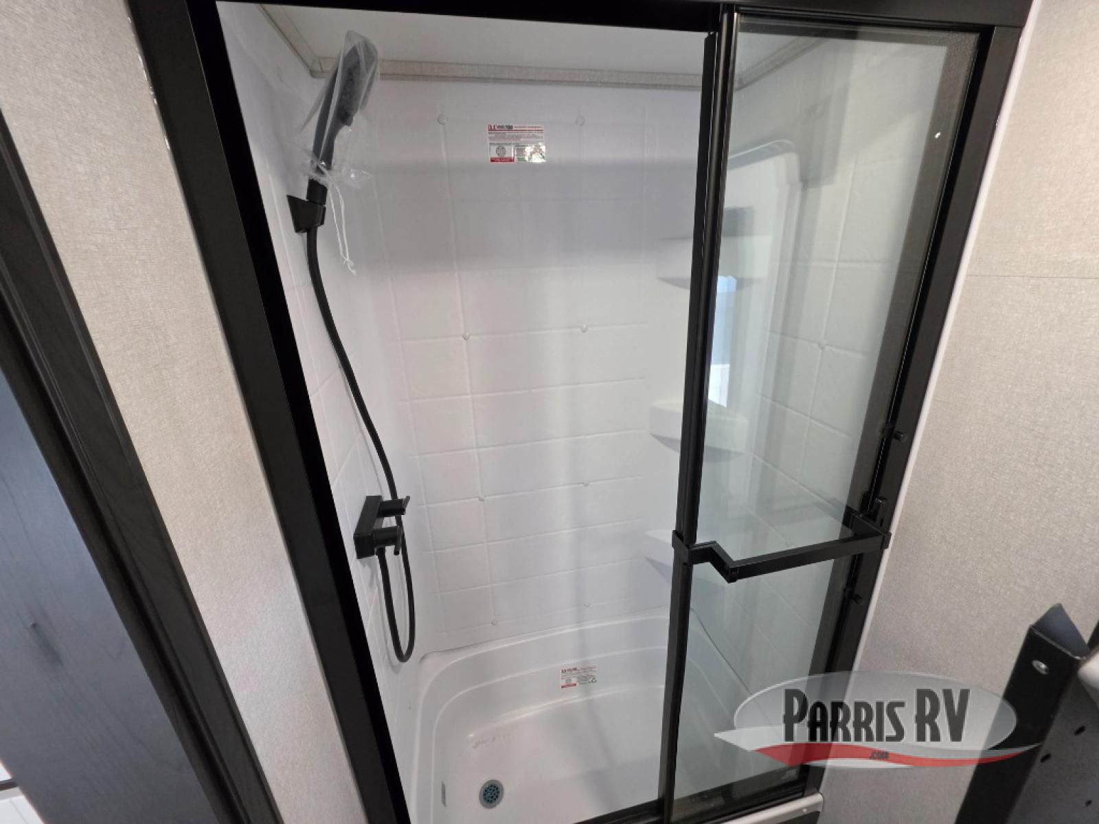 At the front of the 40DB fifth wheel, you'll find the inviting front bedroom featuring a spacious 72" x 80" king bed, perfect for a restful night's sleep. This room also includes a wardrobe and a flip-up dresser with a TV above, providing plenty of storage for clothing and essentials. Moving down the hall, one of two full bathrooms offers a 36" x 48" shower with a built-in seat for added accessibility, along with linen shelves for extra storage. At the center of the trailer, the main living area opens up with dual opposing slides for maximum comfort and room to move. One slide houses a 21-cu. ft. residential refrigerator and a 30" space-saving convection microwave with a built-in air fryer, while the central kitchen island includes a sink and pull-out cutting board, everything you need to prepare meals on the go. Across the way, the opposite slide features a roll-out table and theater seating, creating the perfect space to dine and relax after a long day. At the rear, the second bedroom includes a 60" x 80" queen bed in a slide-out with two wardrobes opposite for ample storage, plus a private full bathroom complete with a tub/shower combo and its own exterior exit for added convenience. Above it all, the loft provides three 30" x 80" bed mats and a loft cabinet, offering extra-sleeping space or additional storage for the whole family's adventures.