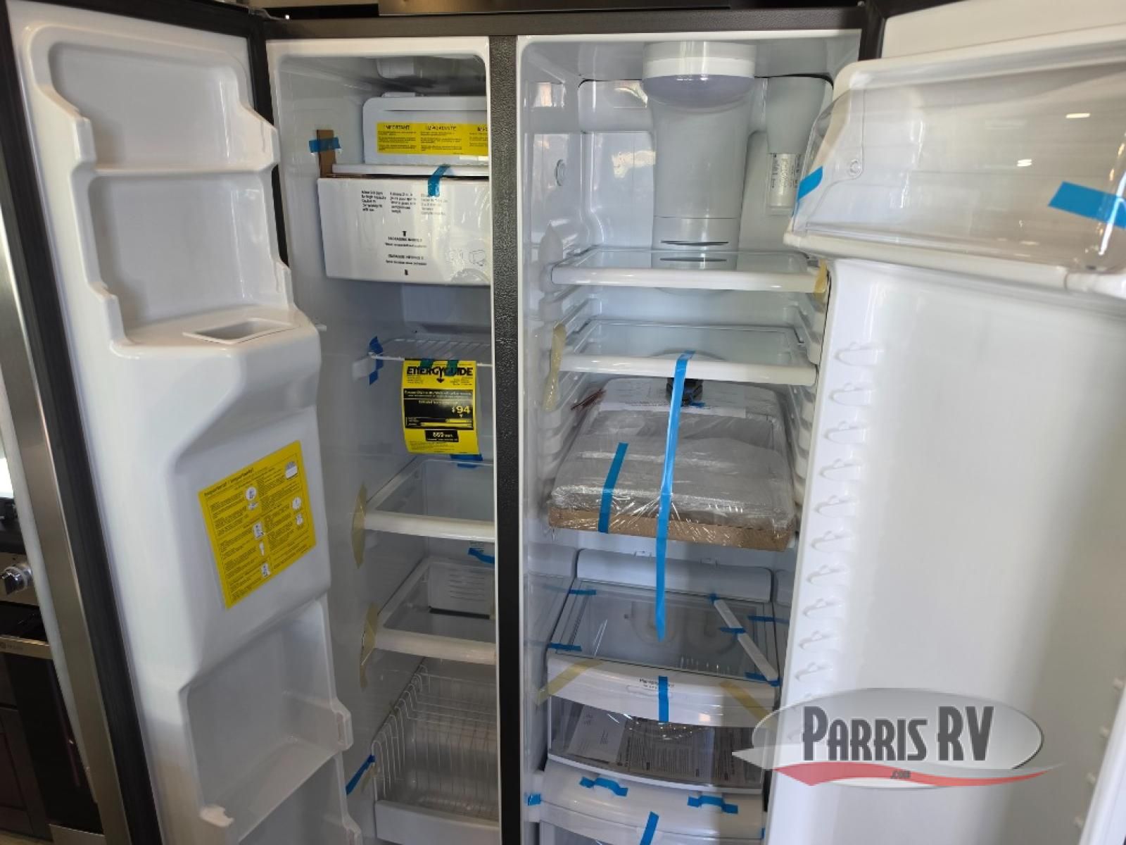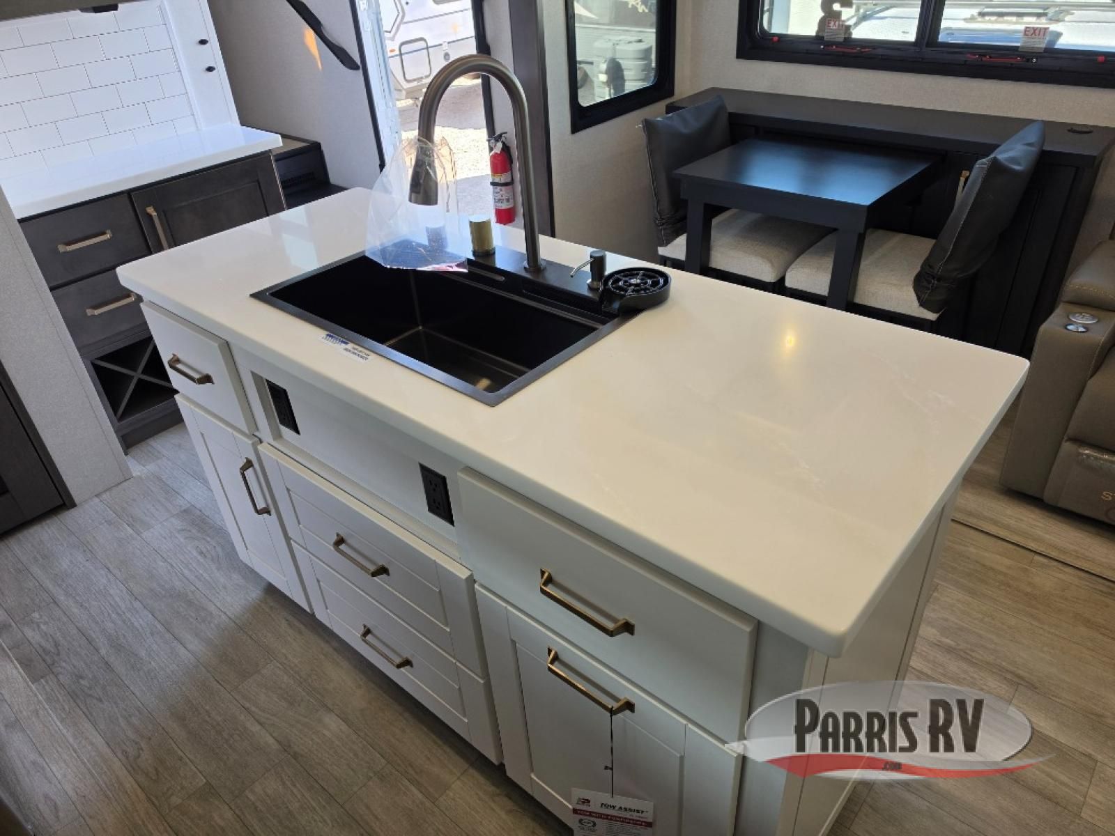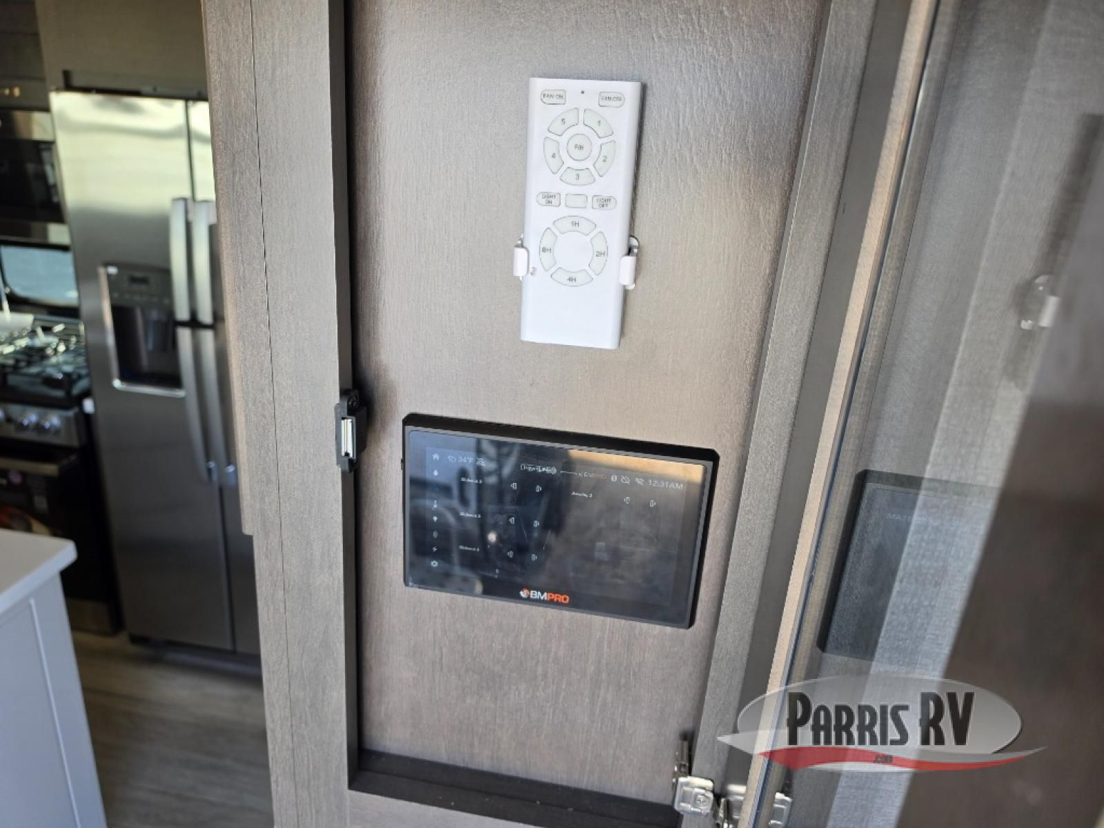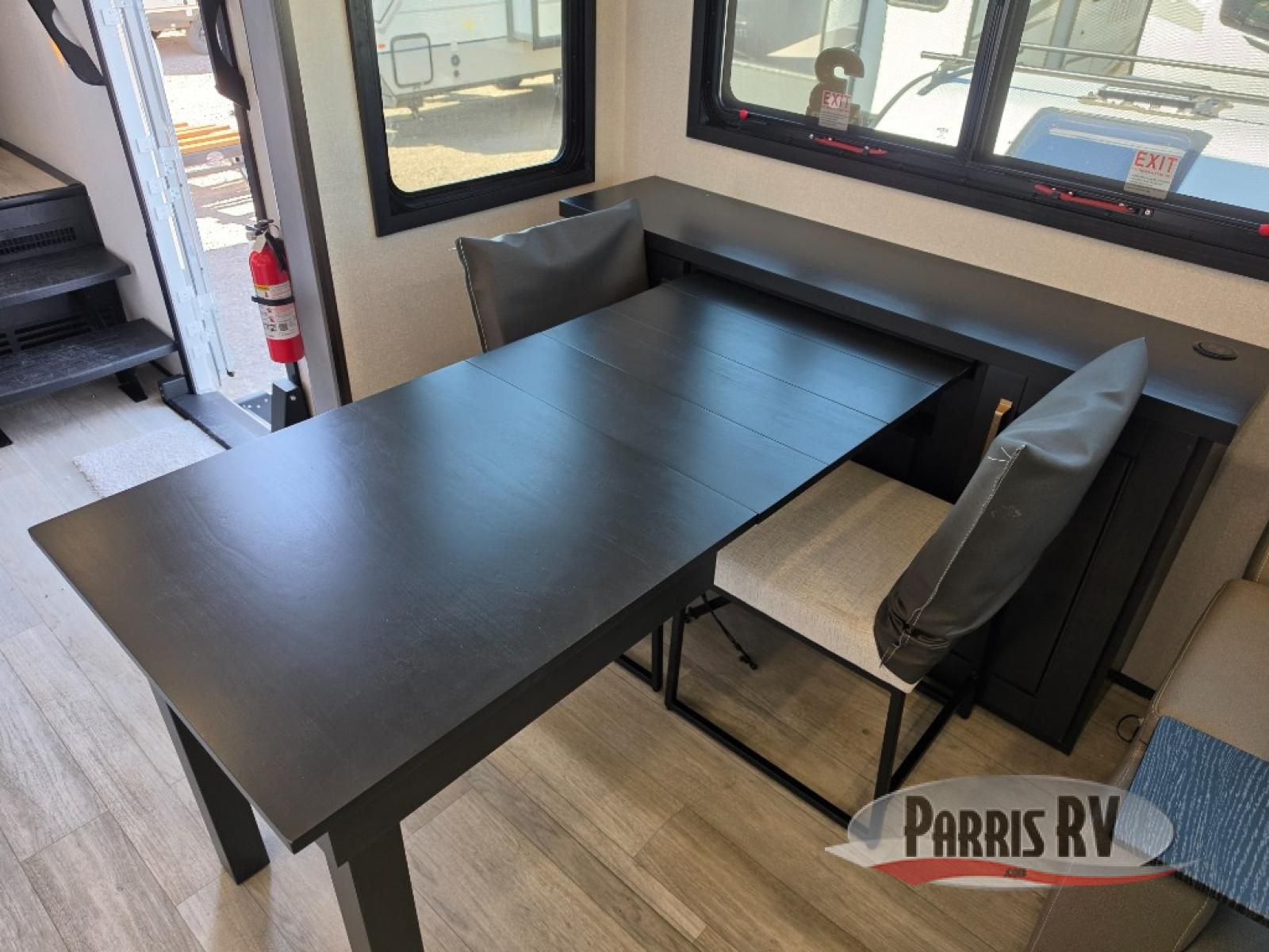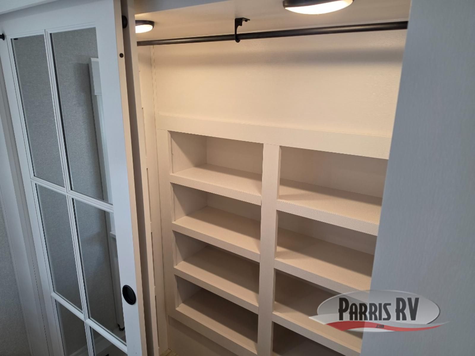 At the front of the 40DB fifth wheel, you'll find the inviting front bedroom featuring a spacious 72" x 80" king bed, perfect for a restful night's sleep. This room also includes a wardrobe and a flip-up dresser with a TV above, providing plenty of storage for clothing and essentials. Moving down the hall, one of two full bathrooms offers a 36" x 48" shower with a built-in seat for added accessibility, along with linen shelves for extra storage. At the center of the trailer, the main living area opens up with dual opposing slides for maximum comfort and room to move. One slide houses a 21-cu. ft. residential refrigerator and a 30" space-saving convection microwave with a built-in air fryer, while the central kitchen island includes a sink and pull-out cutting board, everything you need to prepare meals on the go. Across the way, the opposite slide features a roll-out table and theater seating, creating the perfect space to dine and relax after a long day. At the rear, the second bedroom includes a 60" x 80" queen bed in a slide-out with two wardrobes opposite for ample storage, plus a private full bathroom complete with a tub/shower combo and its own exterior exit for added convenience. Above it all, the loft provides three 30" x 80" bed mats and a loft cabinet, offering extra-sleeping space or additional storage for the whole family's adventures.