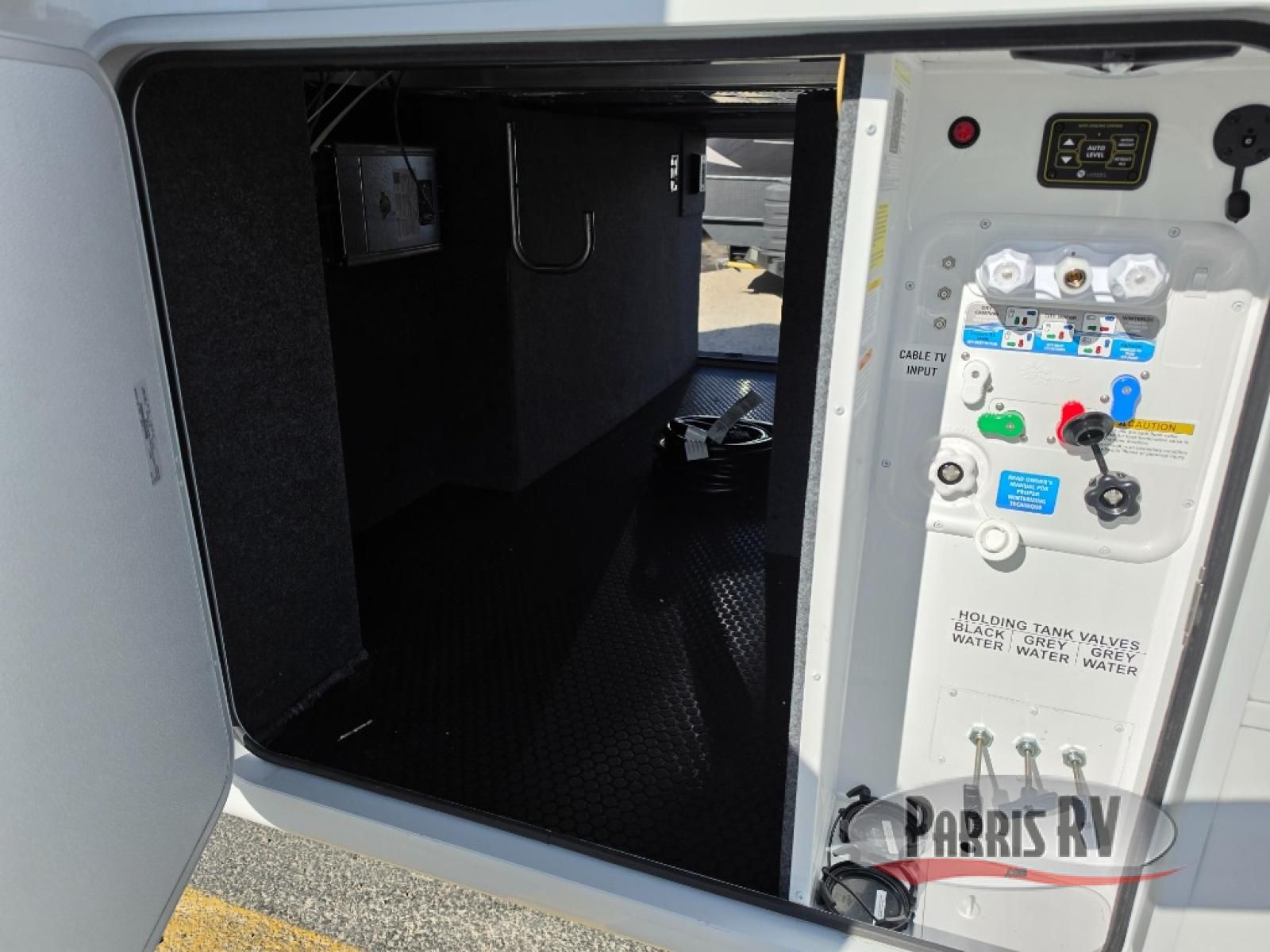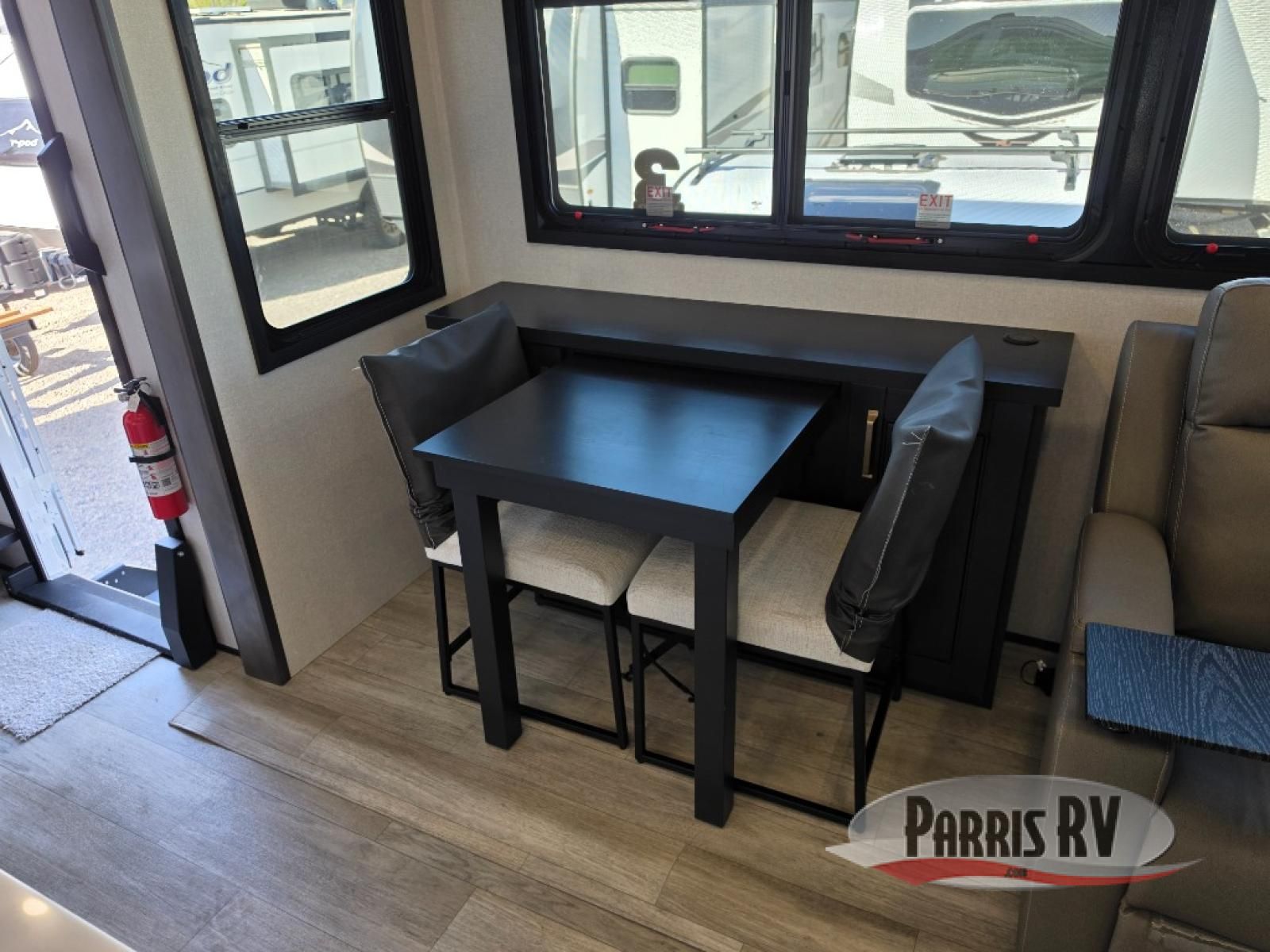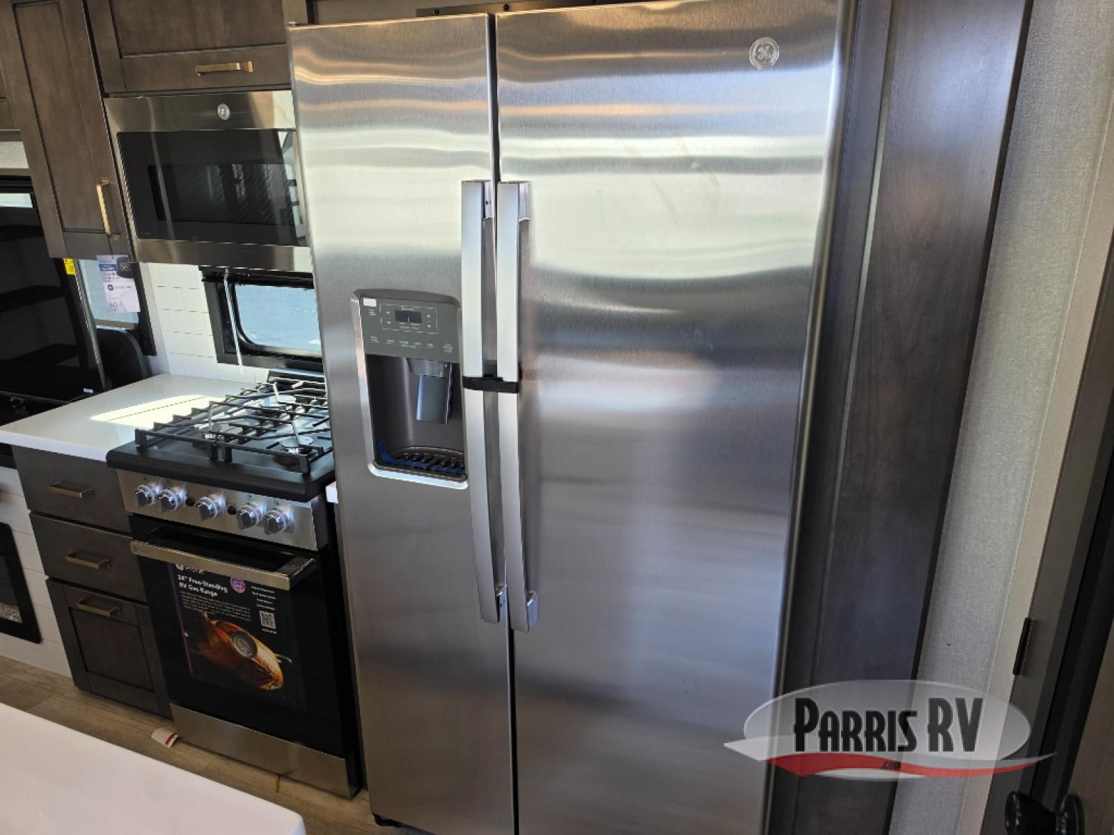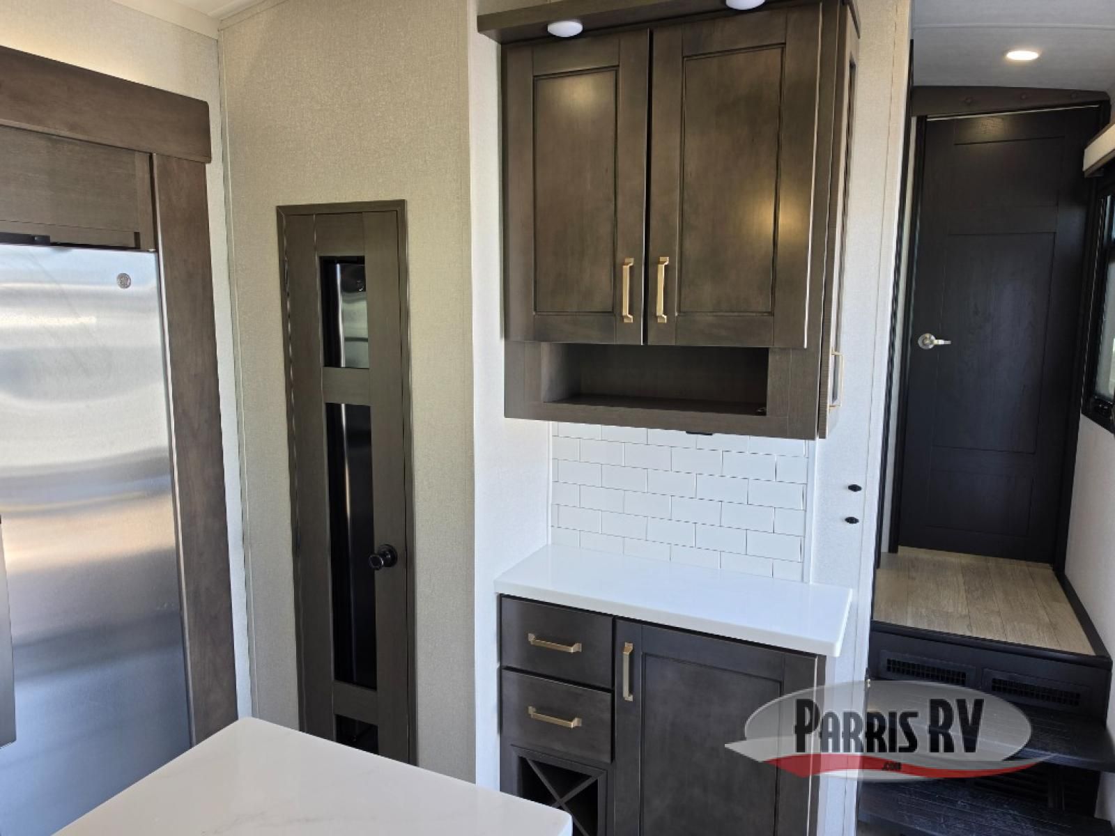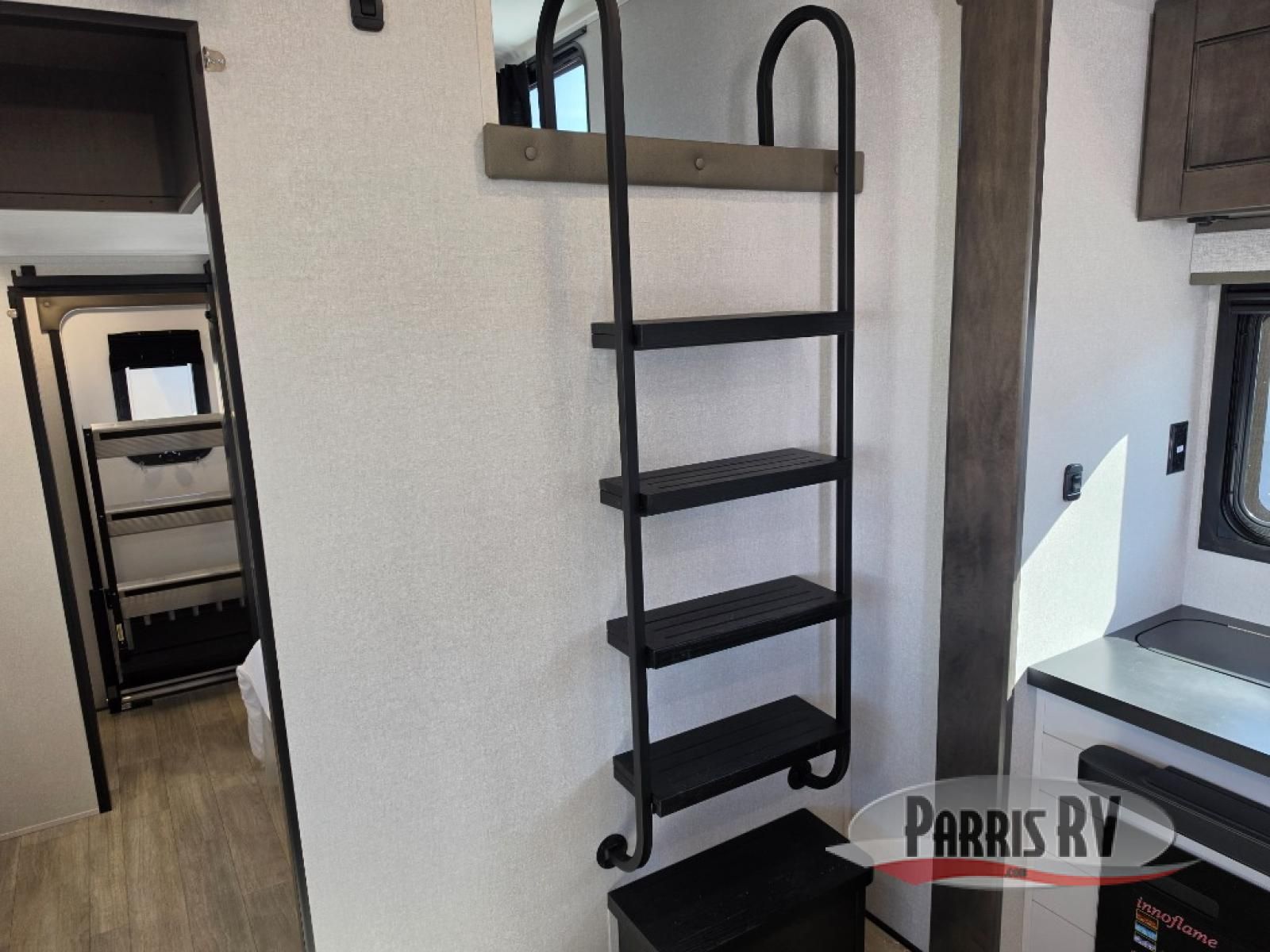 At the front of the 40DB fifth wheel, you'll find the inviting front bedroom featuring a spacious 72" x 80" king bed, perfect for a restful night's sleep. This room also includes a wardrobe and a flip-up dresser with a TV above, providing plenty of storage for clothing and essentials. Moving down the hall, one of two full bathrooms offers a 36" x 48" shower with a built-in seat for added accessibility, along with linen shelves for extra storage. At the center of the trailer, the main living area opens up with dual opposing slides for maximum comfort and room to move. One slide houses a 21-cu. ft. residential refrigerator and a 30" space-saving convection microwave with a built-in air fryer, while the central kitchen island includes a sink and pull-out cutting board, everything you need to prepare meals on the go. Across the way, the opposite slide features a roll-out table and theater seating, creating the perfect space to dine and relax after a long day. At the rear, the second bedroom includes a 60" x 80" queen bed in a slide-out with two wardrobes opposite for ample storage, plus a private full bathroom complete with a tub/shower combo and its own exterior exit for added convenience. Above it all, the loft provides three 30" x 80" bed mats and a loft cabinet, offering extra-sleeping space or additional storage for the whole family's adventures.