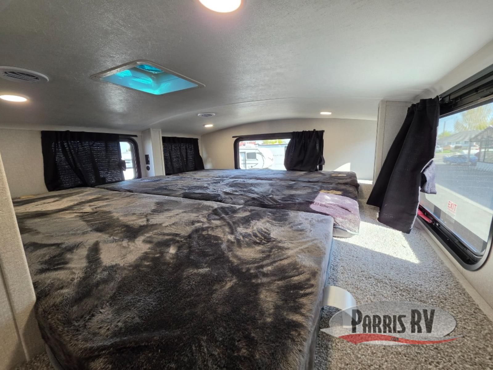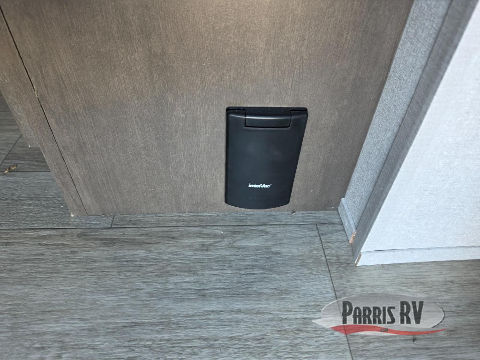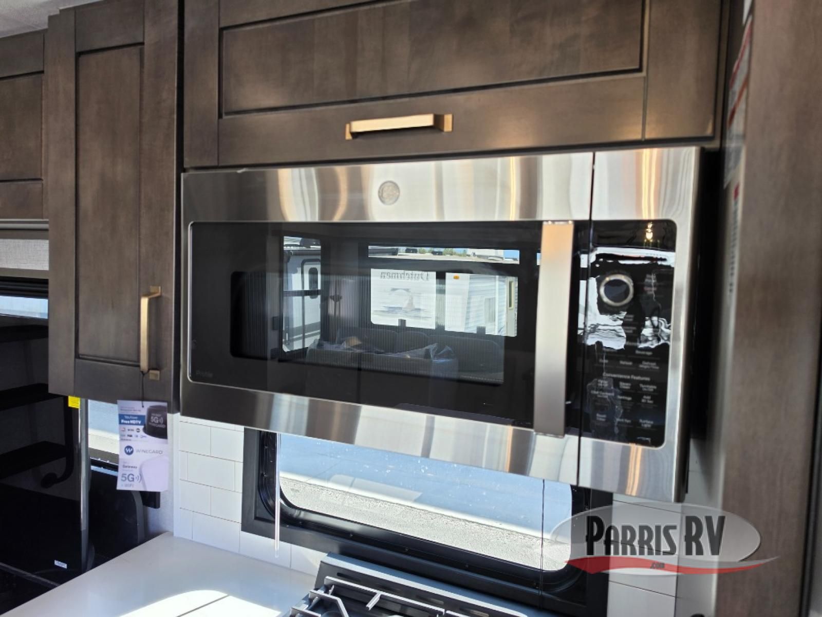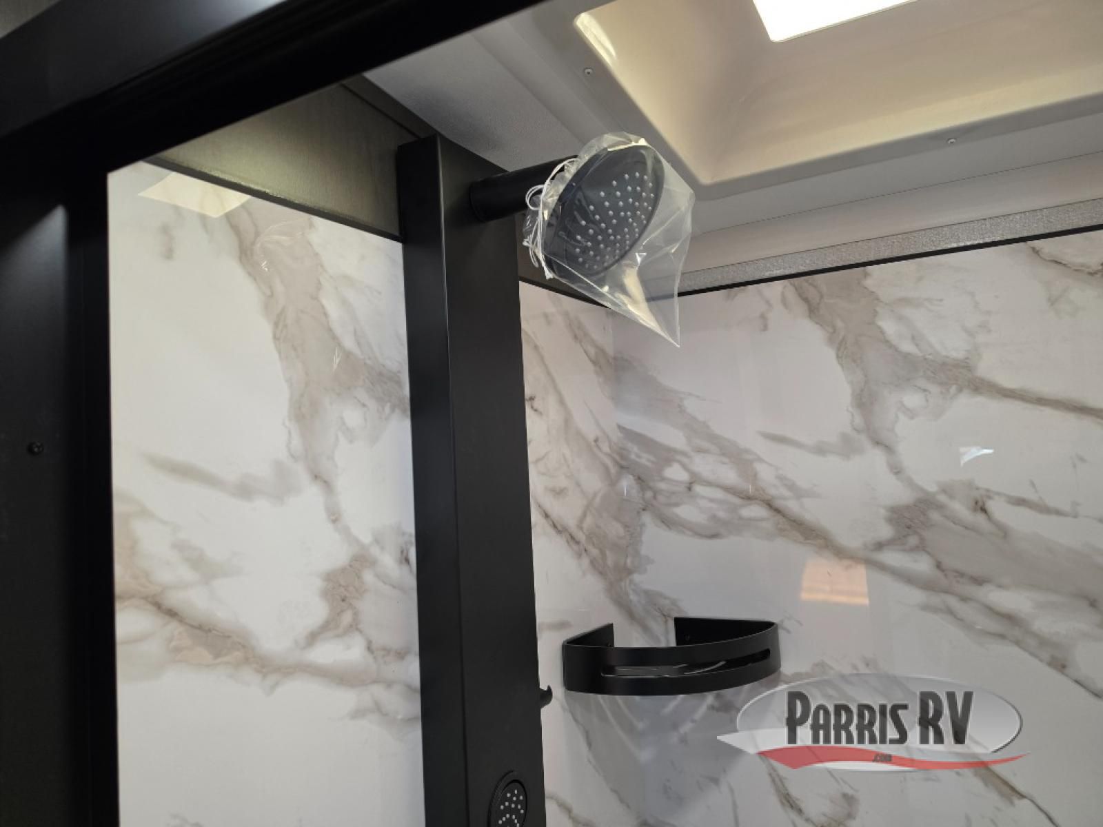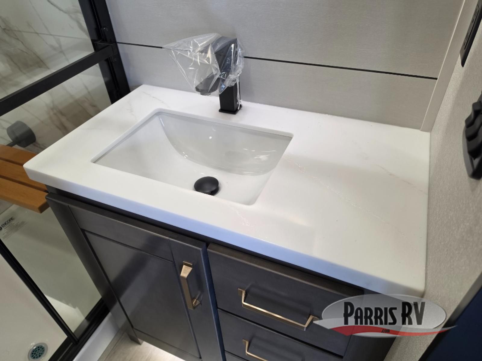 At the front of the 40DB fifth wheel, you'll find the inviting front bedroom featuring a spacious 72" x 80" king bed, perfect for a restful night's sleep. This room also includes a wardrobe and a flip-up dresser with a TV above, providing plenty of storage for clothing and essentials. Moving down the hall, one of two full bathrooms offers a 36" x 48" shower with a built-in seat for added accessibility, along with linen shelves for extra storage. At the center of the trailer, the main living area opens up with dual opposing slides for maximum comfort and room to move. One slide houses a 21-cu. ft. residential refrigerator and a 30" space-saving convection microwave with a built-in air fryer, while the central kitchen island includes a sink and pull-out cutting board, everything you need to prepare meals on the go. Across the way, the opposite slide features a roll-out table and theater seating, creating the perfect space to dine and relax after a long day. At the rear, the second bedroom includes a 60" x 80" queen bed in a slide-out with two wardrobes opposite for ample storage, plus a private full bathroom complete with a tub/shower combo and its own exterior exit for added convenience. Above it all, the loft provides three 30" x 80" bed mats and a loft cabinet, offering extra-sleeping space or additional storage for the whole family's adventures.