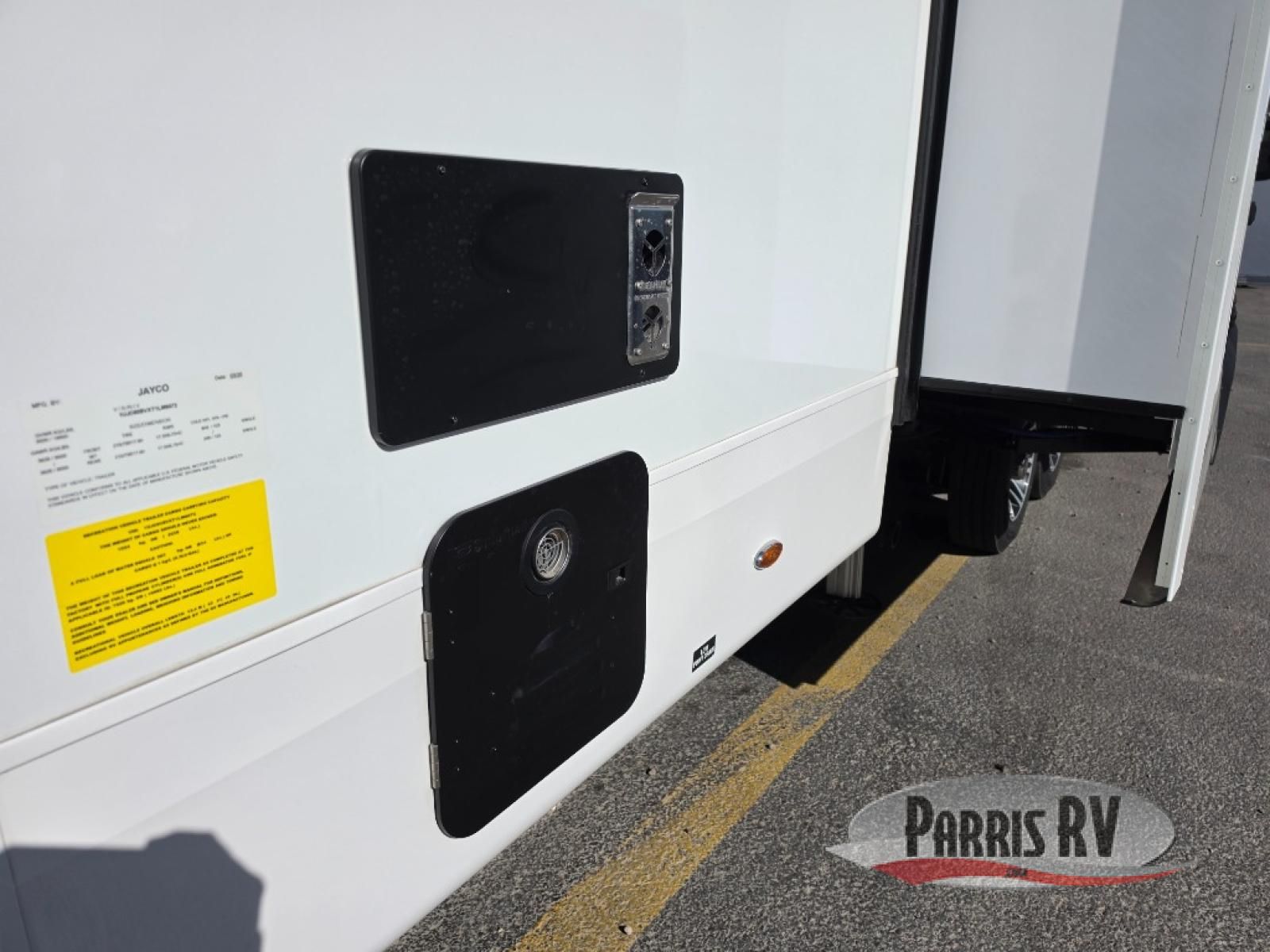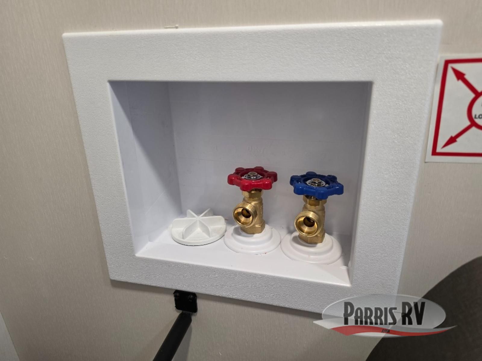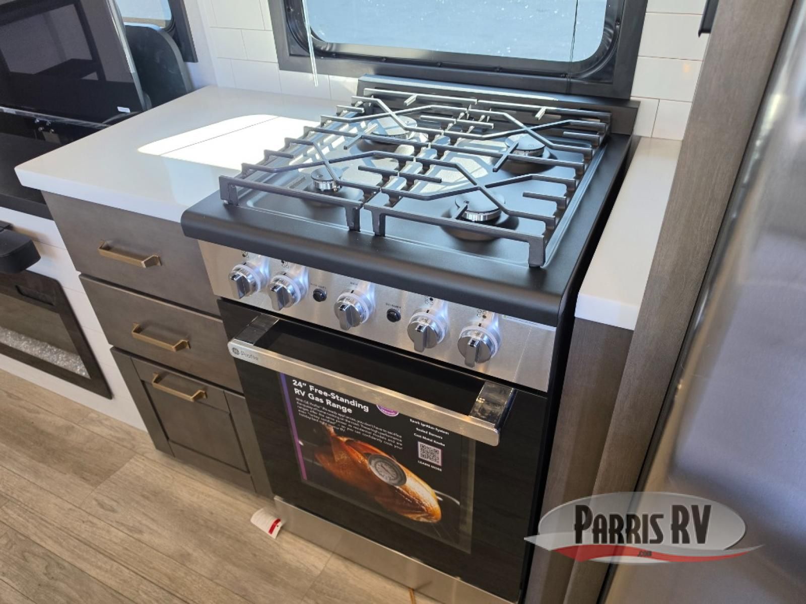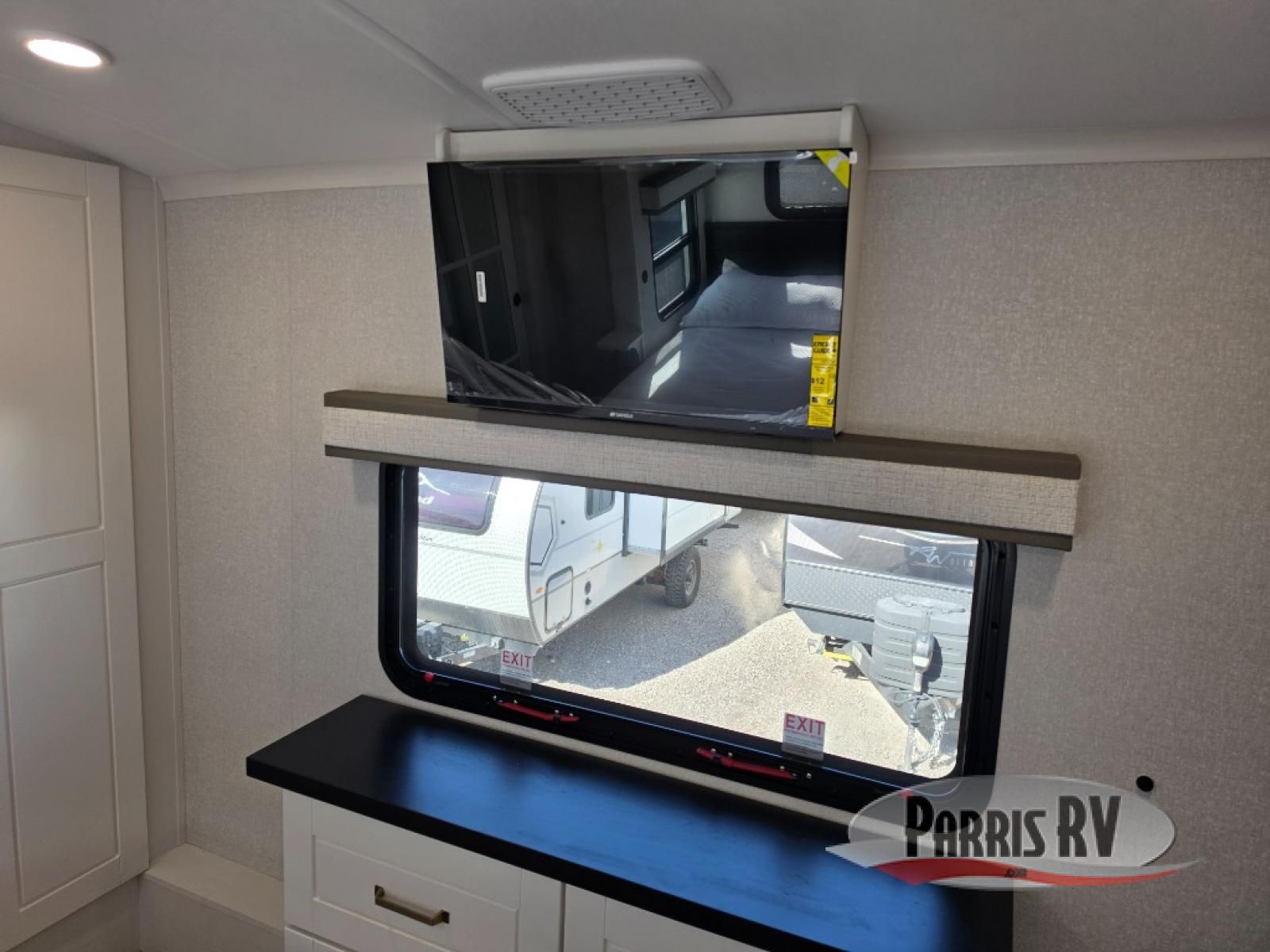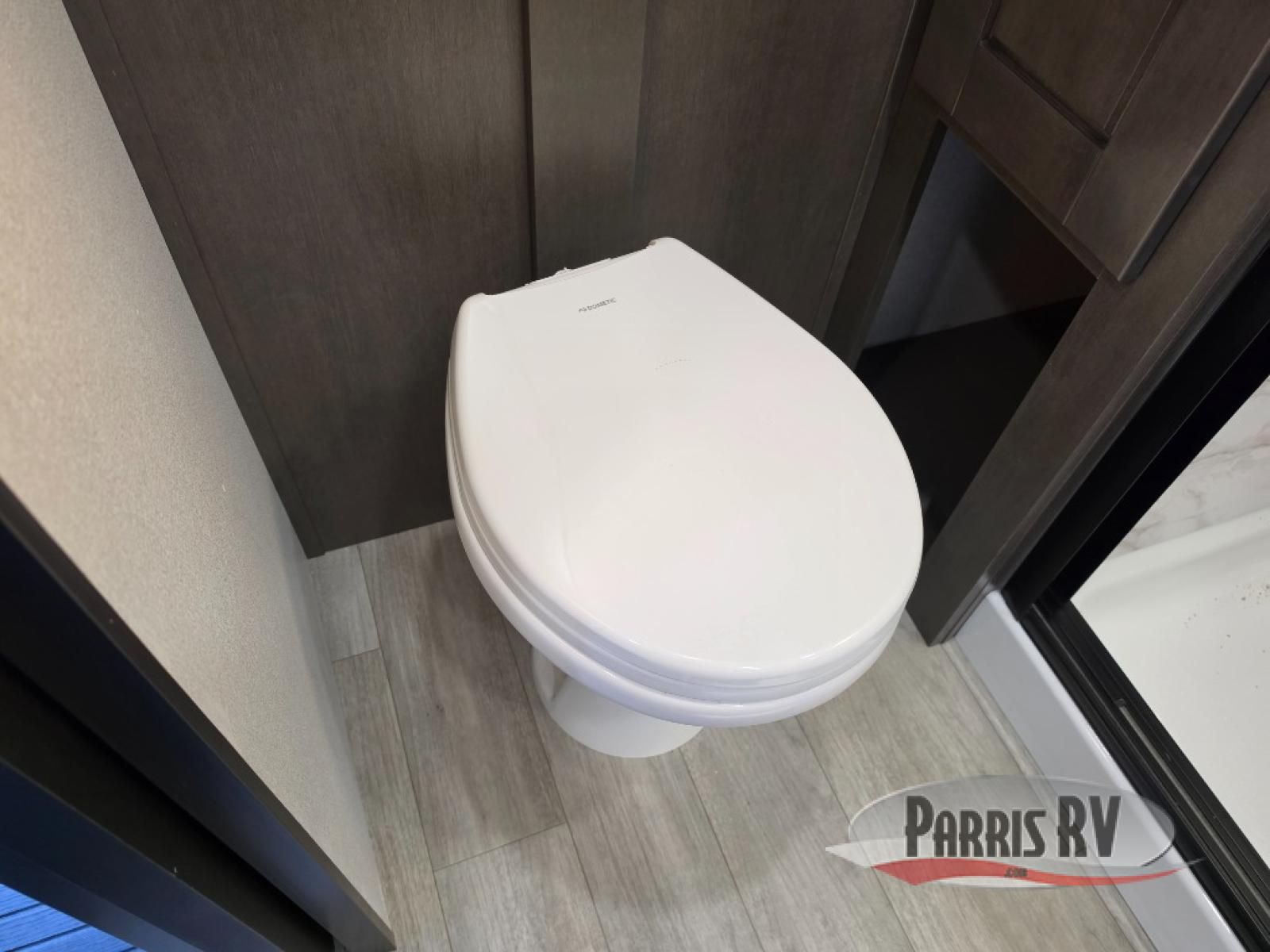 At the front of the 40DB fifth wheel, you'll find the inviting front bedroom featuring a spacious 72" x 80" king bed, perfect for a restful night's sleep. This room also includes a wardrobe and a flip-up dresser with a TV above, providing plenty of storage for clothing and essentials. Moving down the hall, one of two full bathrooms offers a 36" x 48" shower with a built-in seat for added accessibility, along with linen shelves for extra storage. At the center of the trailer, the main living area opens up with dual opposing slides for maximum comfort and room to move. One slide houses a 21-cu. ft. residential refrigerator and a 30" space-saving convection microwave with a built-in air fryer, while the central kitchen island includes a sink and pull-out cutting board, everything you need to prepare meals on the go. Across the way, the opposite slide features a roll-out table and theater seating, creating the perfect space to dine and relax after a long day. At the rear, the second bedroom includes a 60" x 80" queen bed in a slide-out with two wardrobes opposite for ample storage, plus a private full bathroom complete with a tub/shower combo and its own exterior exit for added convenience. Above it all, the loft provides three 30" x 80" bed mats and a loft cabinet, offering extra-sleeping space or additional storage for the whole family's adventures.
