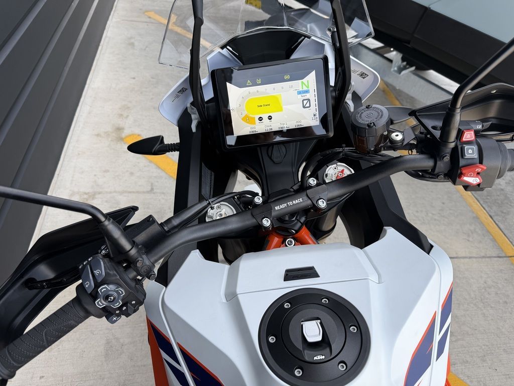 Taking charge at the helm is a scratch-resistant 7-inch TFT display. Unmatched in terms of graphics and readability, adventurers can access information on the fly, quickly and easily without navigating complex menus. This comes thanks to a 6-way switch cube on the handlebar and the quick select and favorites buttons. Connectivity is also taken care of by way of KTMconnect, which connects via Bluetooth for Turn-by-Turn+ navigation, music, and even answering calls. Still catching glare? The TFT screen is tilt-angle adjustable.