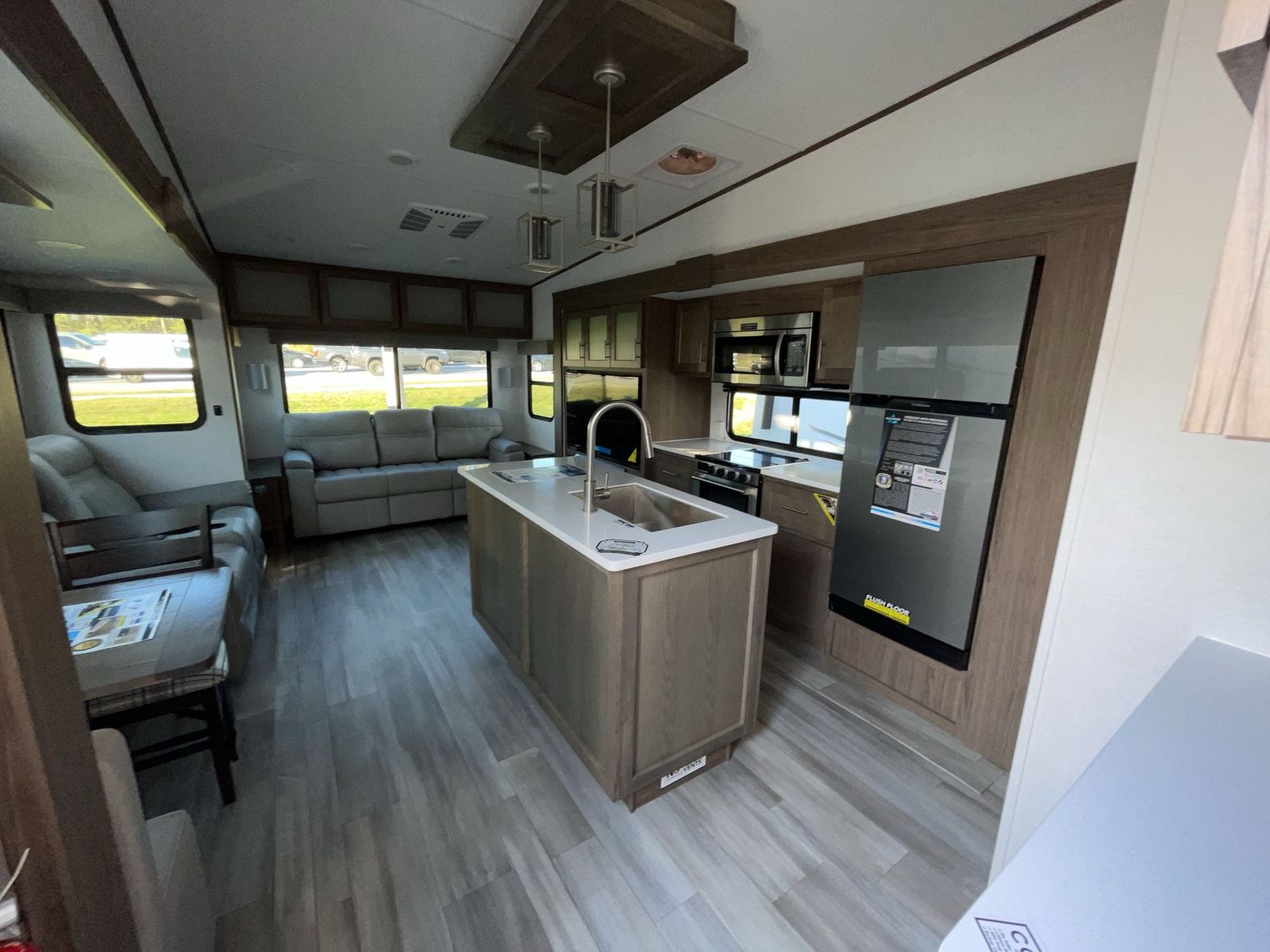 For the couple that enjoys adventures, this rear living coach has everything you need to travel comfortably and take along a couple of friends! The front private bedroom has a queen bed with nightstands on either side for your personal belongings, and a wardrobe to keep your clothes looking nice. Freshen up each morning in the full bathroom with a 30" x 36" shower, and grab a towel stored close by in the linen closet. Now that you're ready for the day, you can head to the kitchen and create a hearty breakfast with the full kitchen amenities. You will appreciate having a 10 cu. ft. 12V refrigerator and three burner cooktop, plus there is a center island with plenty of counter space and a sink to make food prep even easier. Spend your evenings in true relaxation in the dual recliner theater seats across from the swing mount 50" HDTV with hidden storage behind. You will also love the pantry and hutch in the kitchen area for storing all of your dishes and non-perishables. Dine at the floating table with two chairs along with a moveable ottoman featuring storage.