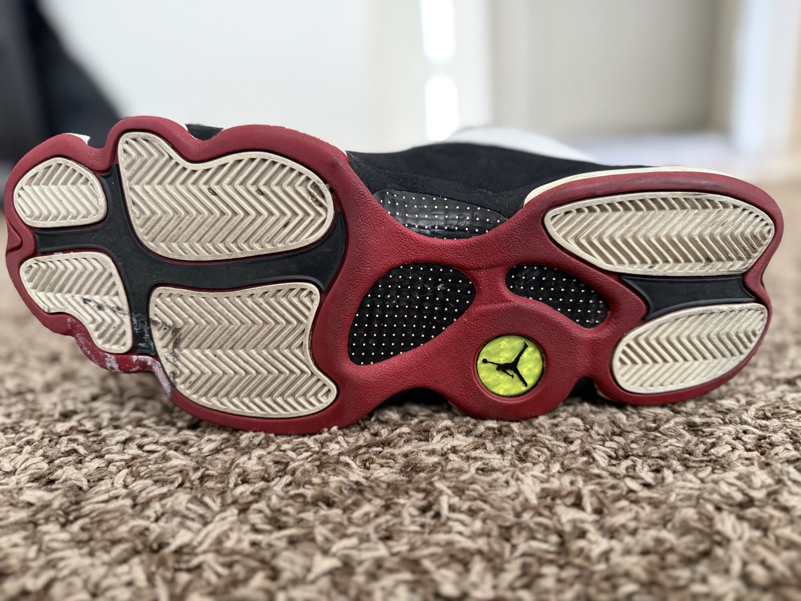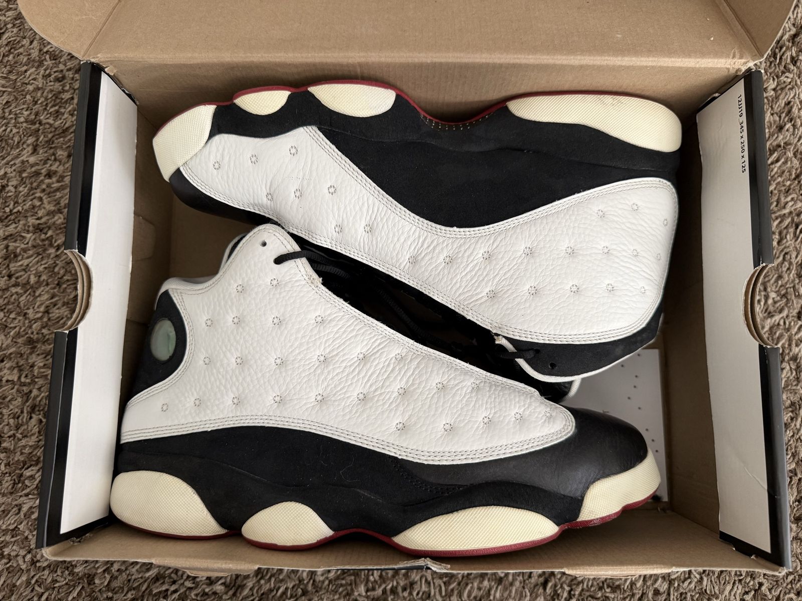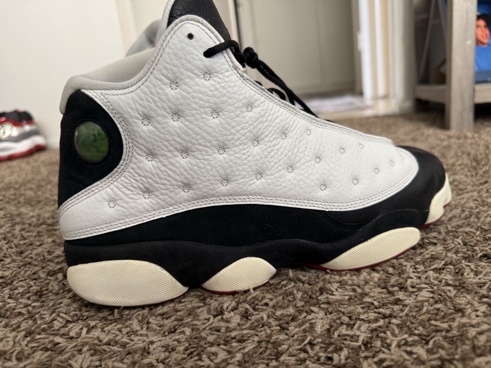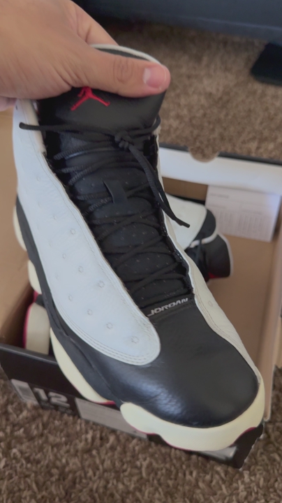 This is the one Denzel rocked in the Spike Lee film. White leather, black suede, red accents, green hologram on the heel. The 2013 retro of MJ's actual '97 season shoe.