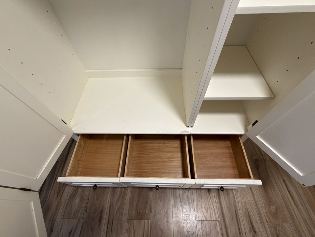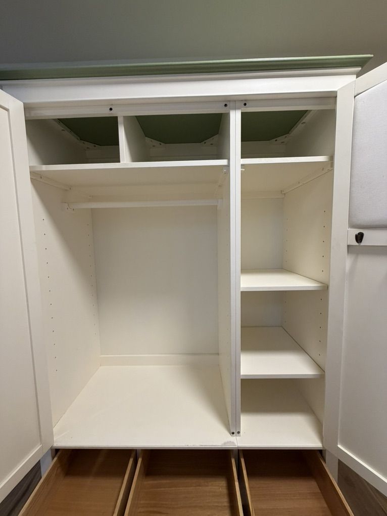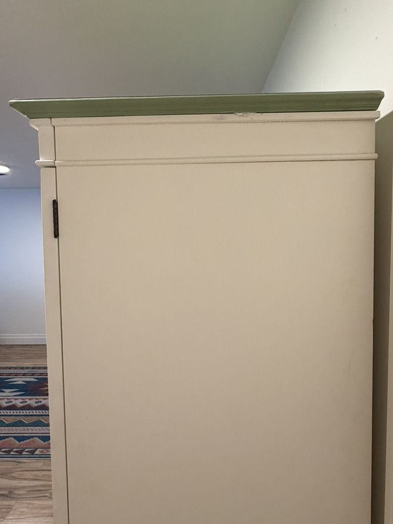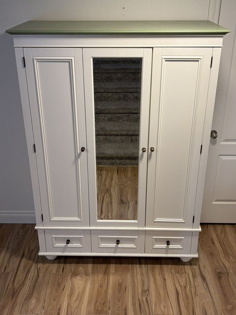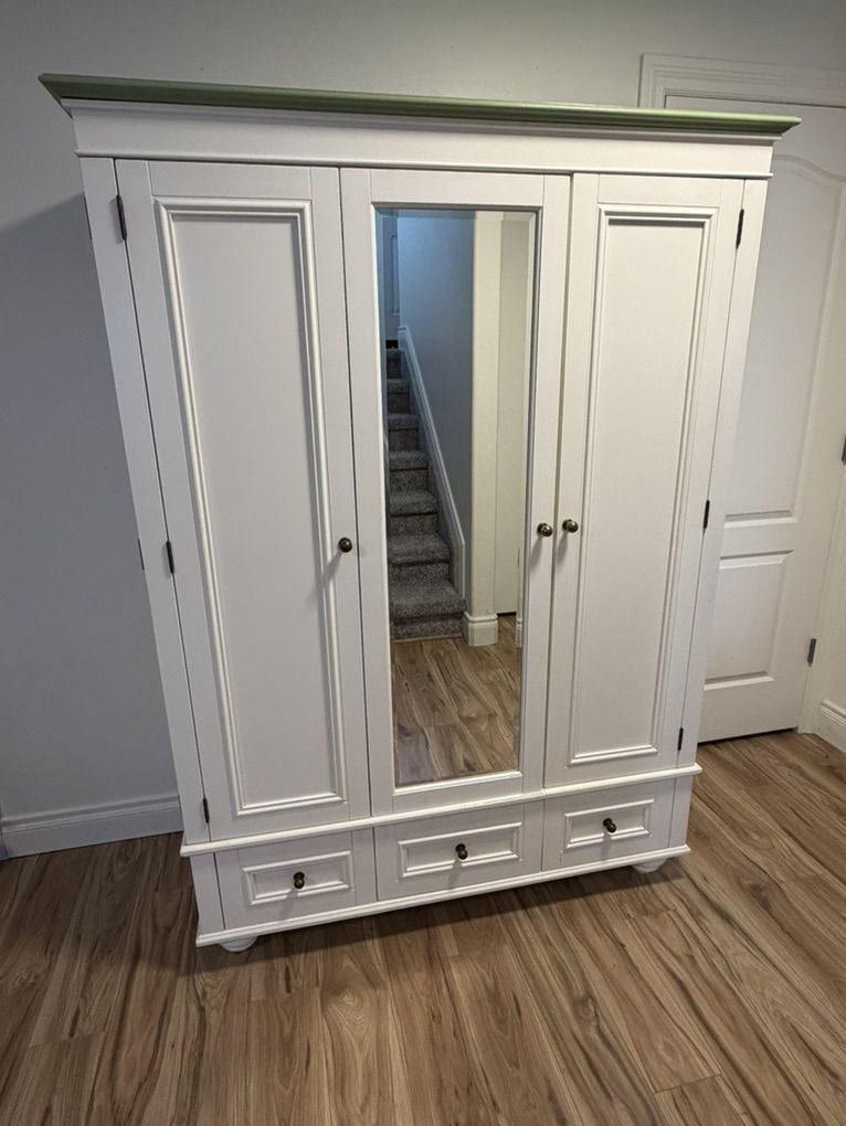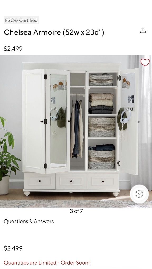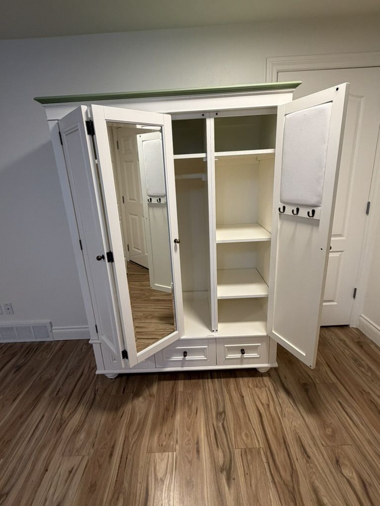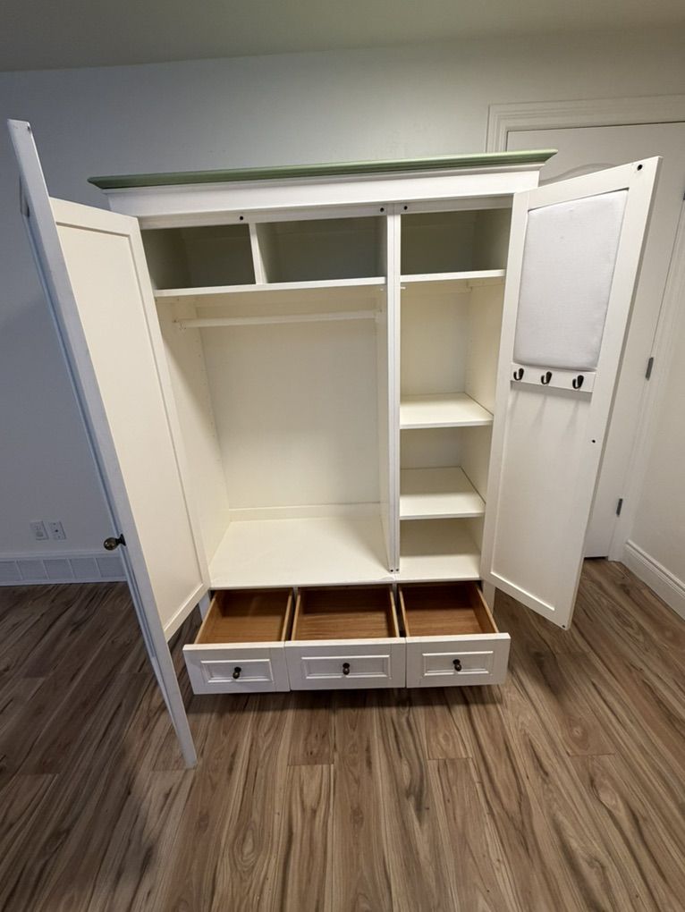 VenmoBeautiful, high quality Chelsea Armoire by Pottery Barn. This is a stunning piece of furniture built to last. We have the shelves that can be added to the wardrobe section that are still in their original packaging. Cosmetic damage on the sides shown in pictures.
