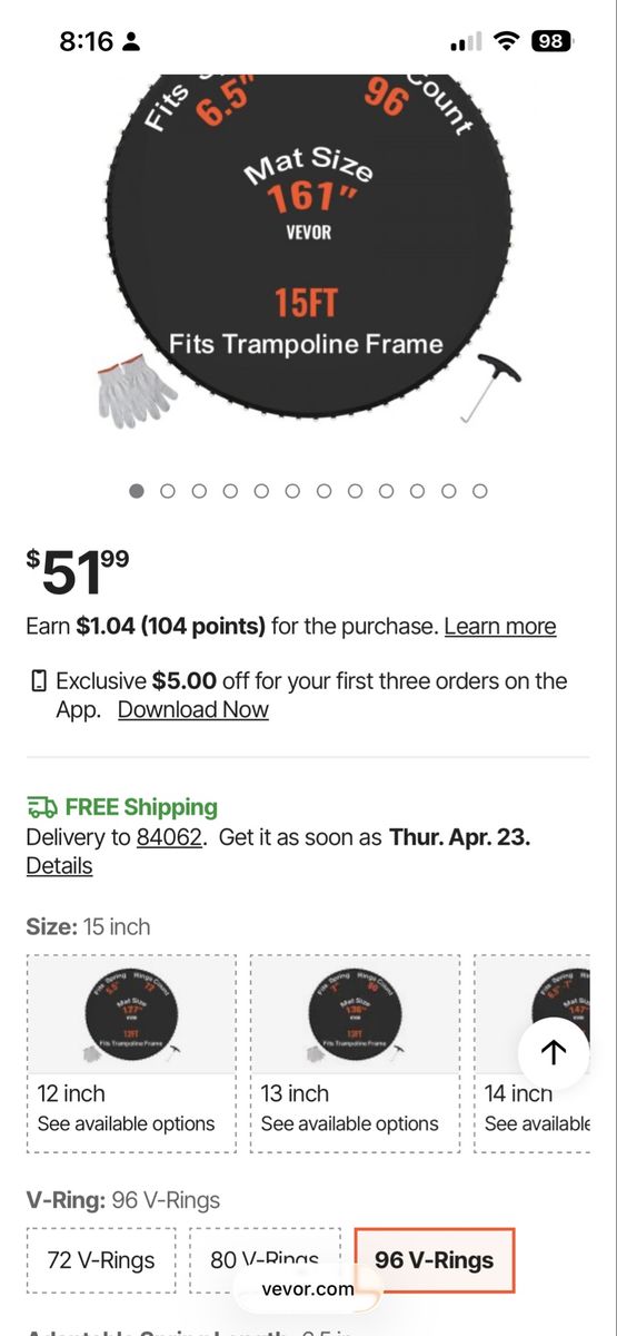 VenmoWe ordered the wrong size trampoline mat for our tramp. This one is for a 15 foot tramp. It has 96 rings for the springs. We’re asking $40.