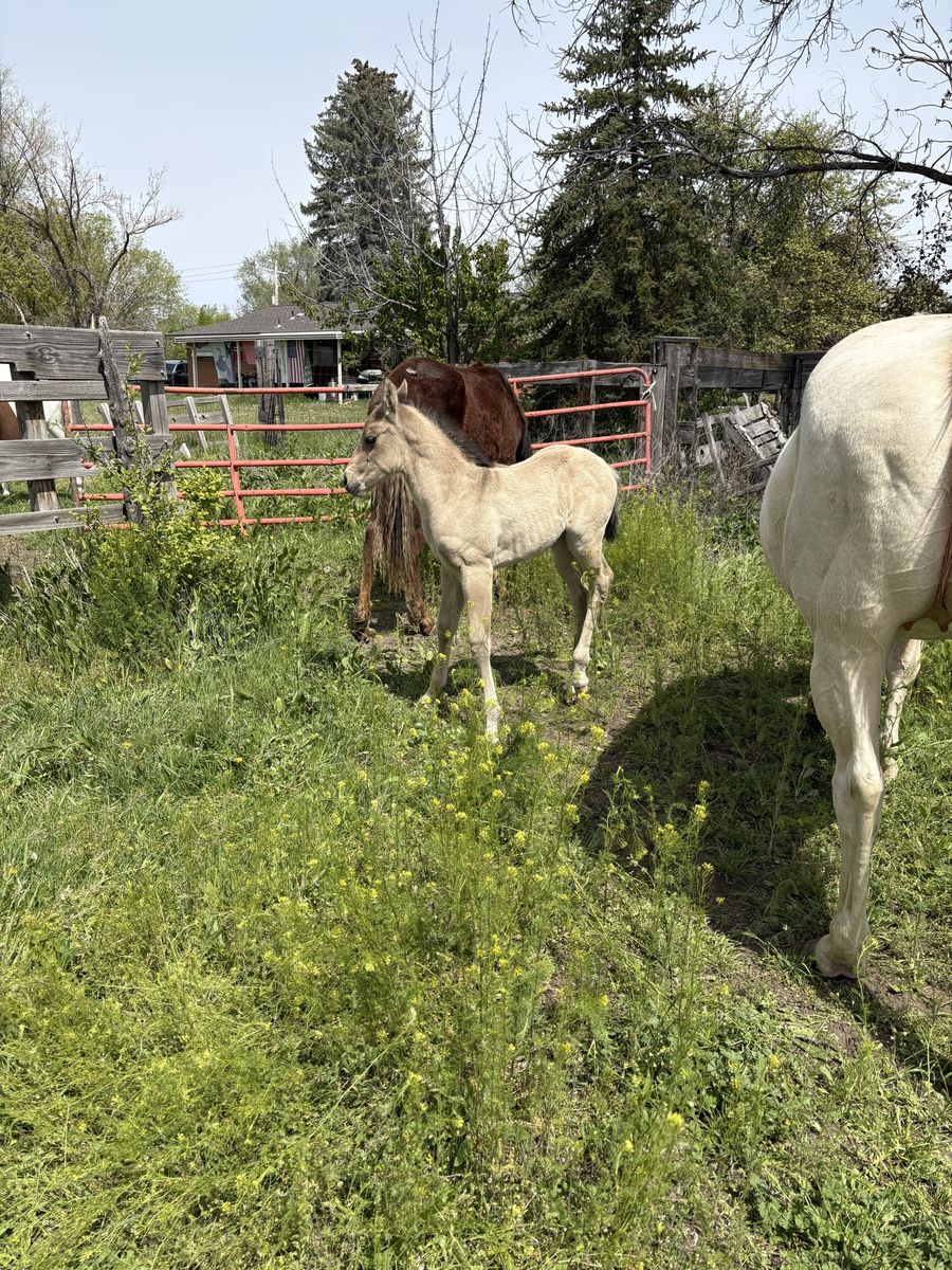 1/3 down now ($1200), the rest when she is weaned. This cute buckskin filly is one you won’t want to miss out on! She will have papers with Two Eyed Jack breeding. Come see her and the rest of the 2026 foals!