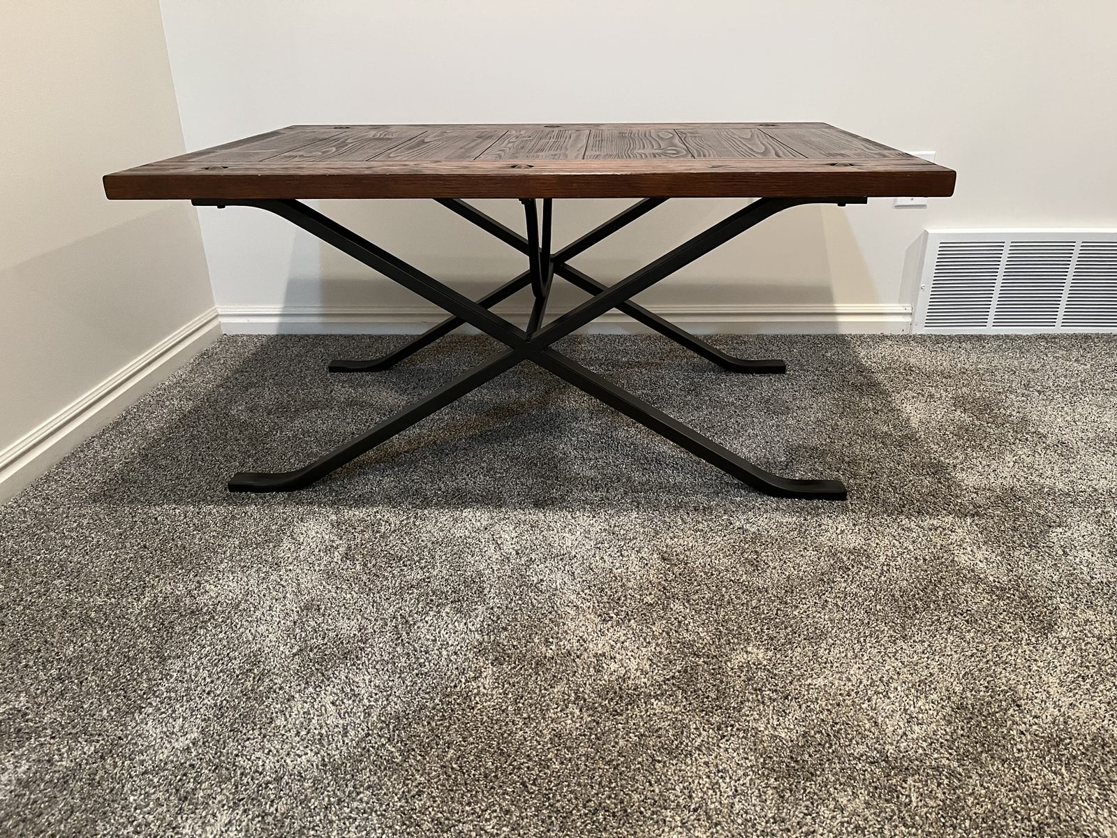 Like new dark wooden coffee table with metal criss-cross legs. 42" x 28" x 20"