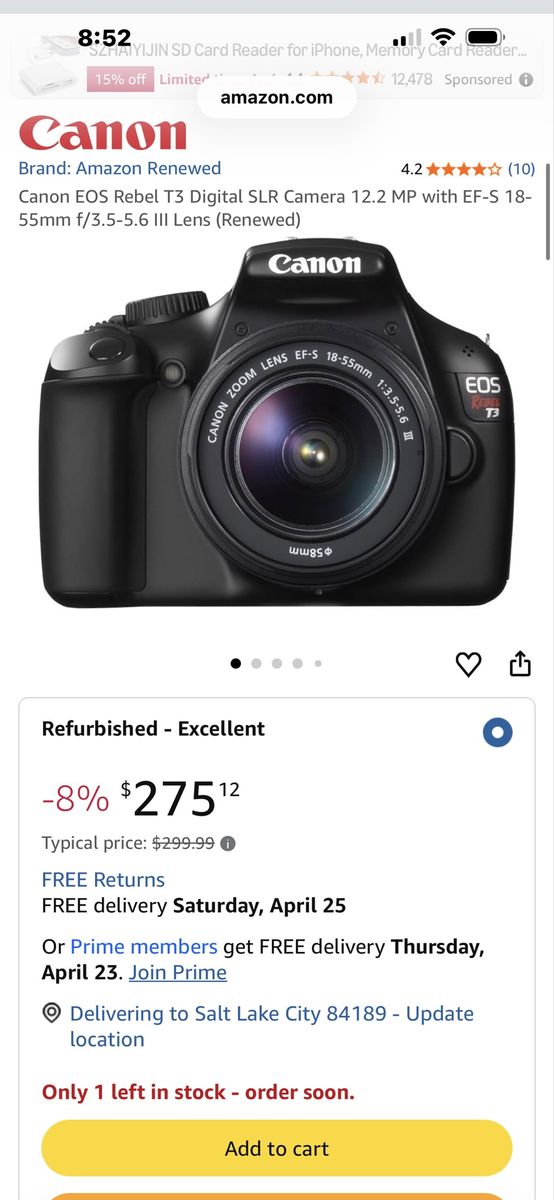 Like new canon t3 camera body with strap, battery & charger! Use it today! Excellent condition! Sweet camera for a sweet price! This exact camera is 275.12 on amazon now refurbished! Don’t pay retail prices, call Dustin now instead at 801-205-3404, I need it gone!