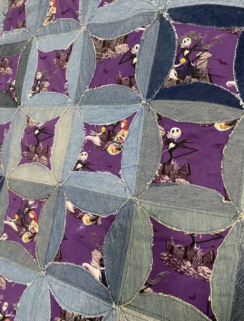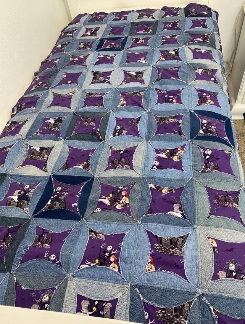 Beautiful Patch Work Reversible ~ Blue Jeans ~ Nightmare Before Christmas Quilt Lightly used at grandparents home. Smoke free home. ** Fits a Full Size Bed.. Measurements are: 75 Inches Long x 62 Inches Wide