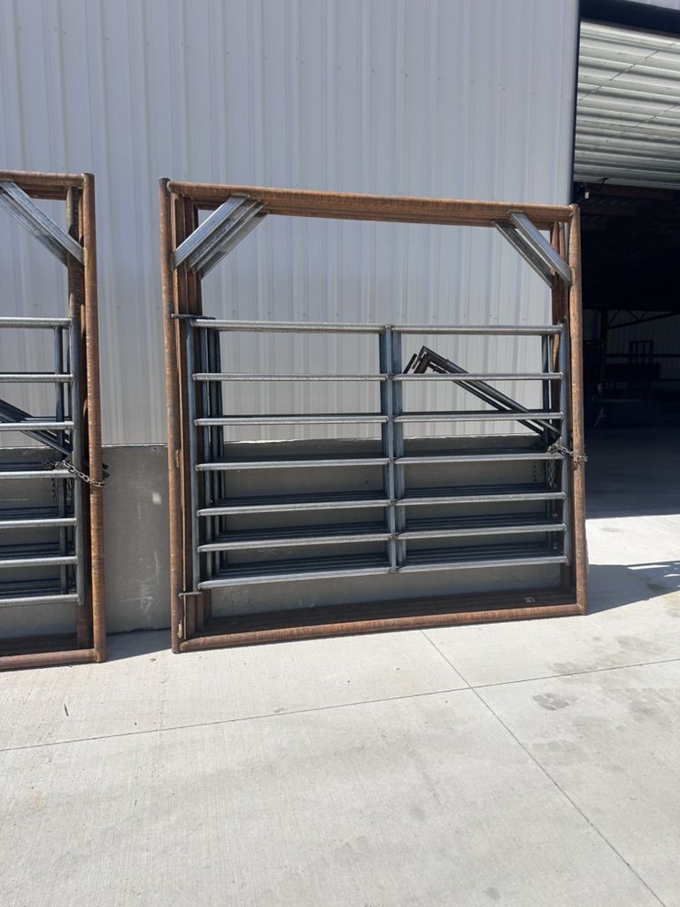 The frame is made from 2-3/8" Drill Pipe. The gates are Heavy-Duty, 14-gauge, 60" Tall x 7 Rail, with Cowboy Latches.