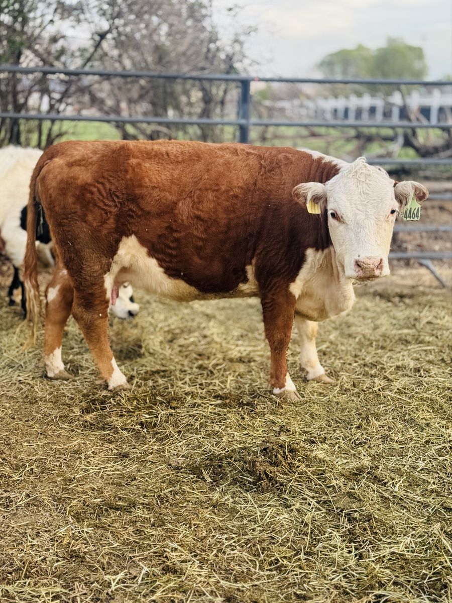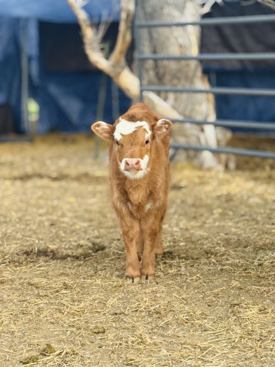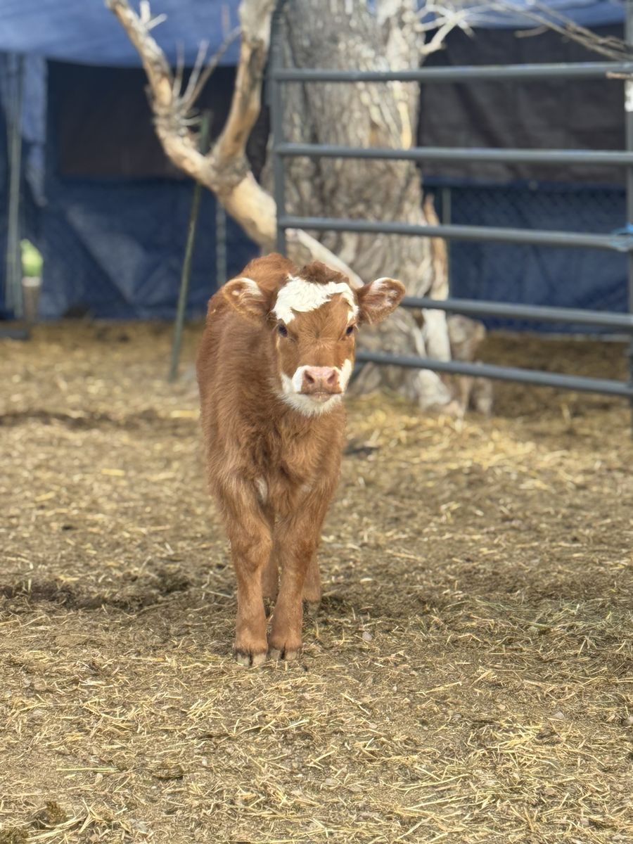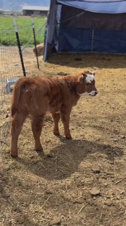 Calf is around 4 weeks old, strong, healthy, and growing well. Good-looking Hereford cross calf that’s off to a great start. Calf has already been started on vaccines.
