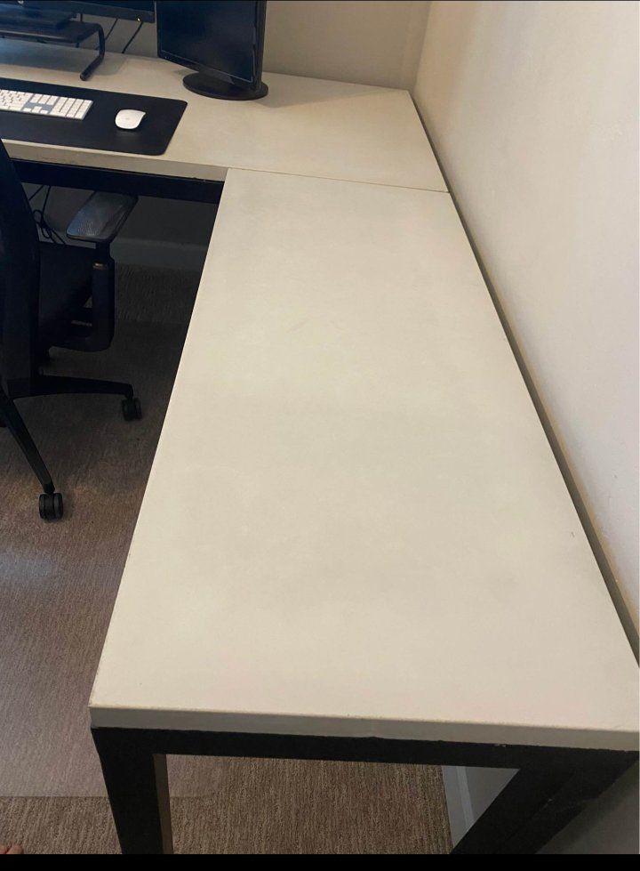 Concrete slab desk on metal frame. Solid desk. The top surface is smooth.