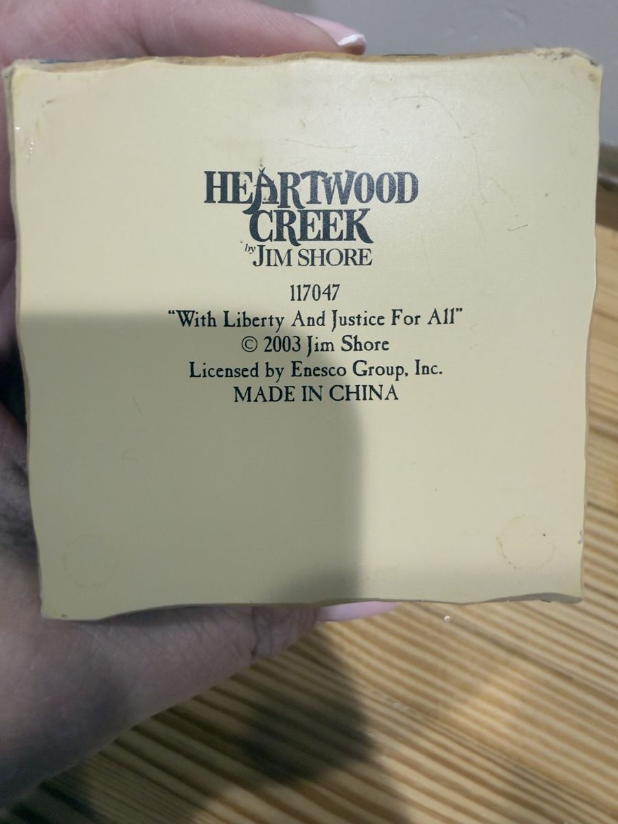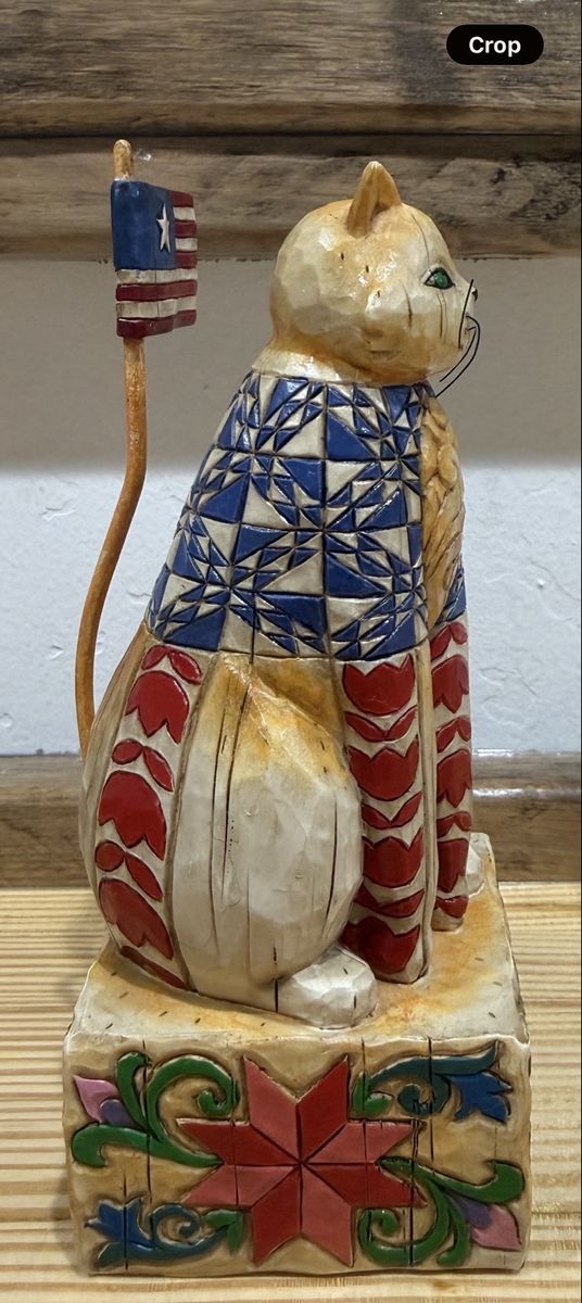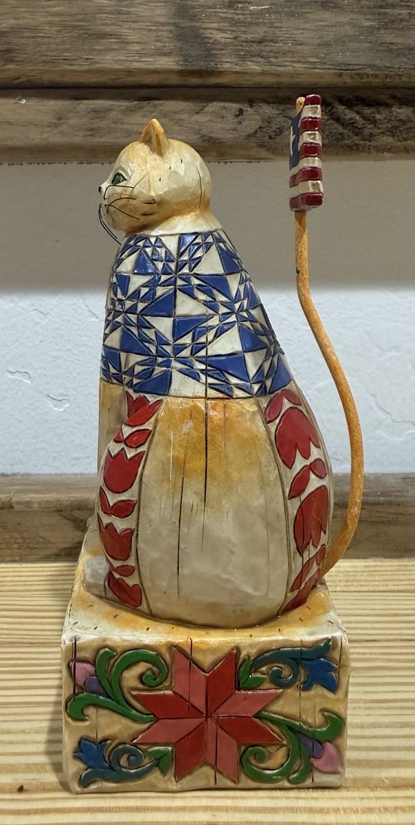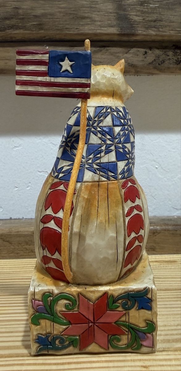 JIM SHORE HEARTWOOD CREEK FREEDOM CAT WITH LIBERTY AND JUSTICE FOR ALL PATRIOTIC. Measures 6.25" inches tall x 2.5" inches wide x 2.5" inches deep. Cash only.