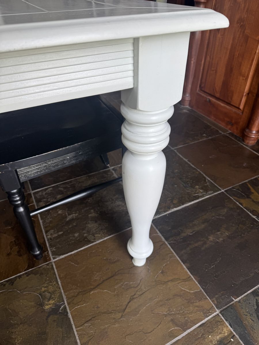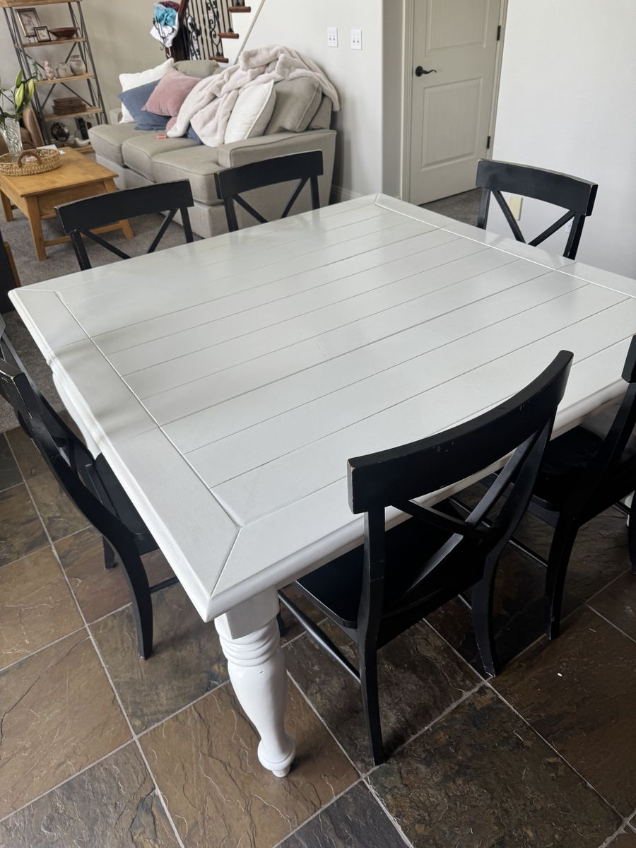 VenmoSolid Wood Kitchen Table in white This table is size 60x60 with a removable leaf to make it 40x60. It is in perfect condition but would also be easy to paint and finish in a different color since it is solid wood.