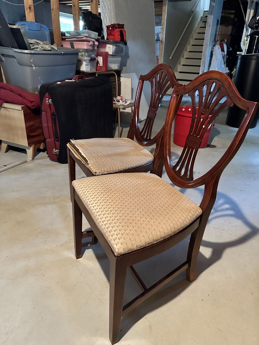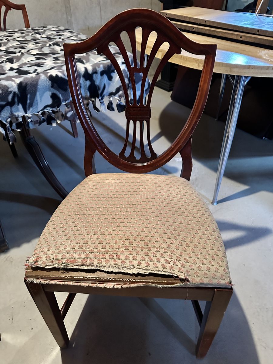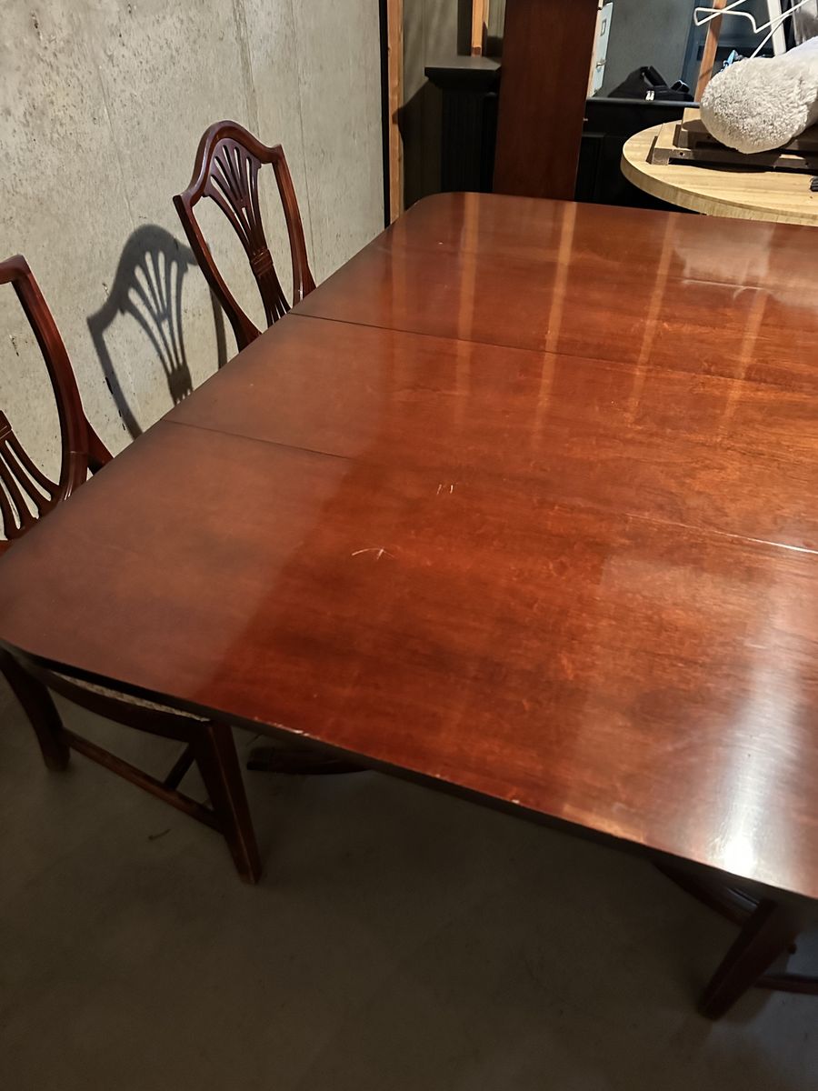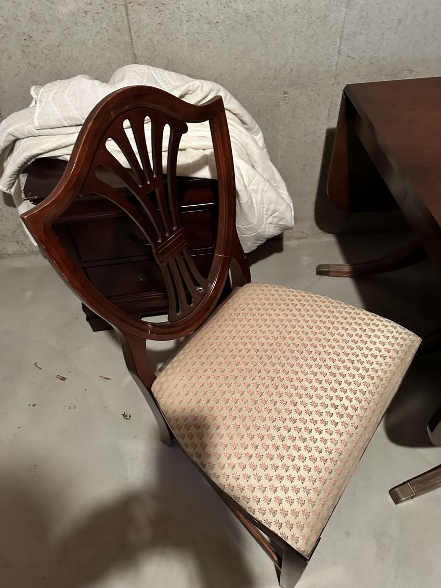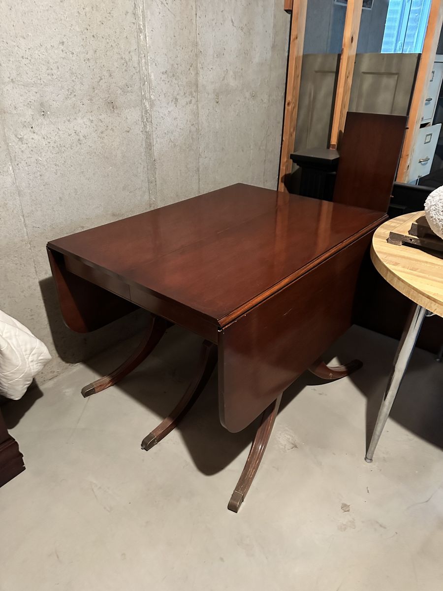 ApplePayBeautiful Dinning Room Table with 4 Chairs. Older but in great condition with only minor signs of wear. One chair has damage to upholstery. Table sides fold down for storage and moving. Table size 62 x 42 inches Comes with 3 leafs (12 inches each) to expand to 8 ft!