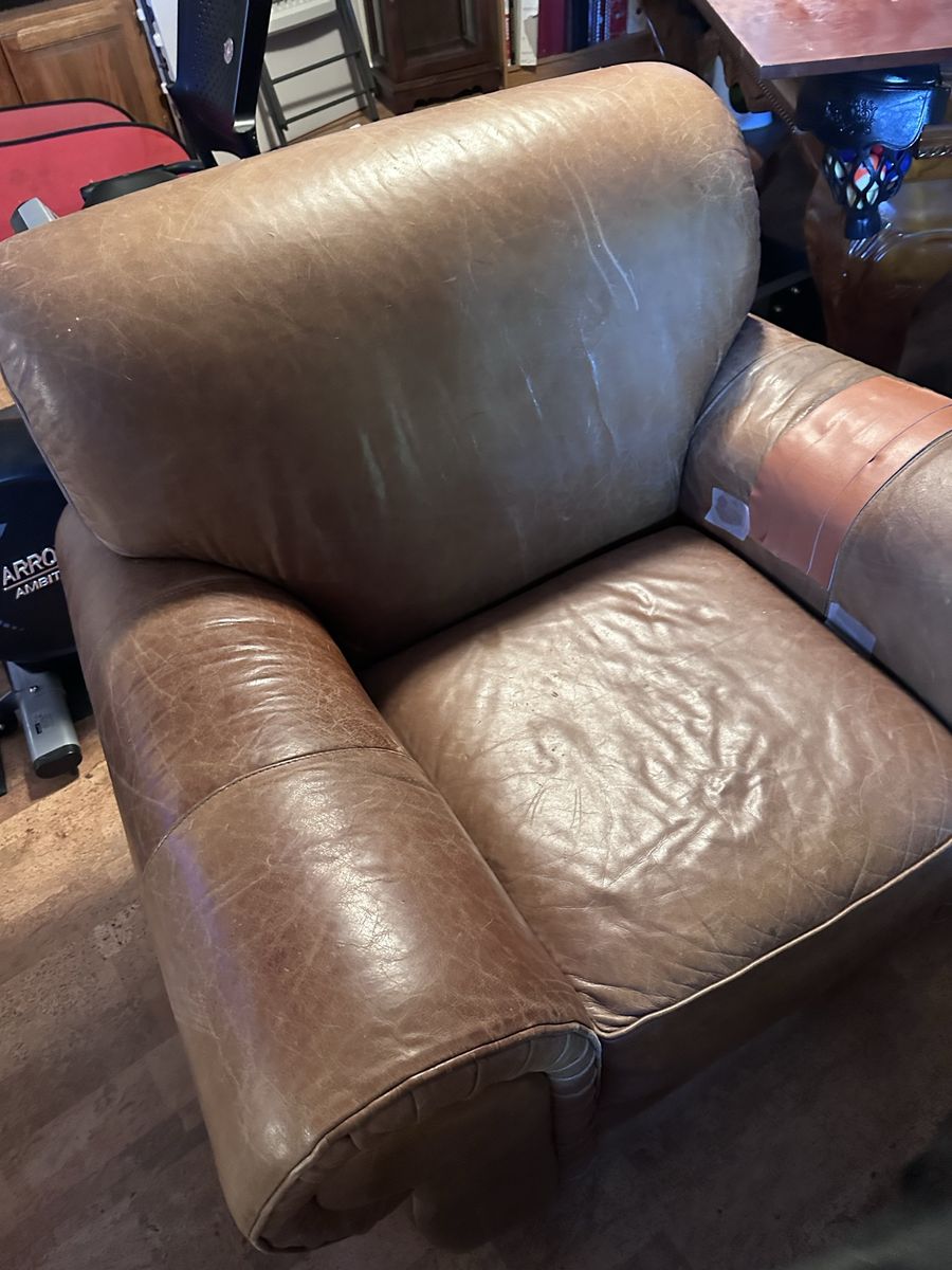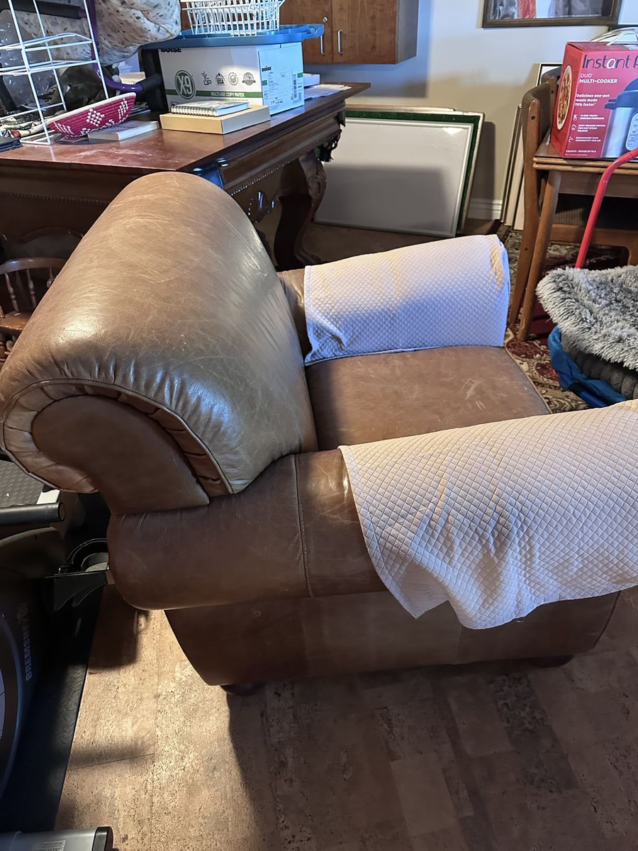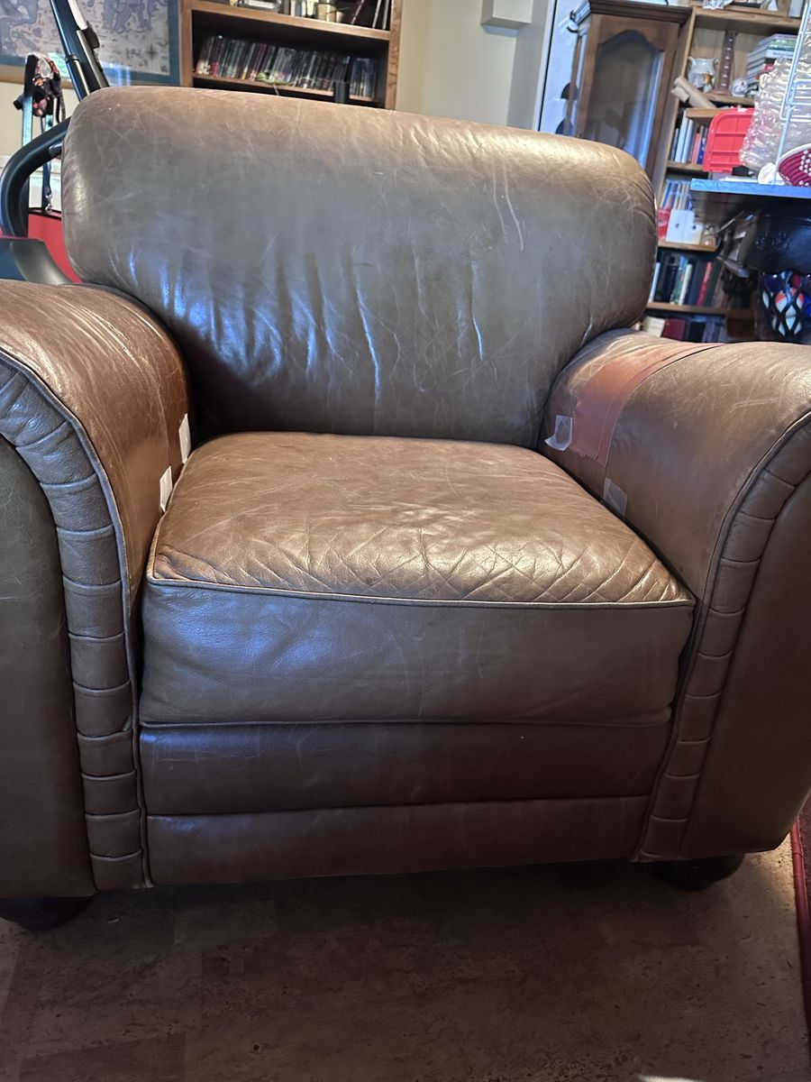 Heavy duty sturdy comfortable arm chair. Has some wear on the arms but no sagging. Needs some leather conditioner to look great again. Best offer.