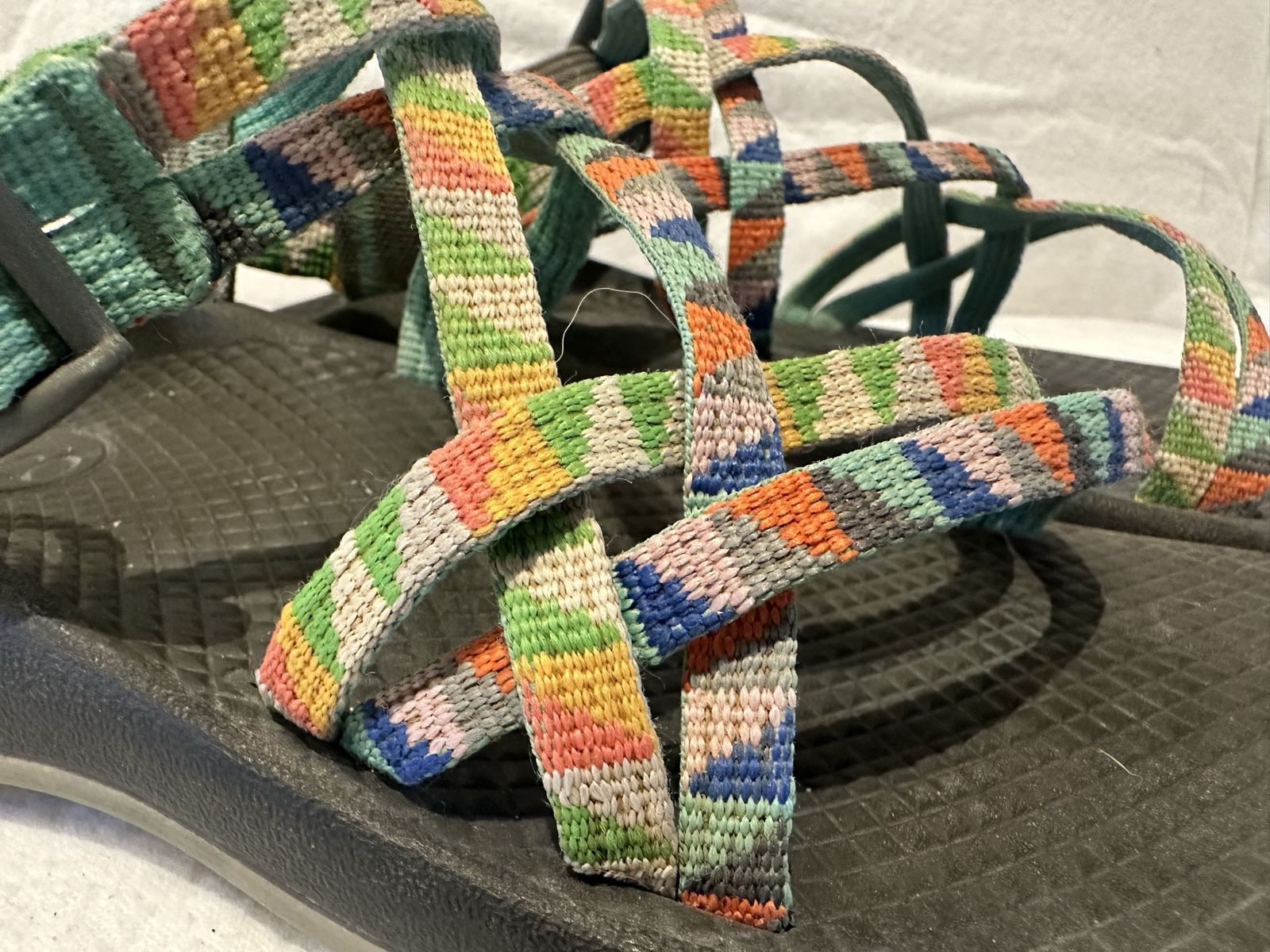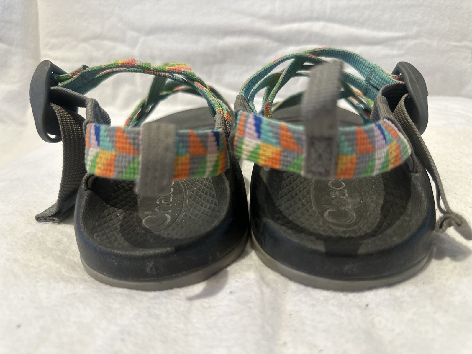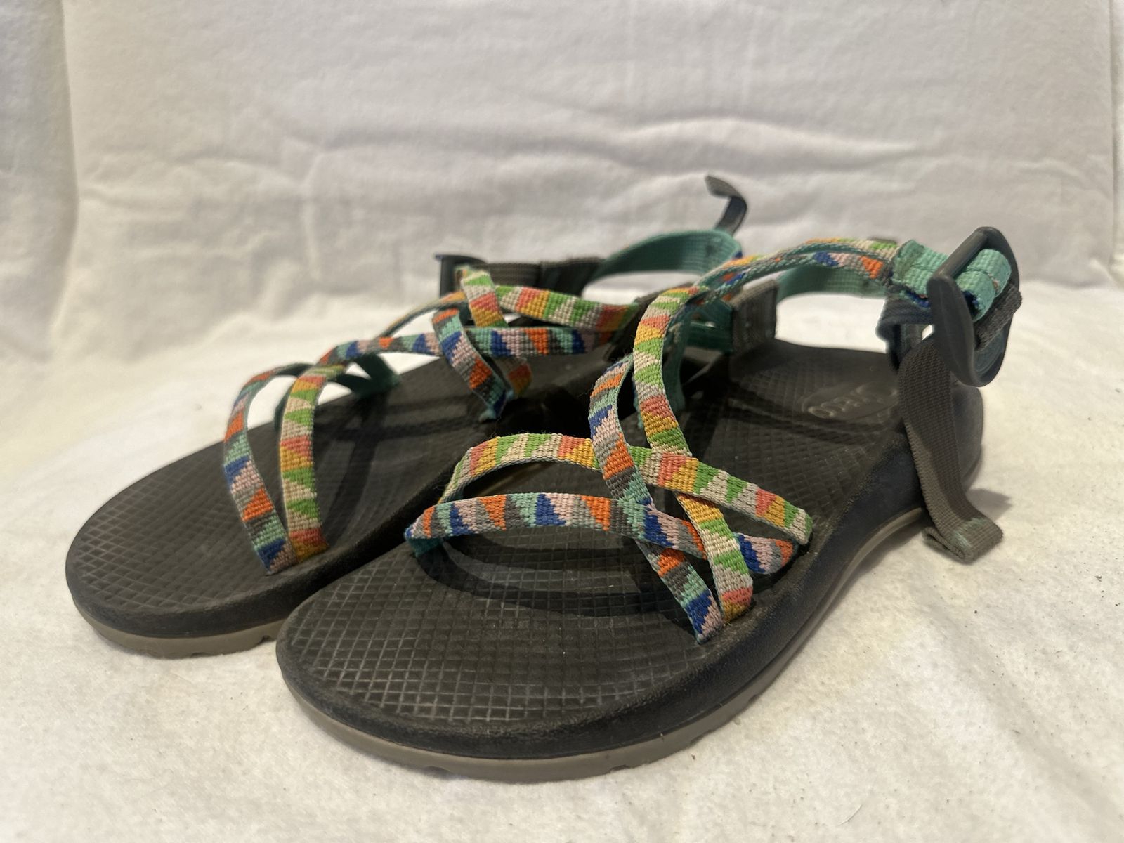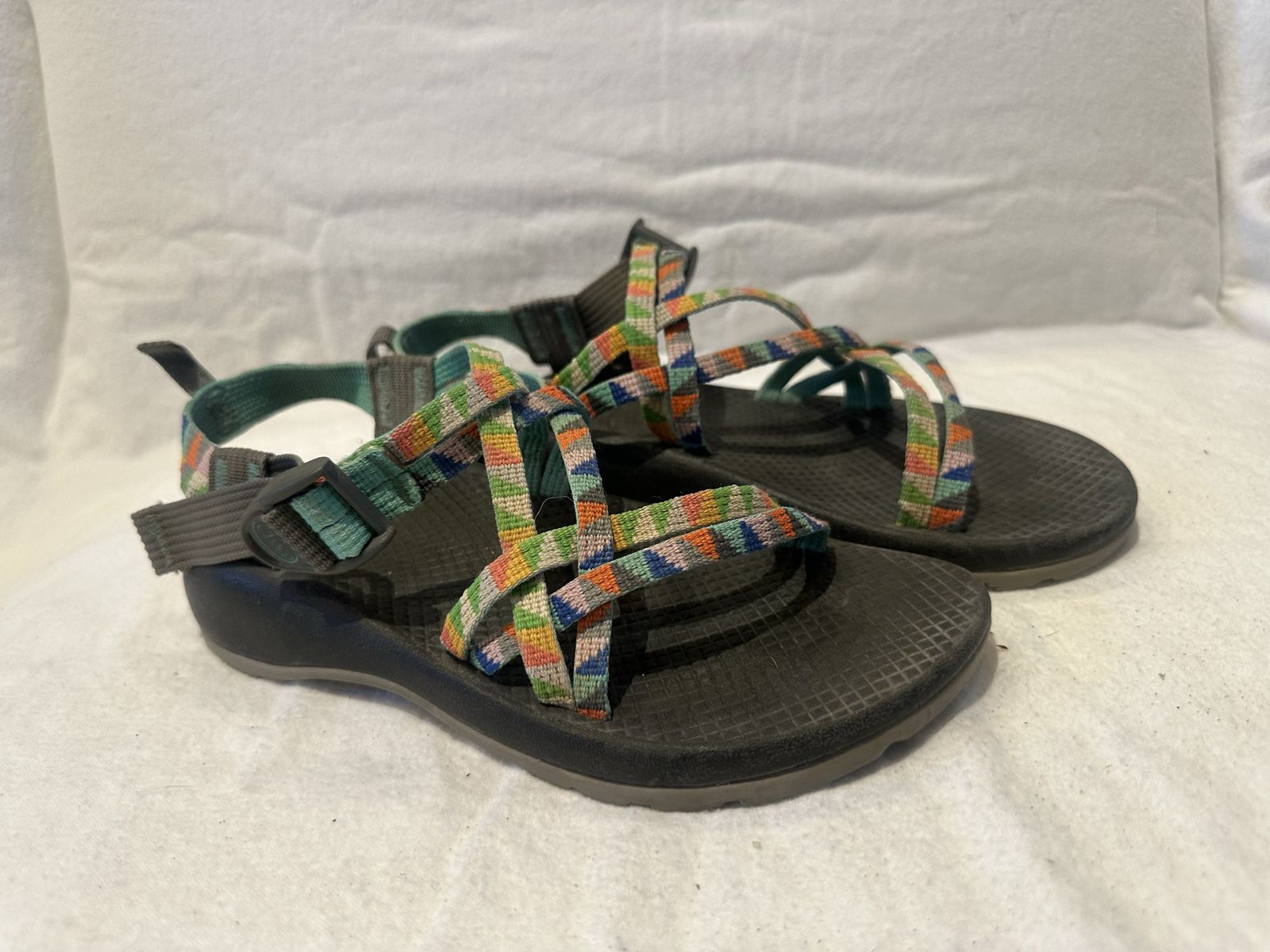 Chaco youth, size 4 colorful triangle print hiking sandals. These are in good condition, see photos for details. I take cash or Venmo, cash is preferred. Text is best. 801-201-4446. Check out my other ads for additional sizes and styles.