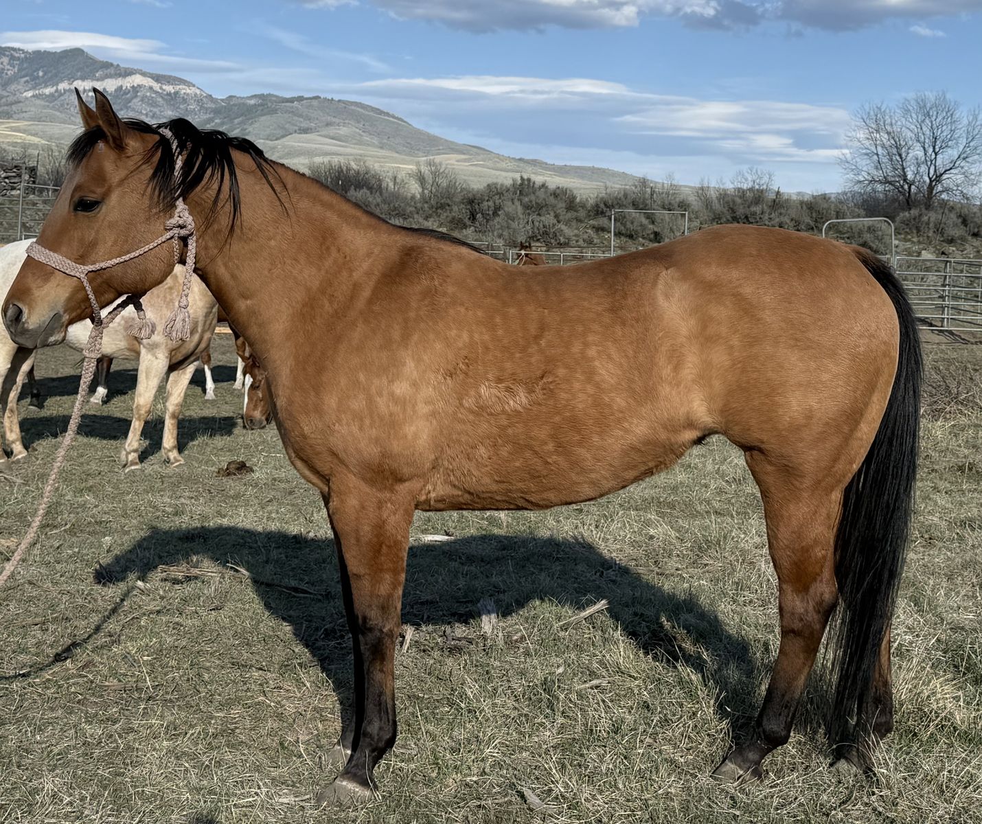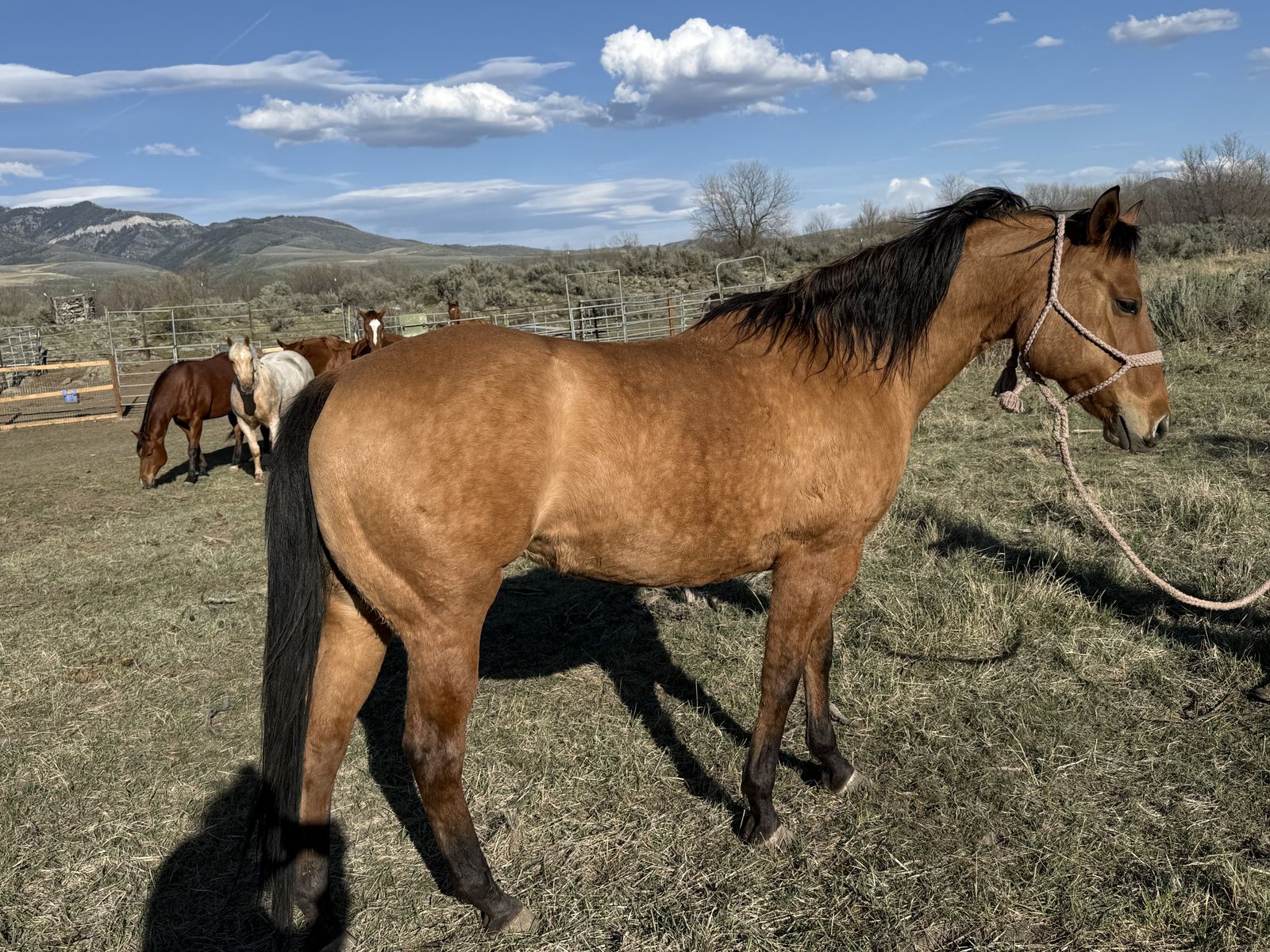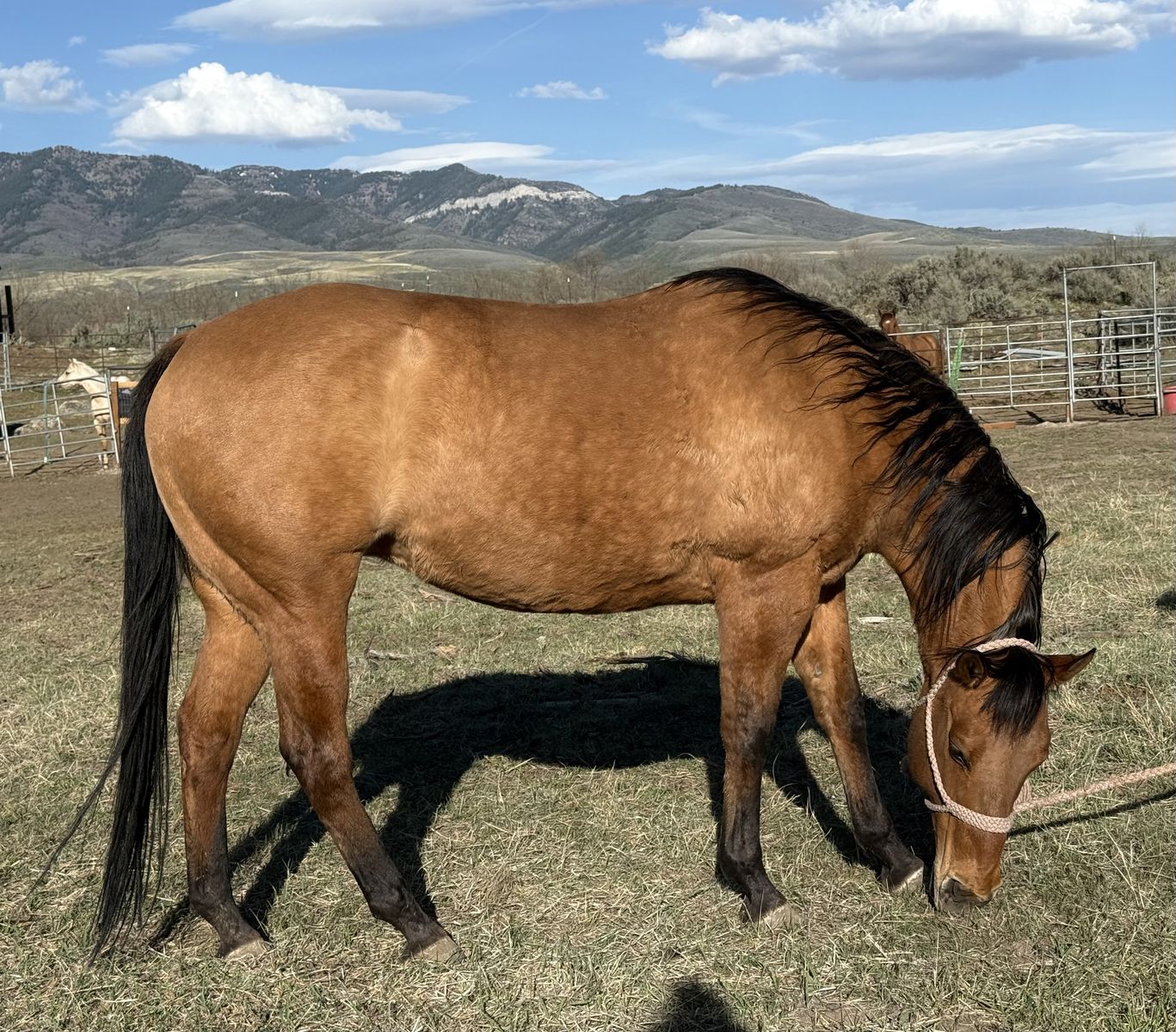 Grade mare, has been saddled many times. Never offered to buck, ties, loads, trims, never had shoes on. She will be started once we get into better weather, but offering her before hand.
