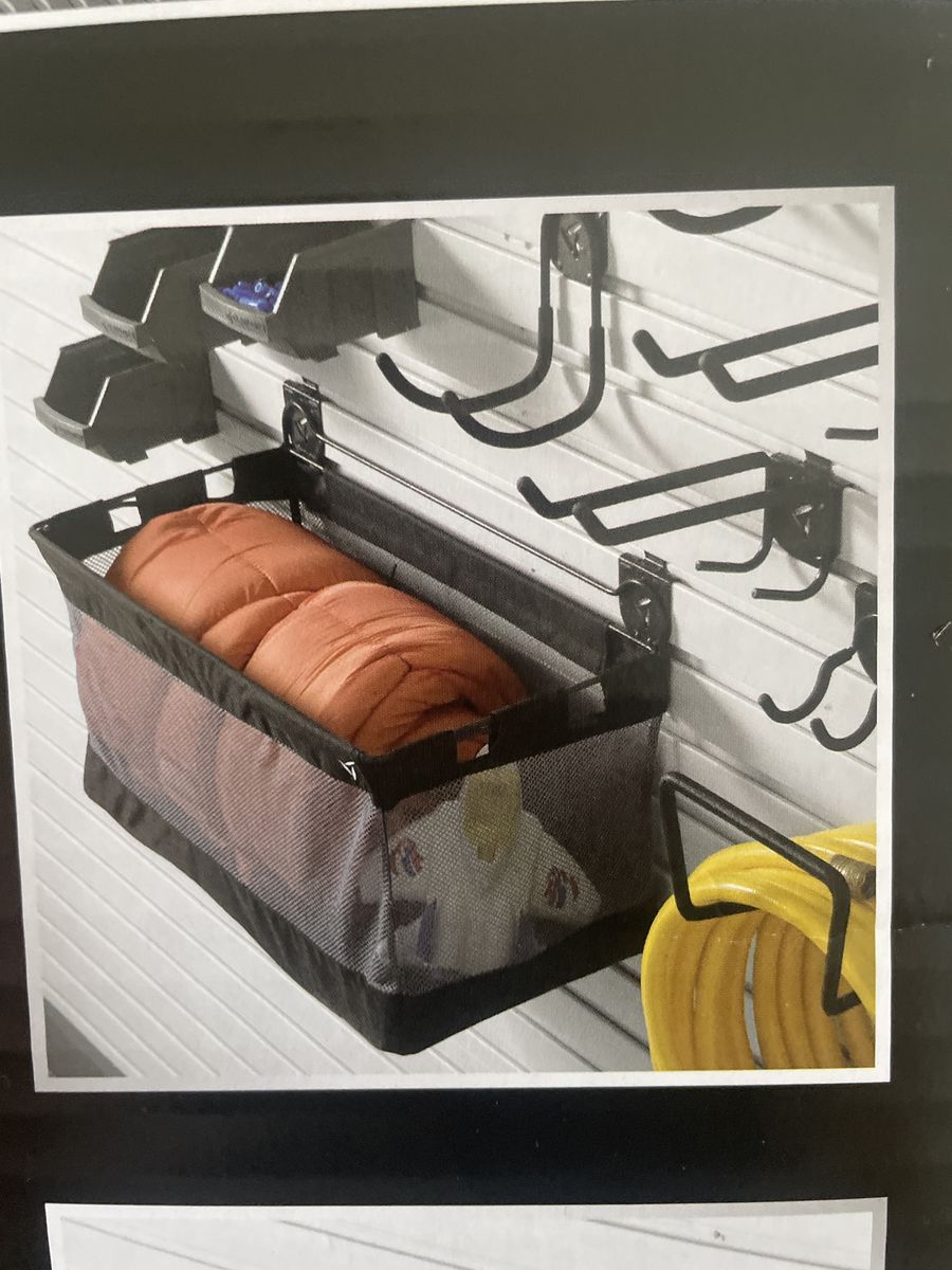 ApplePayStorage hanging basket for a garage system. The hanging board is NOT included. This is the backer and hardware only new in open box