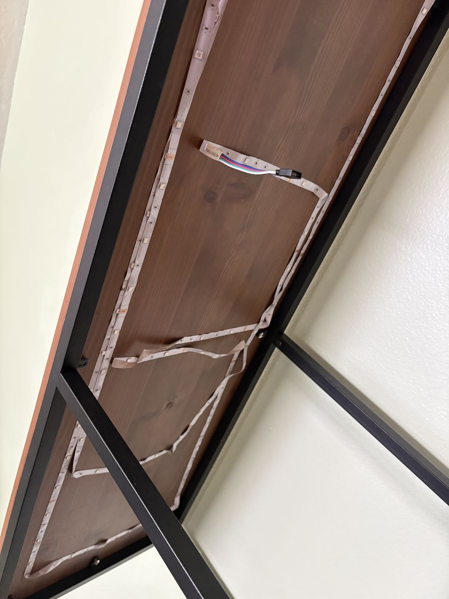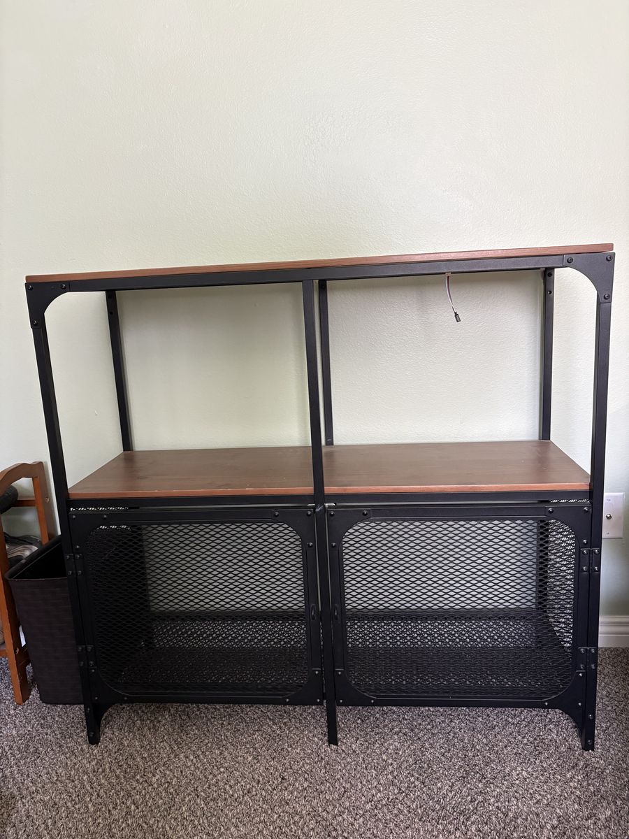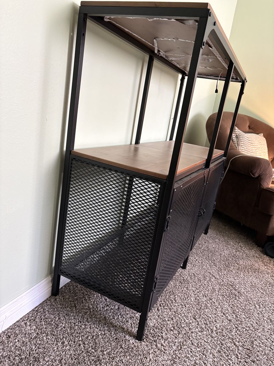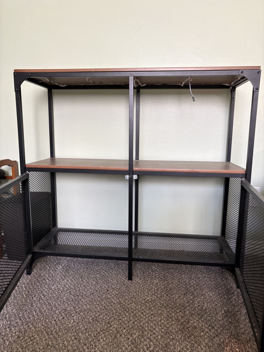 Shelf with wood accents. Dimensions are 14 1/4 inches deep, 39 1/2 inches wide, 37 inches tall. It has adjustable feet As well.