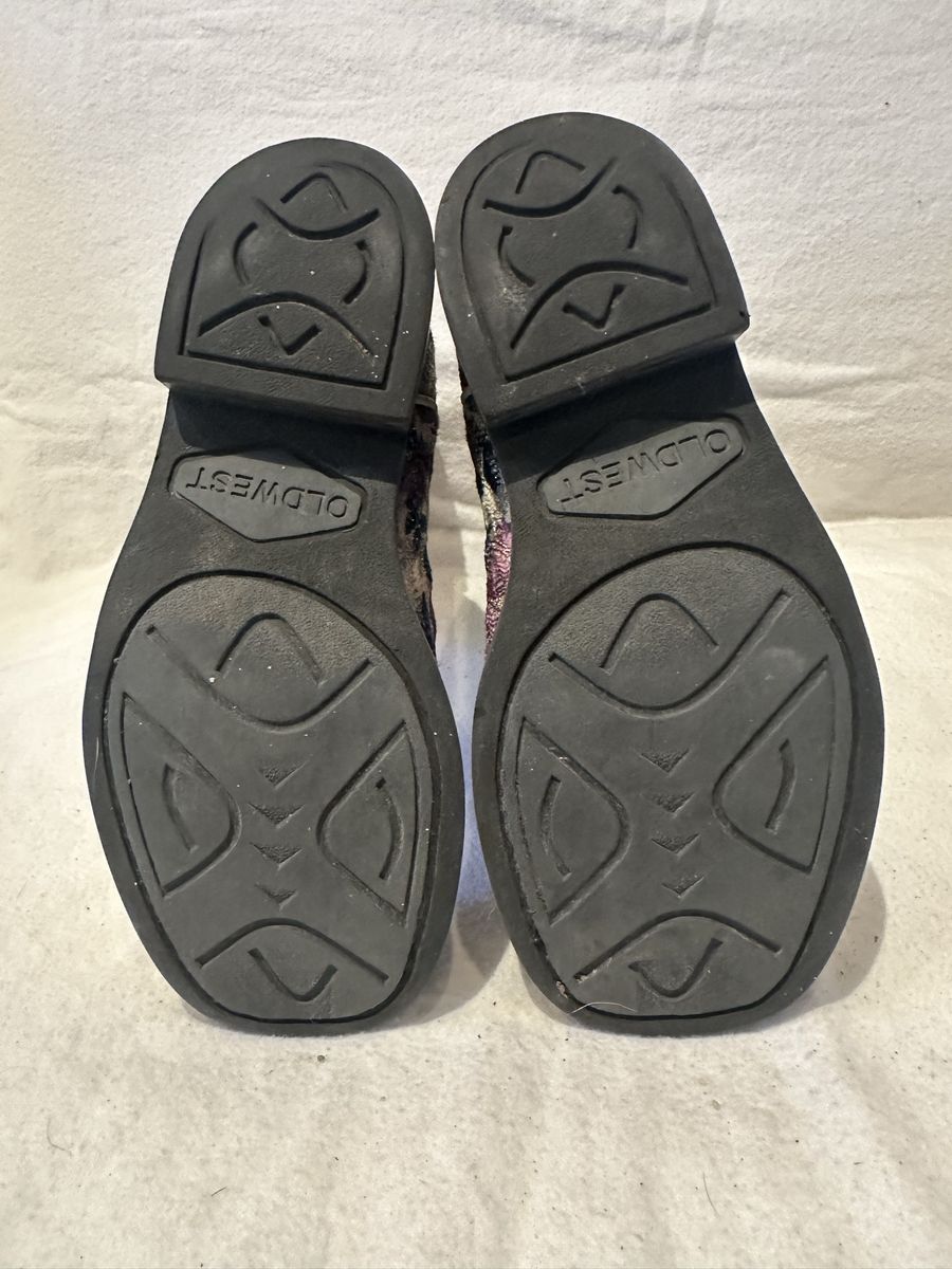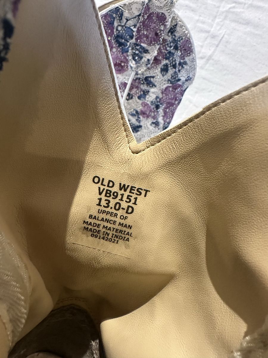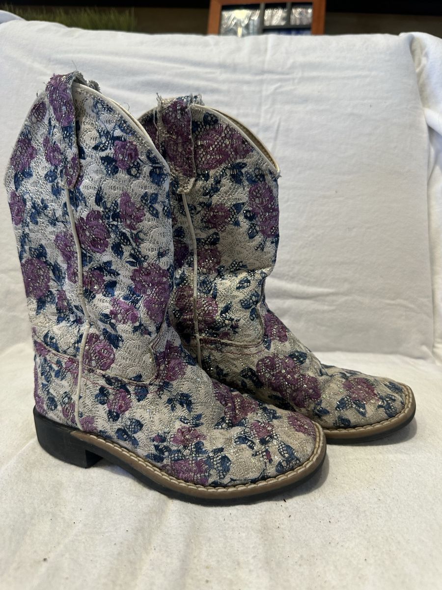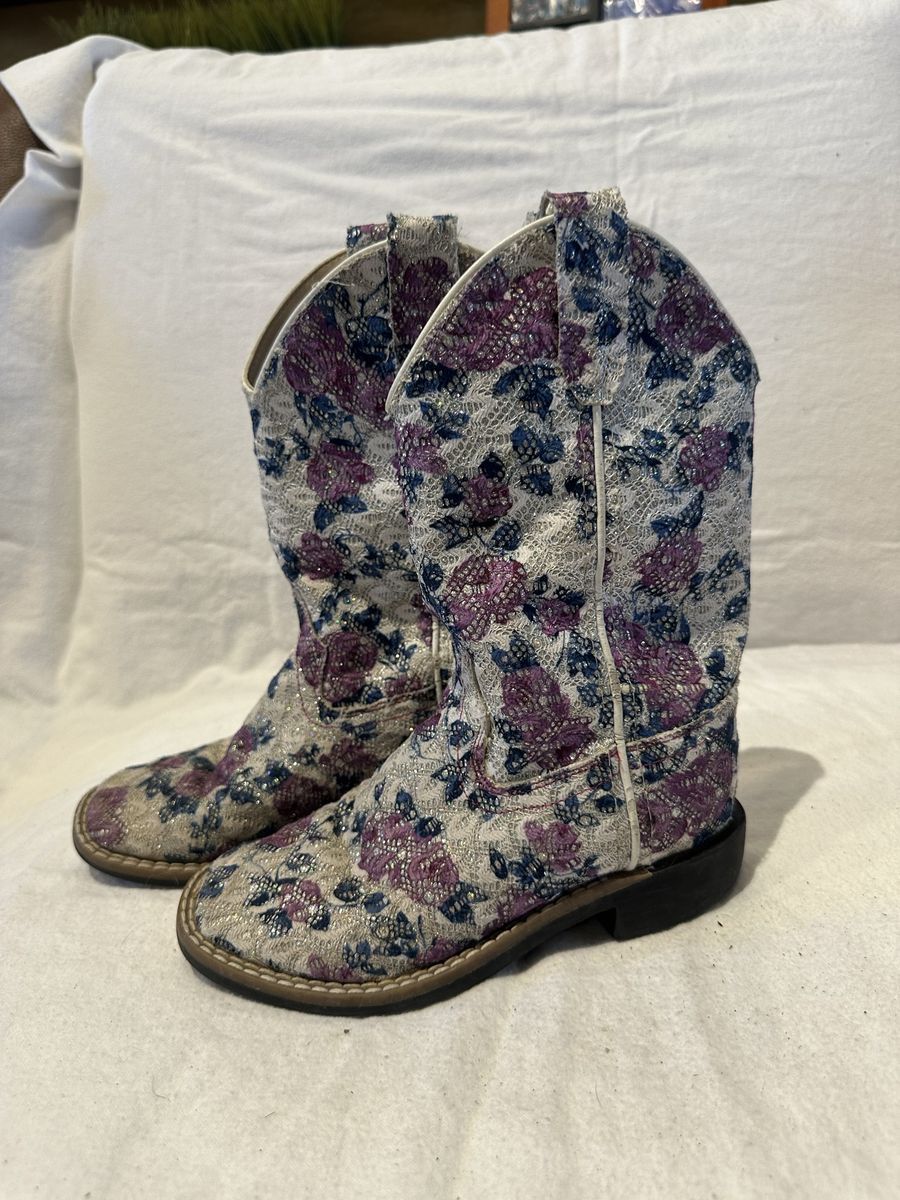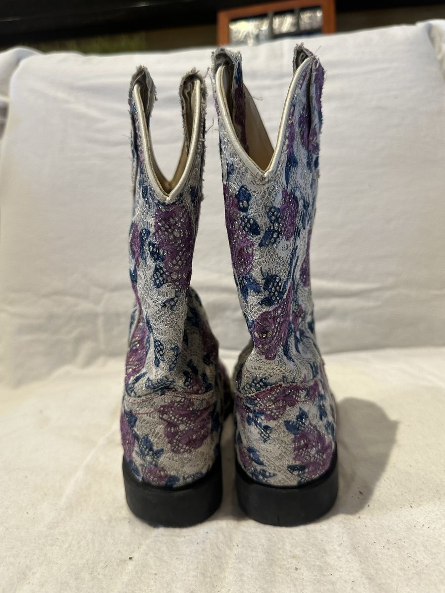 Old West toddler size 13 purple/navy/cream, flower lace overlay with glittery silver showing through. These are in good condition, see photos for details. I take cash or Venmo, but cash is preferred. Text is best. 801-201-4446. Check out my other ads for additional sizes and styles.