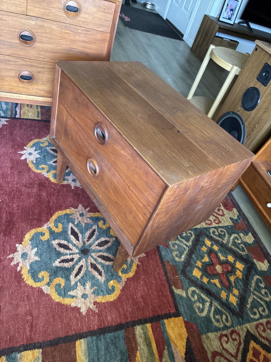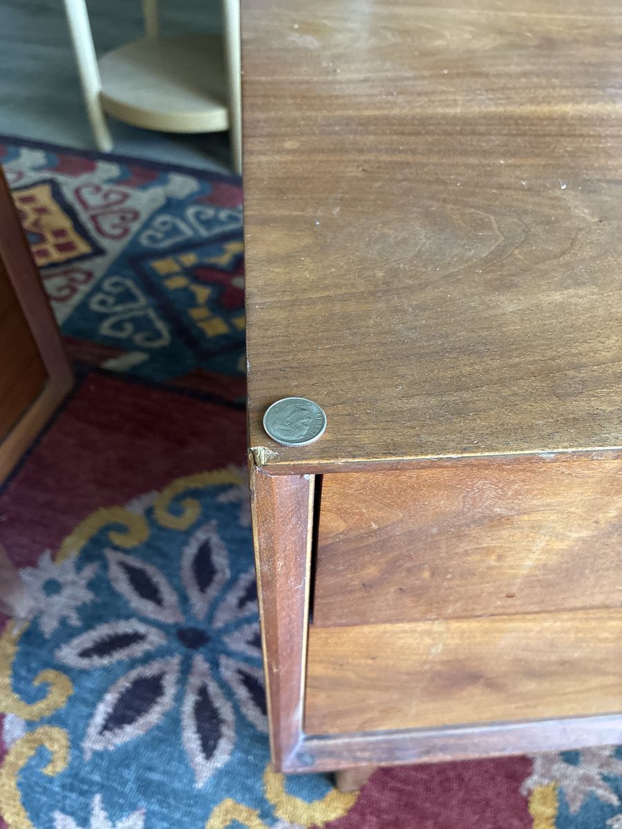 In great original condition. Finish shows wear but the only significant flaw is a burn mark on top and a nick on one corner, pictures show these. Drawers side smooth.