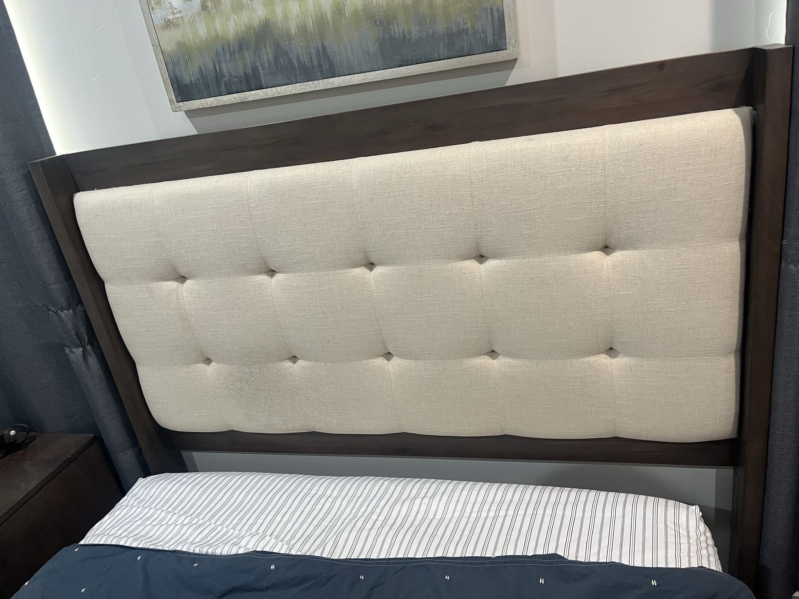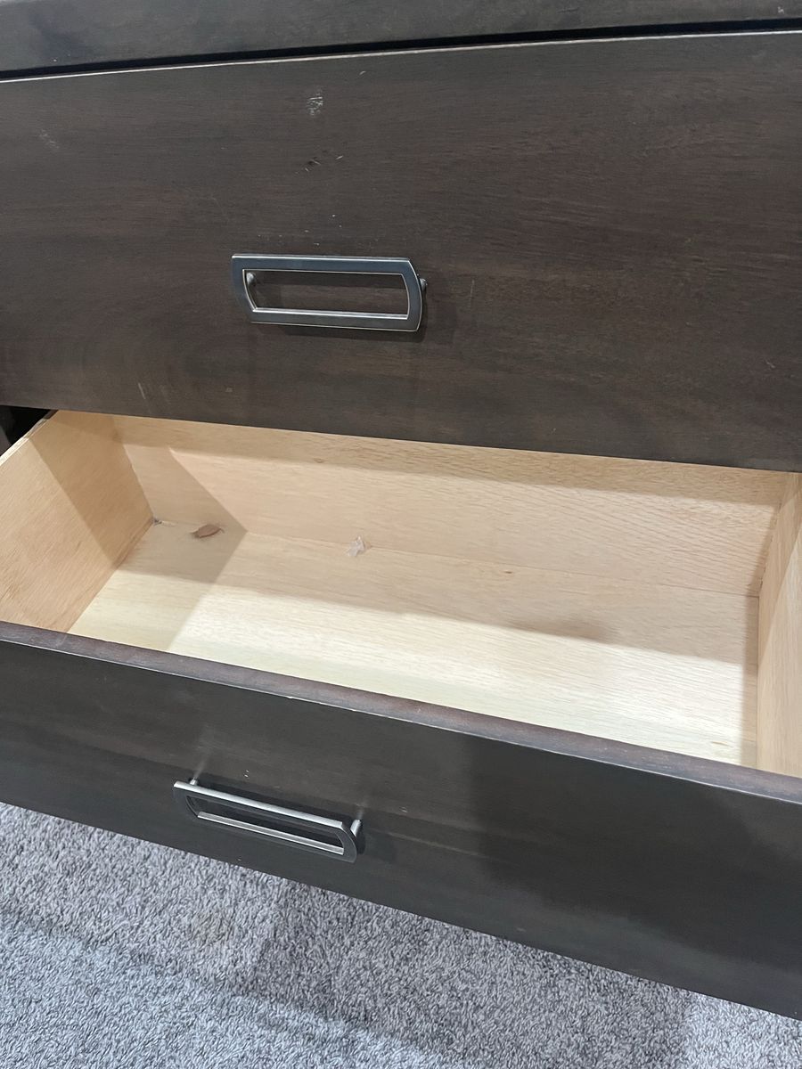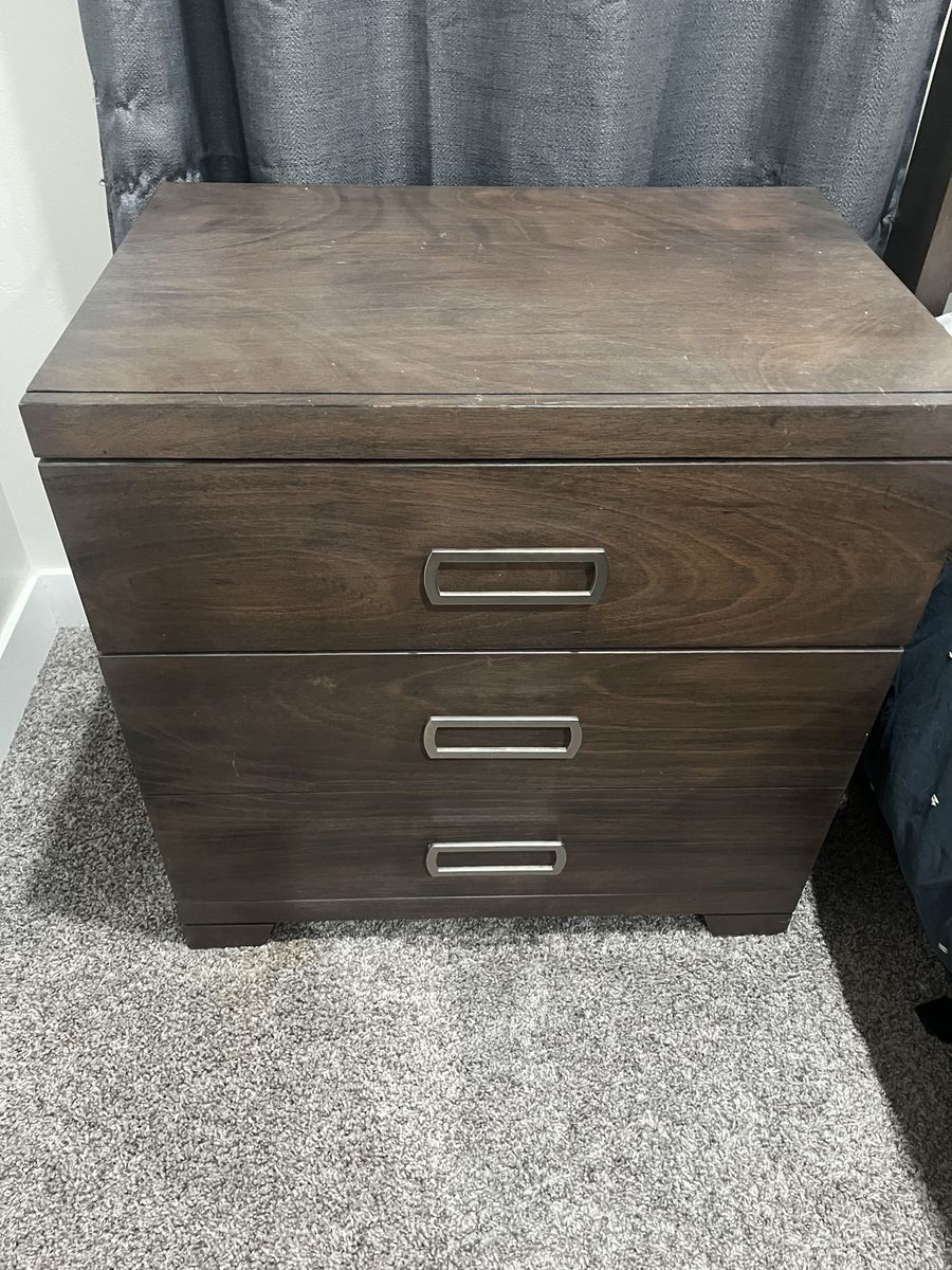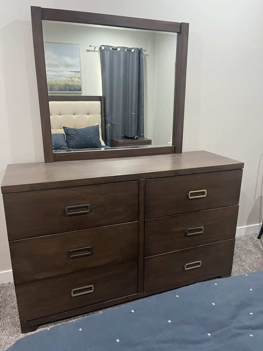 VenmoDark brown bedroom set. Includes headboard, bed frame, mattress, box spring, dresser, large mirror on dresser, and 1 side table. It’s been in a guest bedroom so very very lightly used.