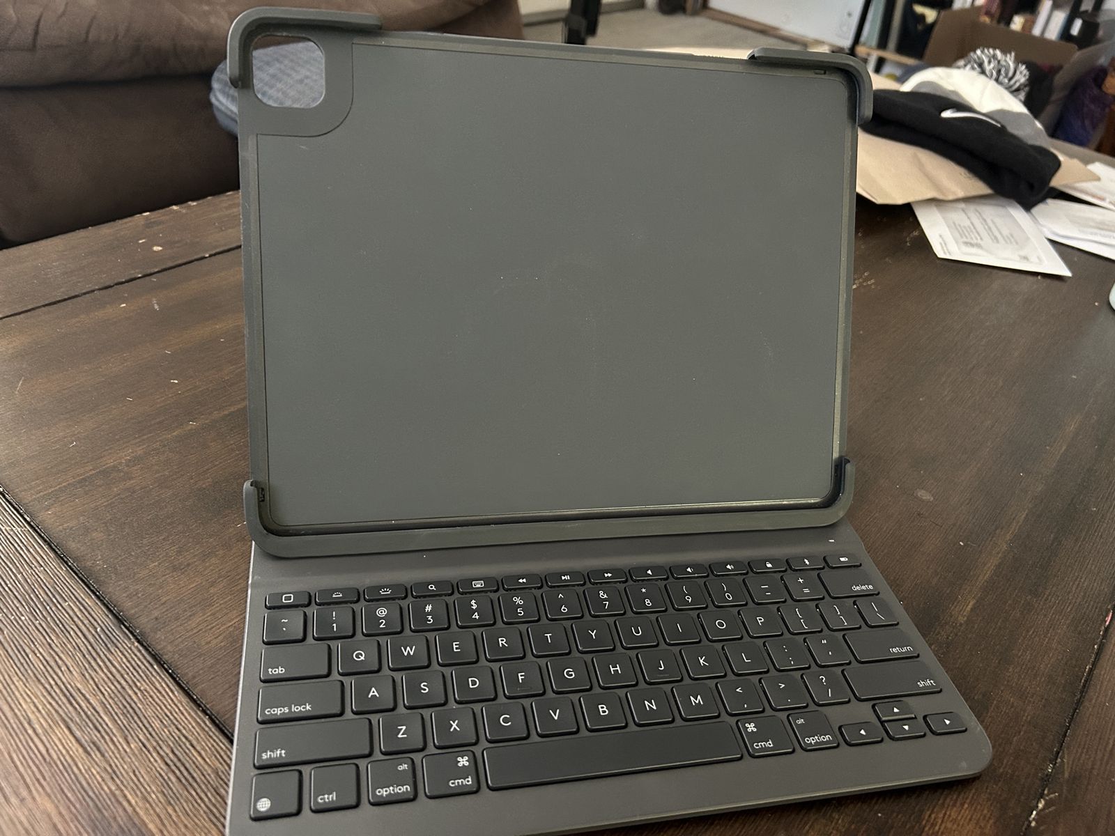 ZelleComes with Logitech slim folio case, and an Apple Pencil. 128gb capacity