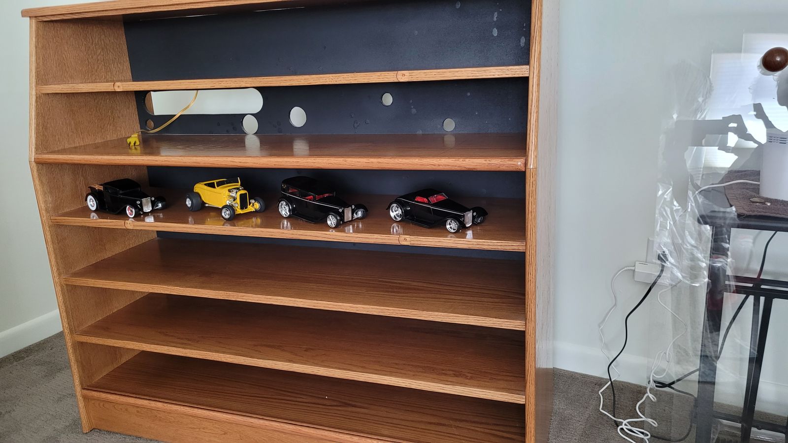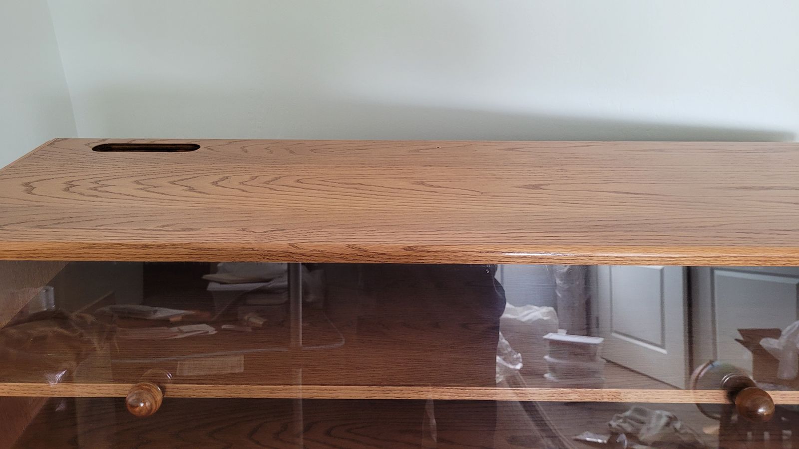 This is solid wood, handmade, TV stand and display cabinet. There are 2, plexigalss, removable front covers. It has pre-drilled holes in the cabinet back and top to accomodate the wiring and cords for a TV and accesories. The dimensions are 47" x 16 1/2" x 42". The spacing betweenn the shelves is approximately 5 1/4". It can roll on casters. The cabinet is in excellent shape.