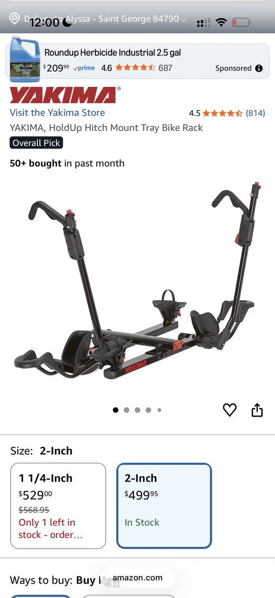 VenmoColor: Black Brand: Yakima Material: Alloy Steel Vehicle Type: Car, SUV, Truck Item Weight: 49 lbs Dimensions: 34.5" × 64" × 12" Selling my Yakima tray‑style hitch rack. It’s in excellent condition and works flawlessly. This model sells for $499 on Amazon, so this is a solid deal for anyone wanting a premium, secure bike‑hauling setup. Top Features 2" hitch mount tray rack for 2 bikes Fits 20"–27.5" wheels up to 3" wide Fits 29" wheels up to 2.5" wide Handles wheelbases up to 48" Compatible with disc brakes, thru‑axles, and full‑suspension bikes Tilts down (even with bikes loaded) for rear‑vehicle access Side‑to‑side adjustability to prevent bike‑to‑bike contact Frame‑free mounting protects carbon and painted frames Includes integrated SKS locks for rack + bikes 60 lbs per bike capacity (120 lbs total) Optional HoldUp +2 add‑on available separately for up to 4 bikes Price $300 or best offer Cash or Venmo. Pickup Local pickup in St. George.