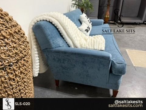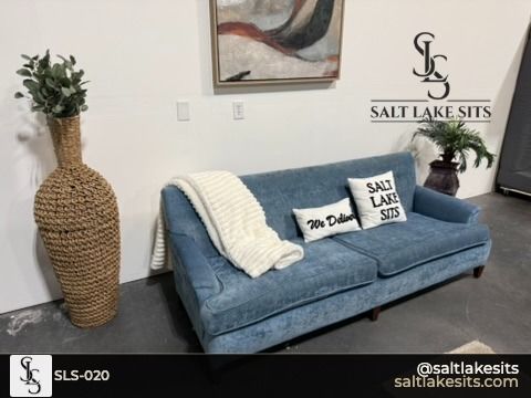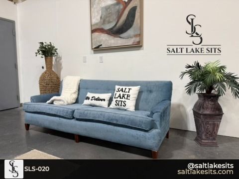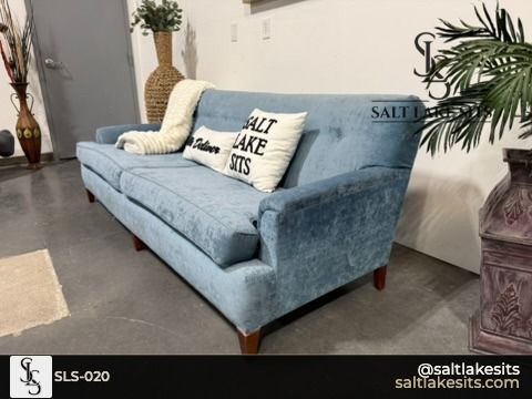 Your Price: $500 Vintage Sky Blue Velvet Sofa — This one has character. Beautiful dusty sky blue velvet with classic vintage silhouette and tapered wood legs. The kind of piece that makes a room. Good condition for its age, professionally cleaned. Dimensions in photos. Same day delivery available throughout Salt Lake City. SKU: SLS-020
