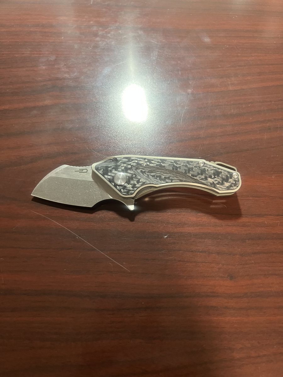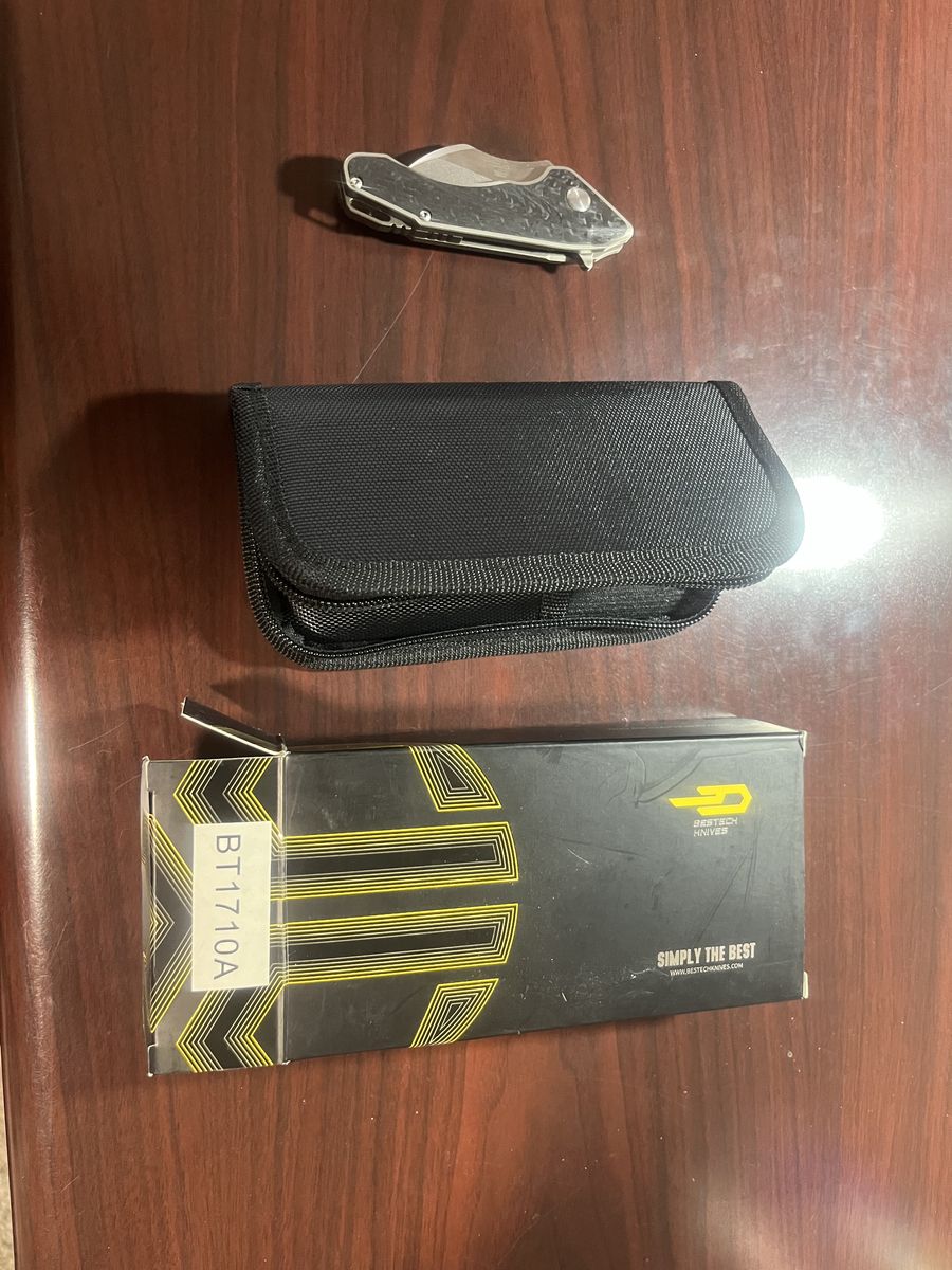 VenmoBestech Imp. Bought and carried once or twice. Has sat since then. I have the box, carry case and knife. There is the slightest wear on the pocket clip from the one or two times it was carried. fantastic little knife. S35VN steel with a carbon fiber and titanium handle.