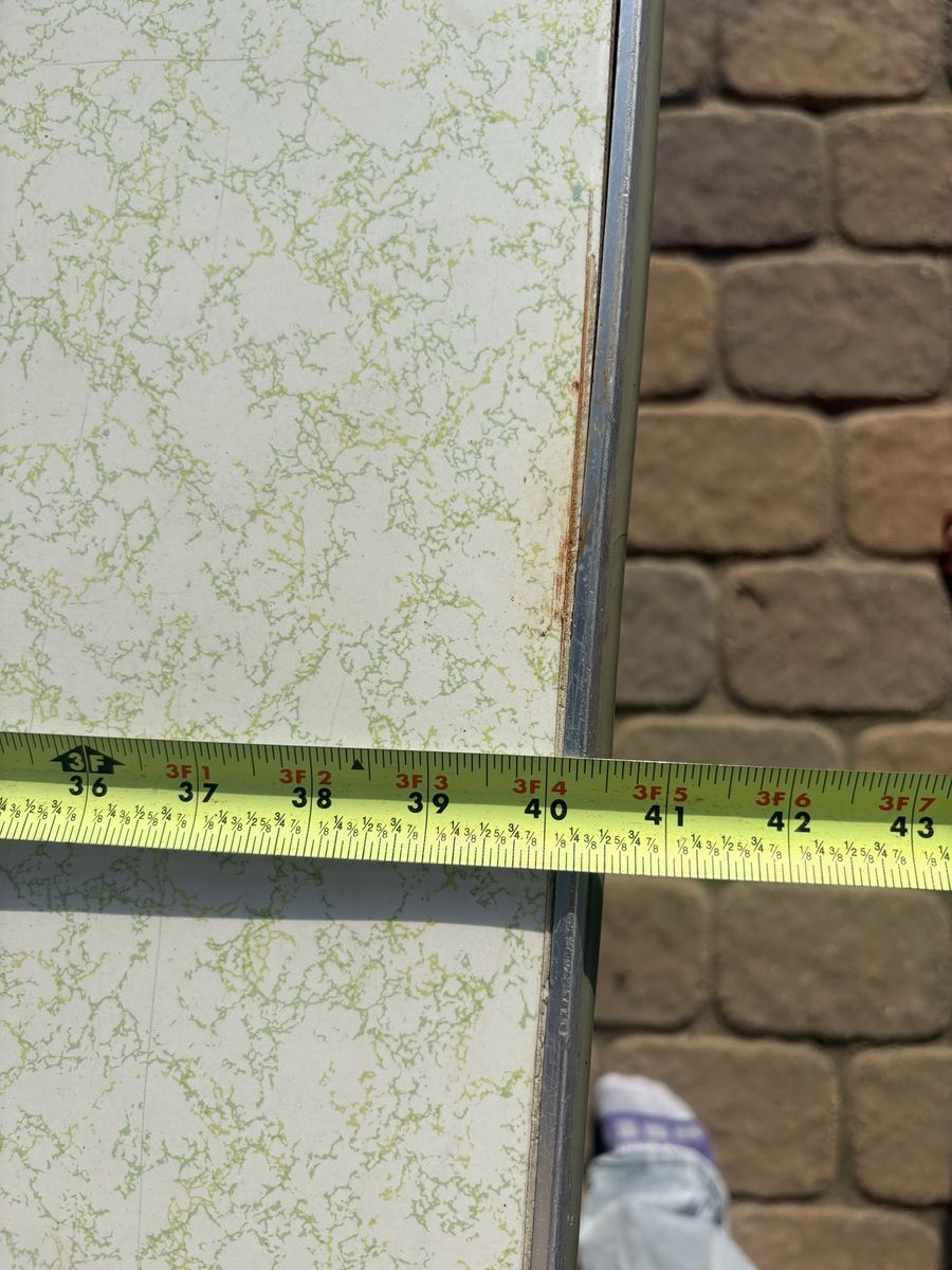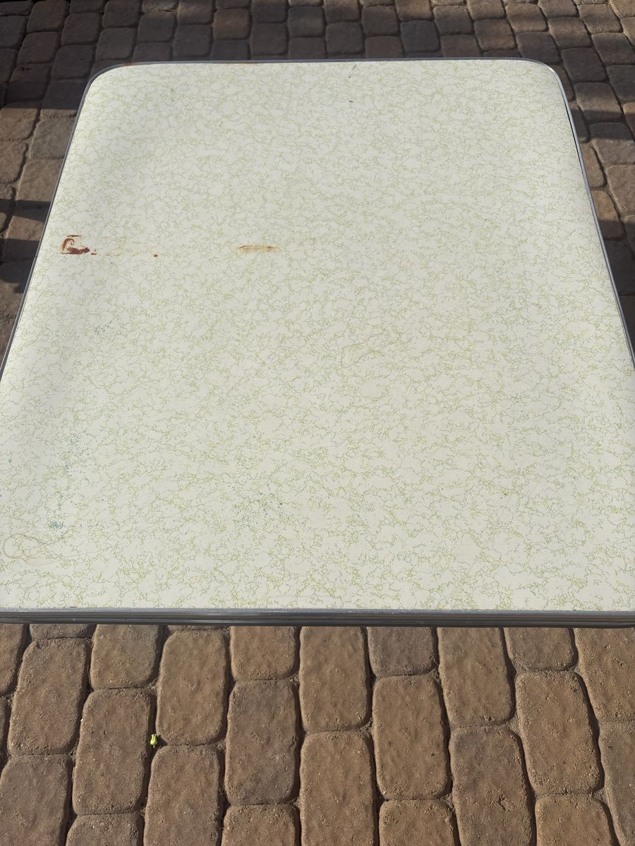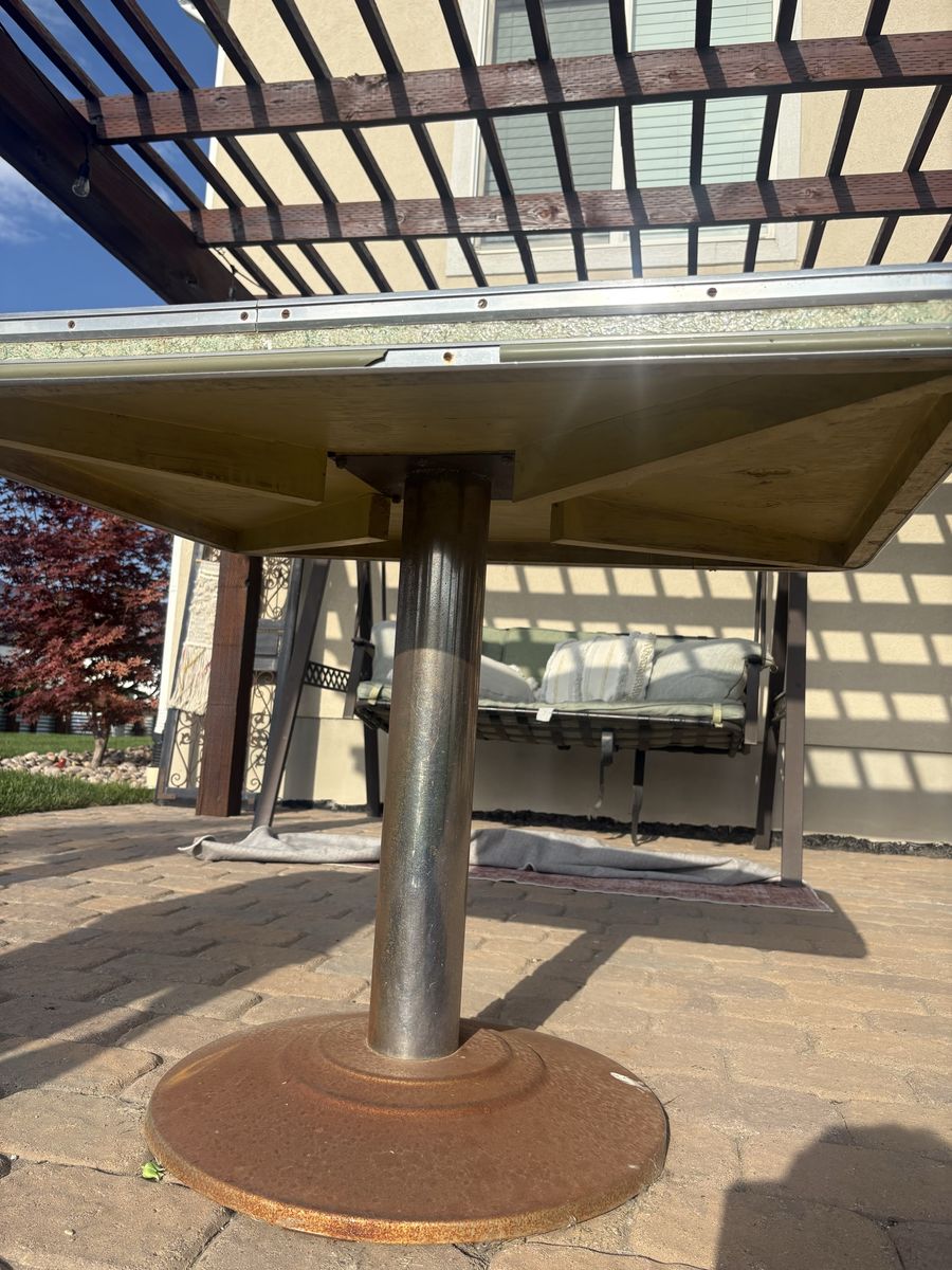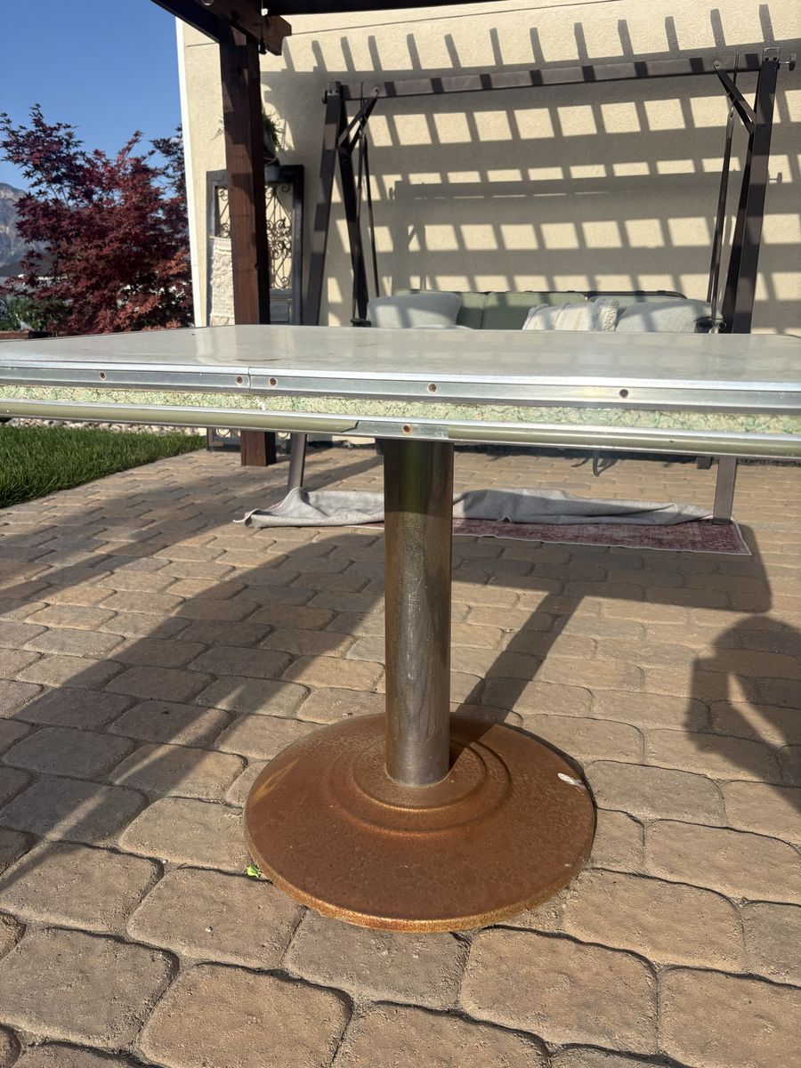 VenmoMetal patio table. Really heavy, but extremely sturdy table and doesn’t teeter. Has some slight rust but can be spray painted and made to look like new. Sizes are in the pictures