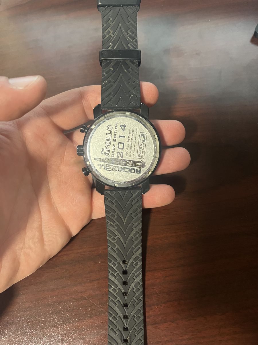 VenmoUnique limited edition Rockwell watch. Good looking and very unique watch. I have pretty slim wrists and as much as I would like to wear this watch it's just too big for my wrist. Has a fresh battery and in decent shape. Has a few little scratches from when I did wear it but nothing major. Has week and date markers.