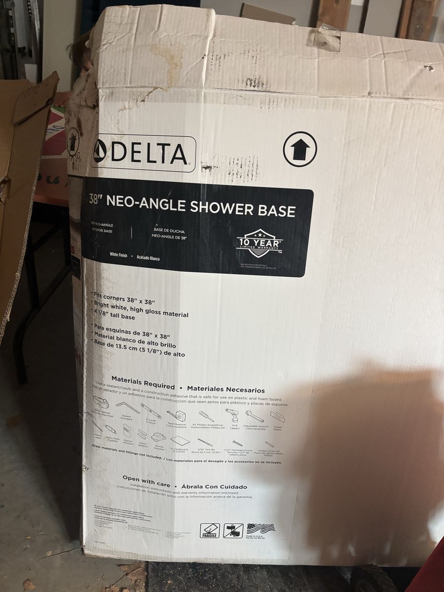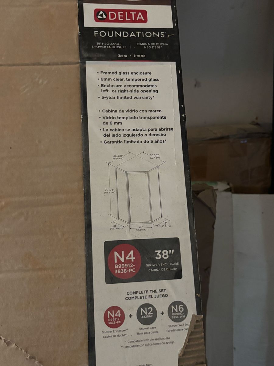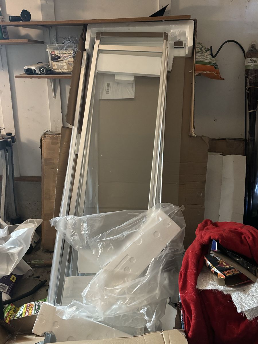 brand new shower, glass and base boxes have been opened, but none of them have been used. They don’t fit.