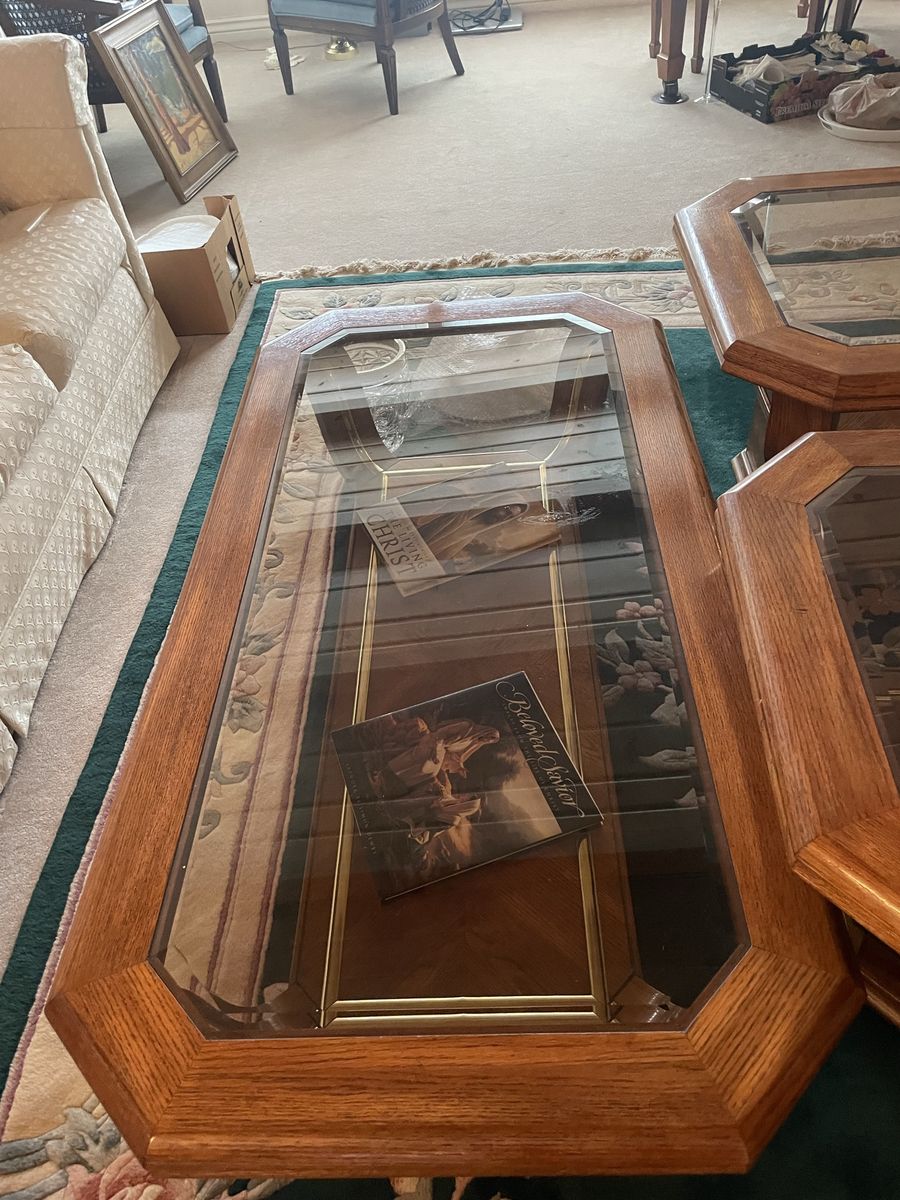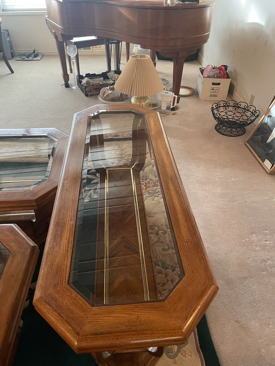 VenmoCredenza, coffee and two end tables in very good condition. Glass, brass trim and wood style. Hardly used and in very good shape