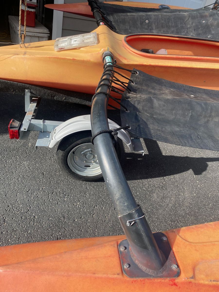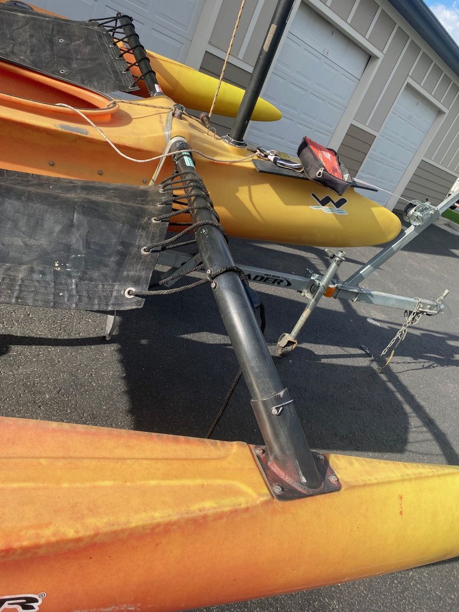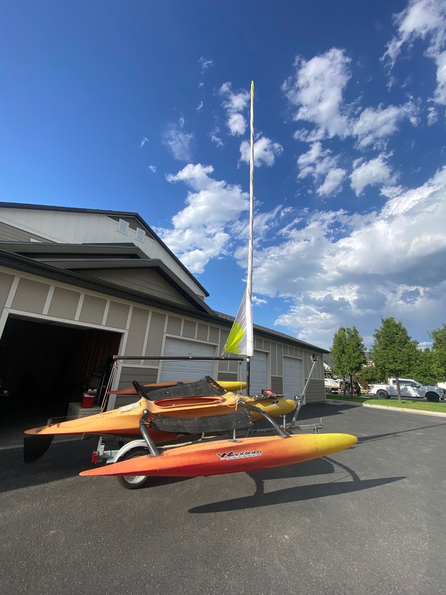 If you’re looking for an easy-to-rig, stable, fun sailboat that turns heads, this WindRider 16 trimaran is a great setup. I used it to teach myself to sail — easy to sail solo, and with the trampolines, up to 3 people can enjoy the experience.