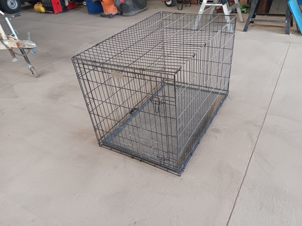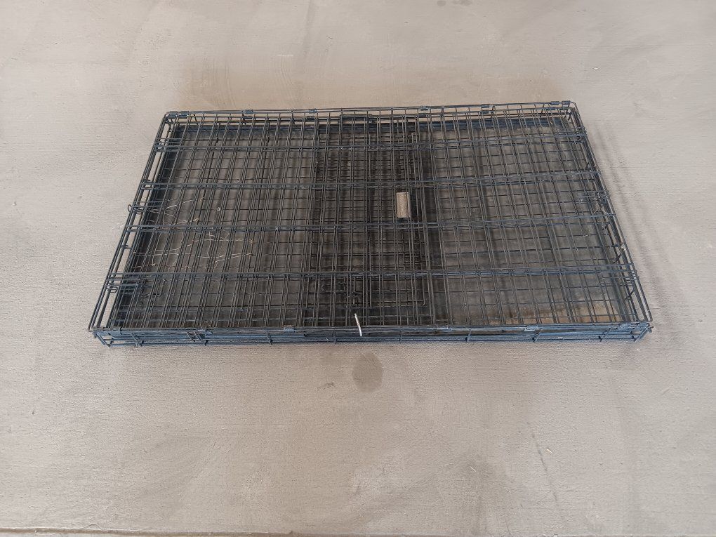 4 foot long by 30 inches wide by 32 inches tall. Folds for easy storage. Small repair on door.