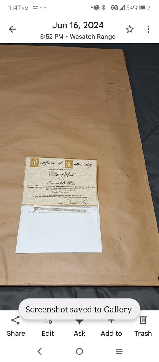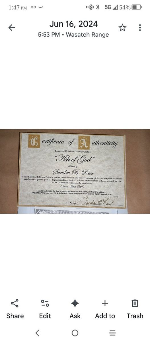VenmoThis is a limited edition and numbered Ask of God print of the painting. it comes with an amazing frame. retail price is about $800. I'm asking just $300. I accept cash or venmo. text me at 385-497-0522 if interested.