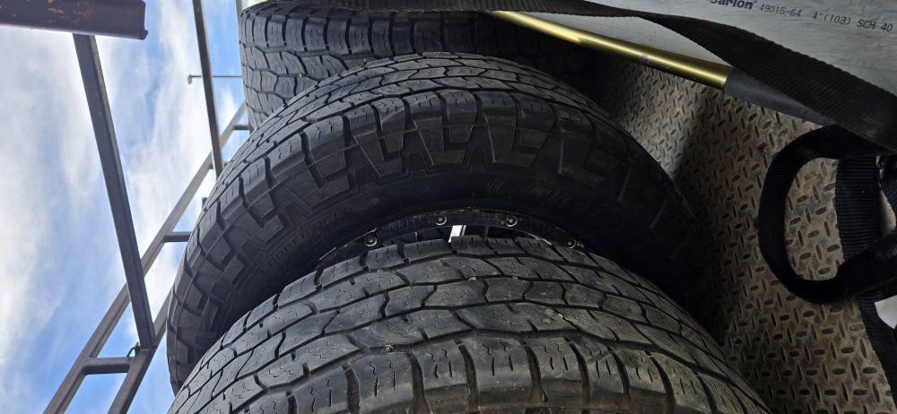 Have 285/60R 20 Cooper discoverer AT3s. Load range E with 125 load rating. Good tread left. They do have some peeling around the edges but overall still clean up nice. Also have brand new center caps.