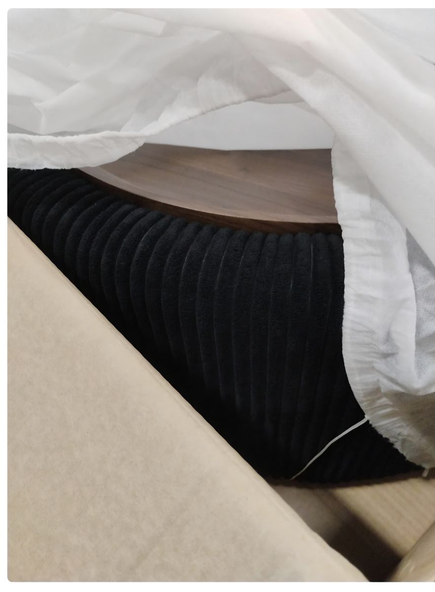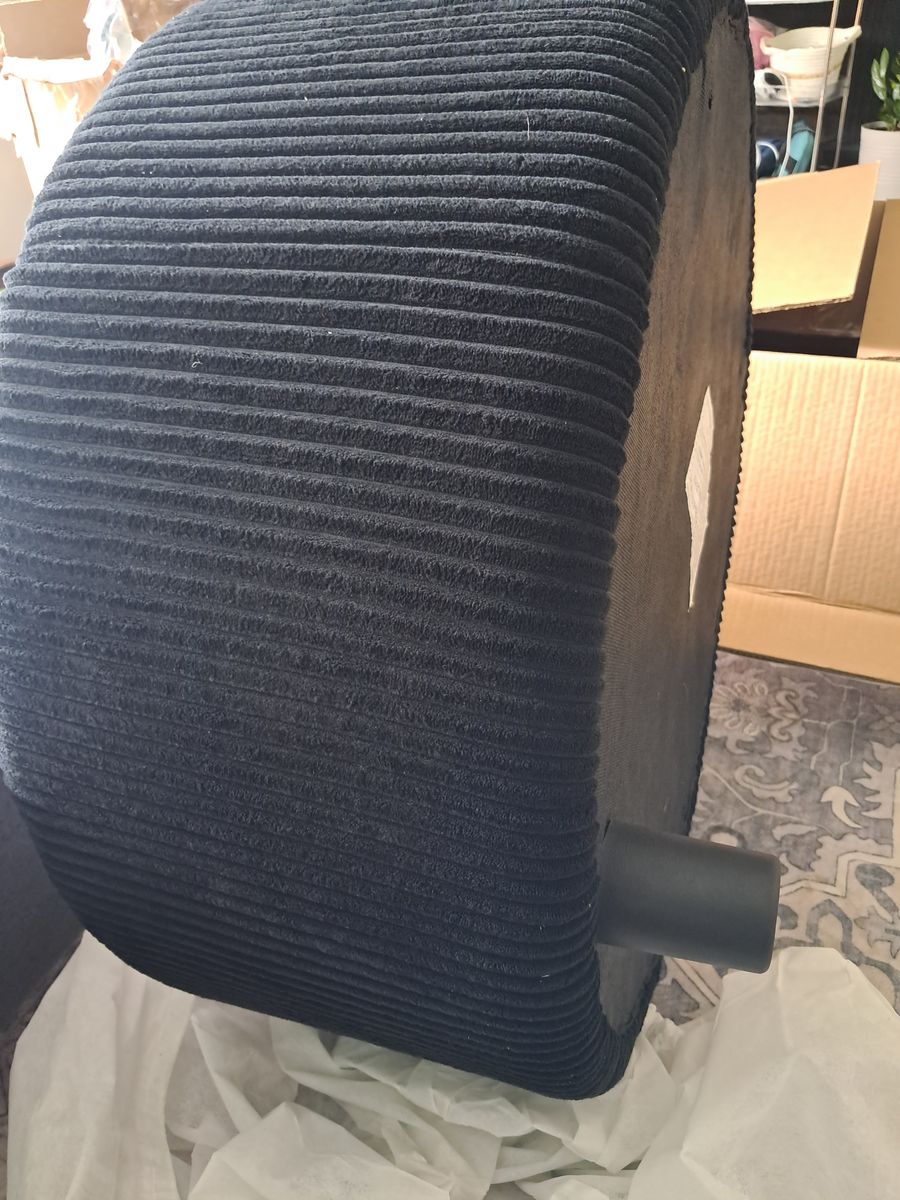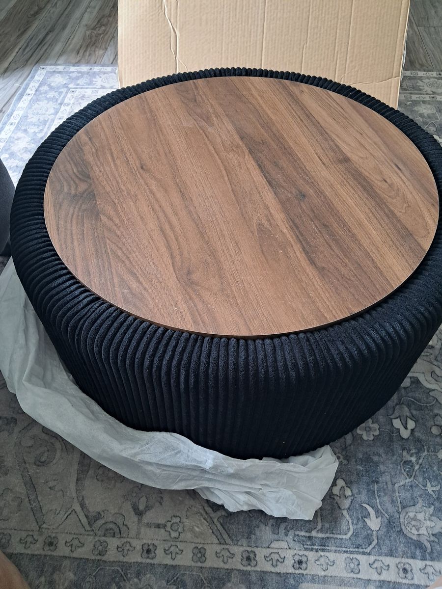 Stylish round ottoman. Black ribbed texture with a cool wood tray top. Super versatile, use as coffee table or extra seating. Tray top removable. NEW FROM wayfair. $140 OBO