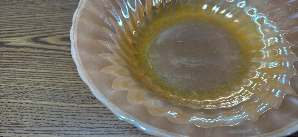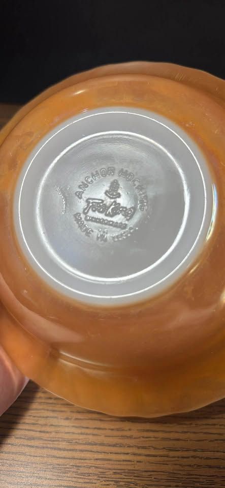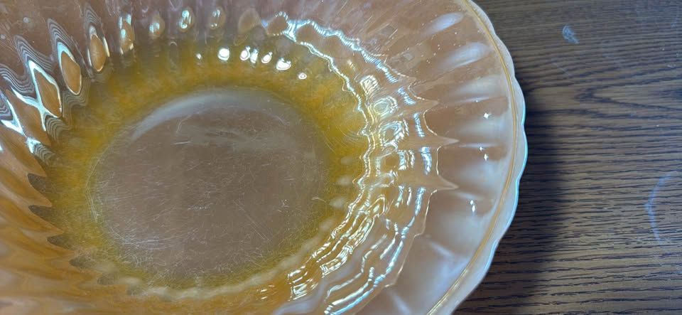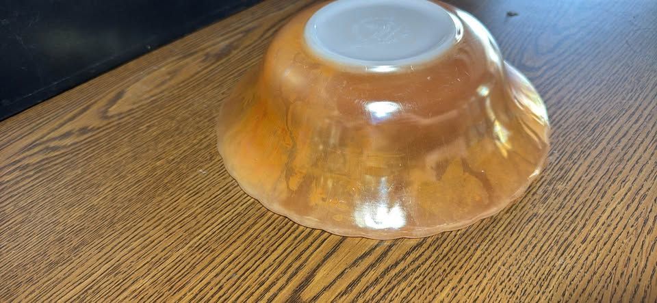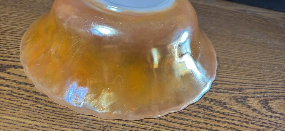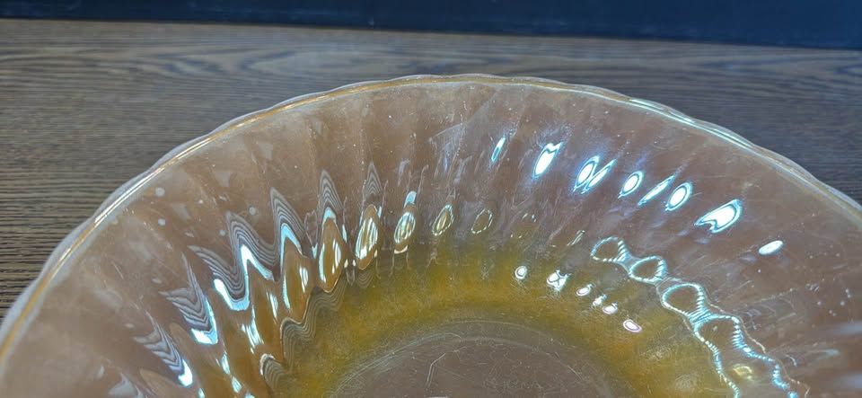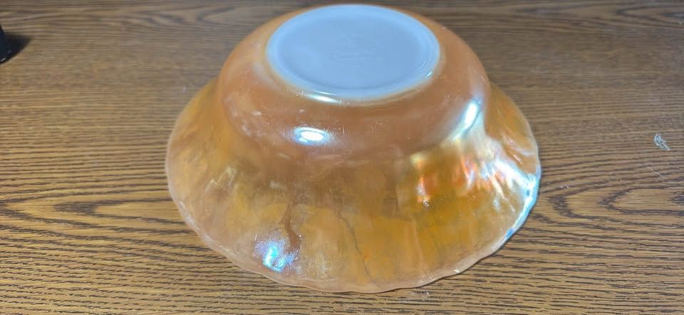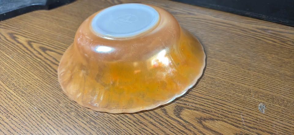 PayPalVintage iridescent glass bowl about 8 inches in diameter. Has pretty peachy orange color and a wavy edge design. Ribbed pattern on sides. Some light scratches but no chips. Nice piece for display or use.