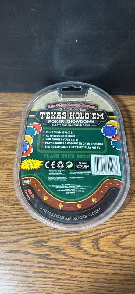 PayPalNew Texas Hold'em Poker Showdown electronic handheld game! Fun sound effects and auto score keeping. Play against 3 computer card sharks. Comes with 2 AG13 button cells included. For ages 8+.