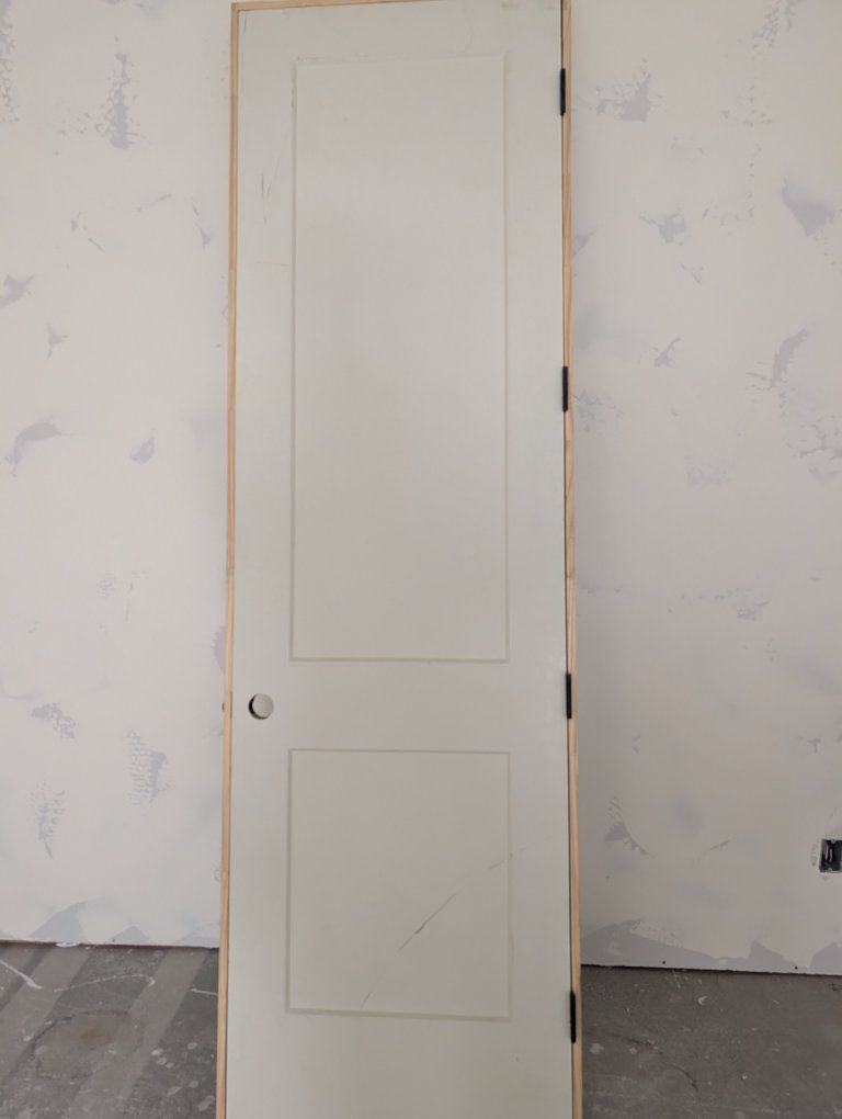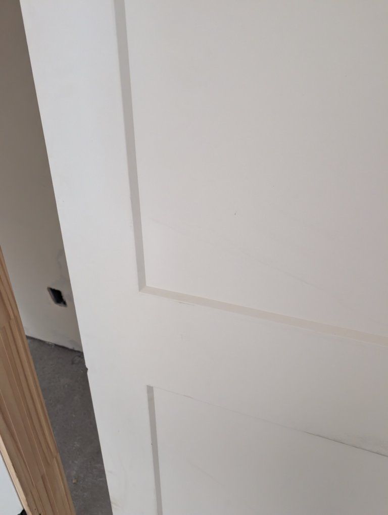 new door with a few places where primer has rubbed off. This door has not been previously hung.
