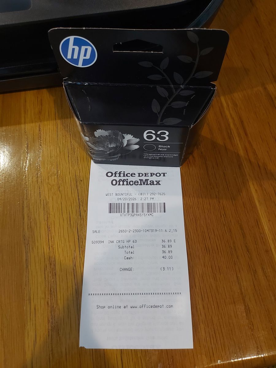A brand new black ink cartridge was just purchased on April 20th ($37), so it's ready to use right away.