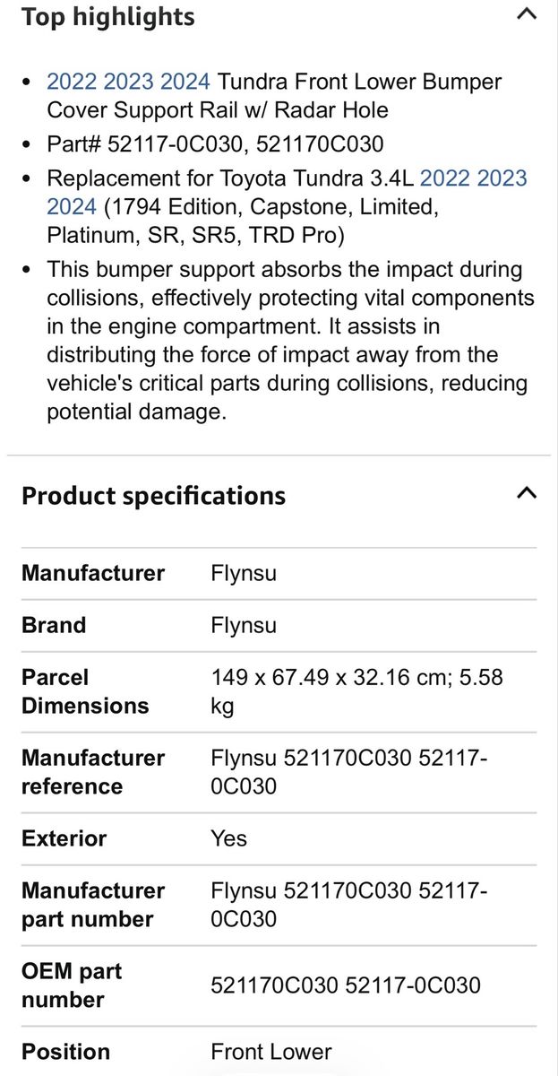 Zelle52117-0C030 Front Lower Bumper Cover Support Rail w/Radar Hole Replacement for Toyota Tundra 3.4L 2022 2023 2024
