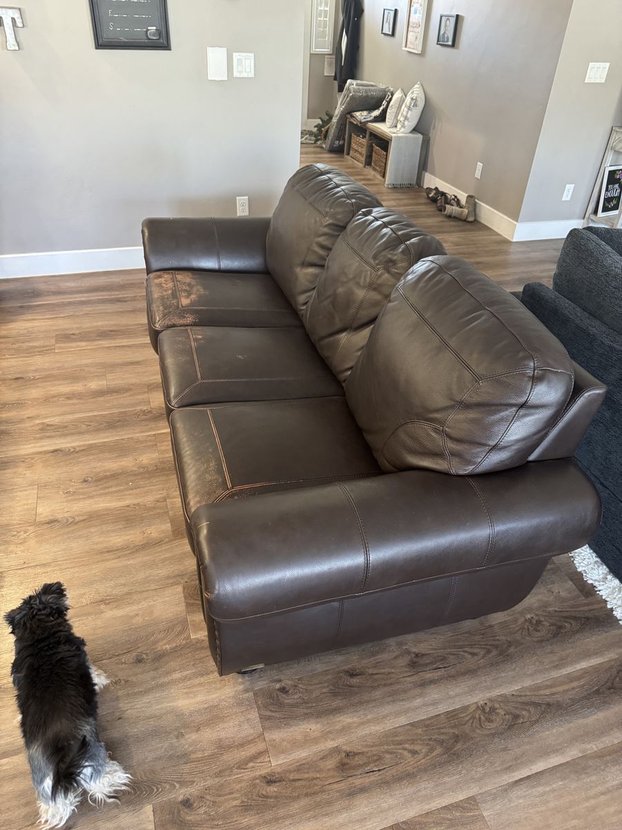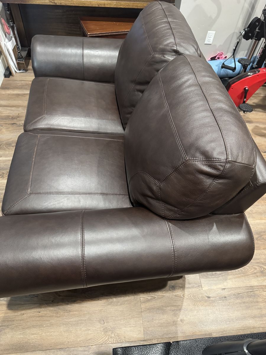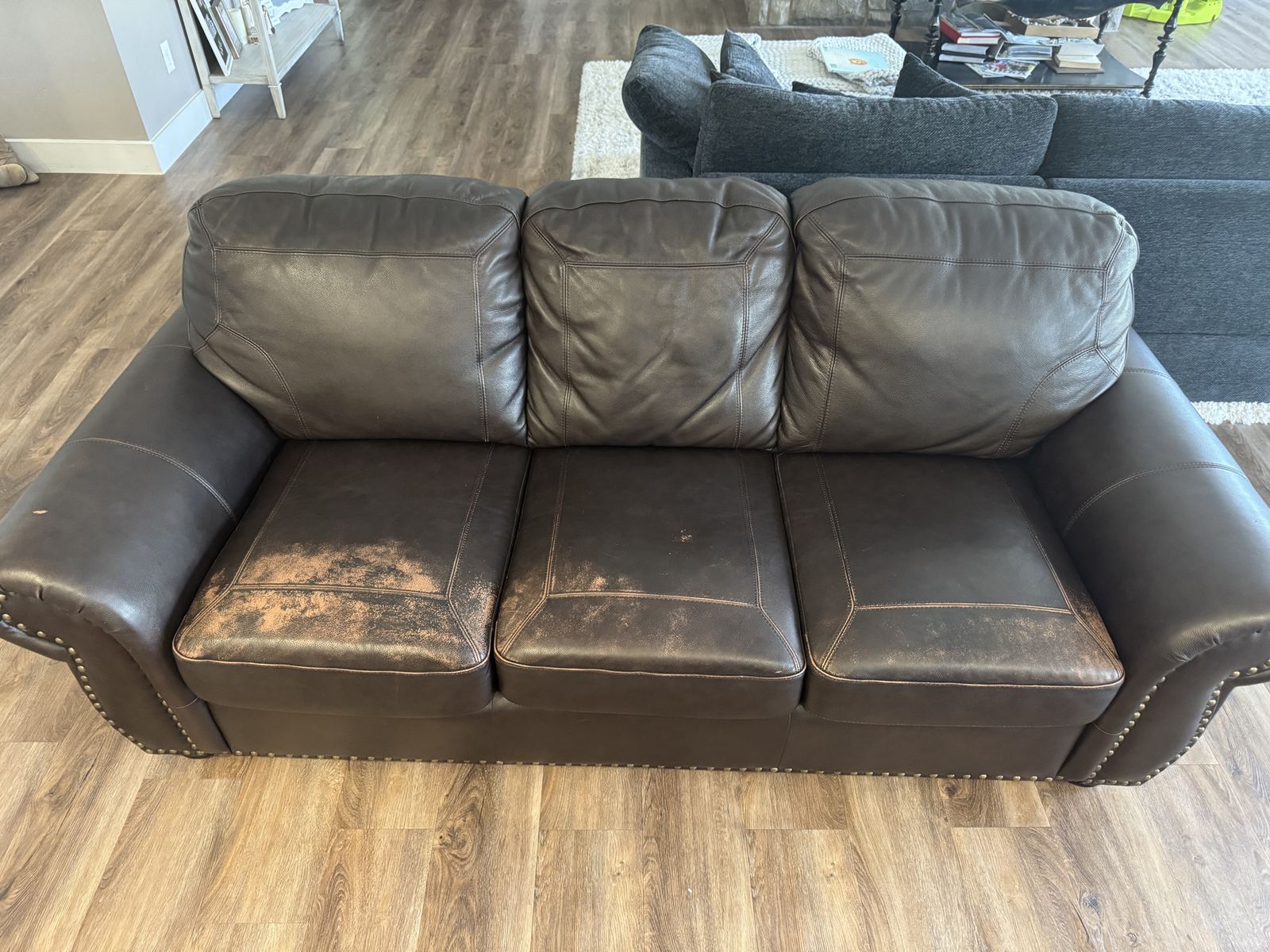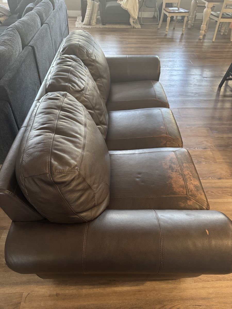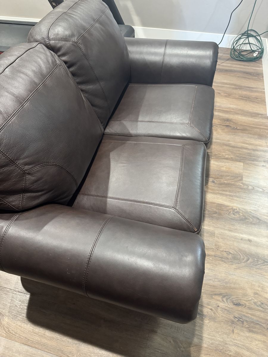 ZelleBrown Leather Set 700 OBO - Bought from Costco about 8 years ago. Color fade on the couch, love seat is good. Still very cushy. Can sell separately or as set. 400 for couch 400 for live seat or 700 for set.