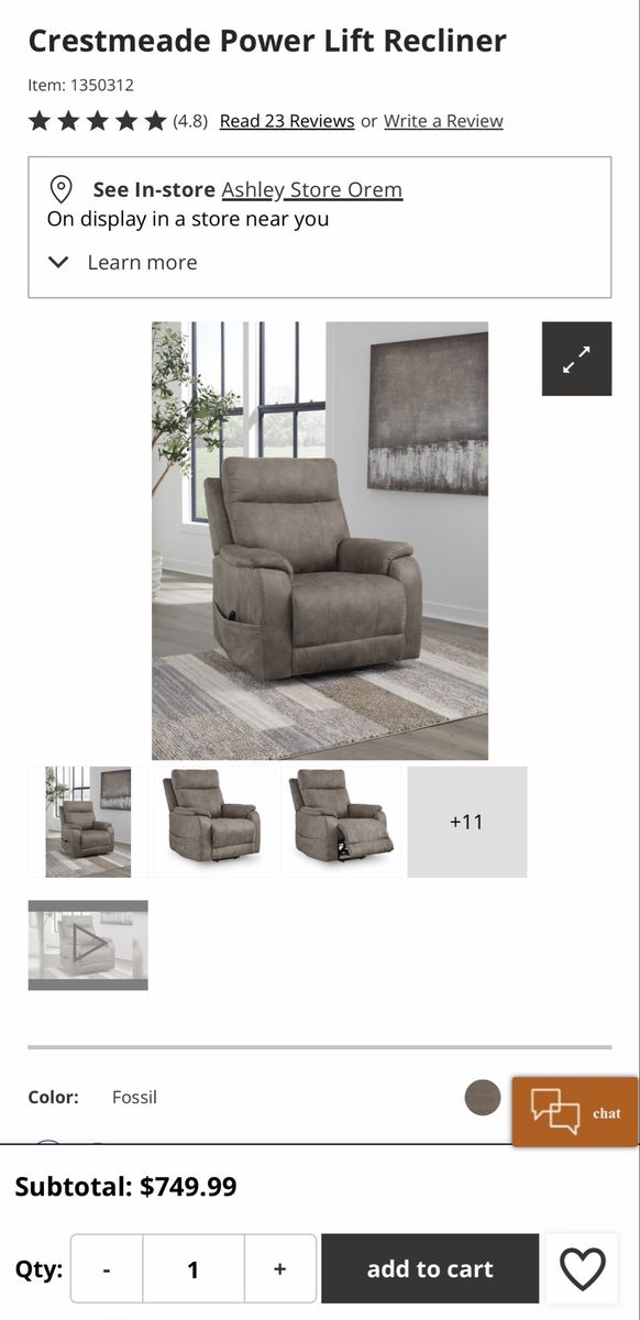 ApplePayDual motor Power lift chair with heat and massage like new from Ashley’s furniture The color is gray not brown like the photos look Everything works Great for post operation surgery, recovery, or elderly assistance